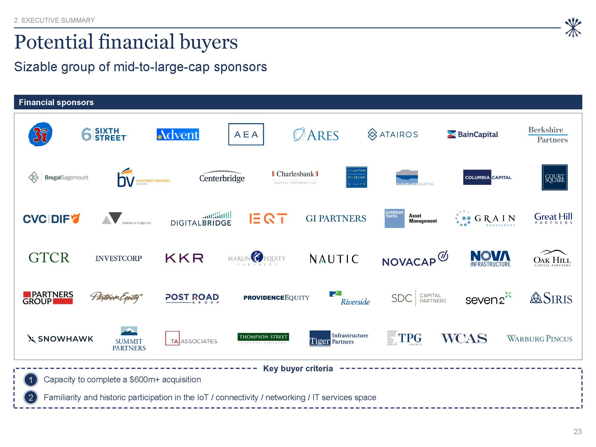 Financial sponsors  Potential financial buyers  Sizable group of mid-to-large-cap sponsors  1 Capacity to complete a $600m+ acquisition  2 Familiarity and historic participation in the IoT / connectivity / networking / IT services space  Key buyer criteria  2. EXECUTIVE SUMMARY  23