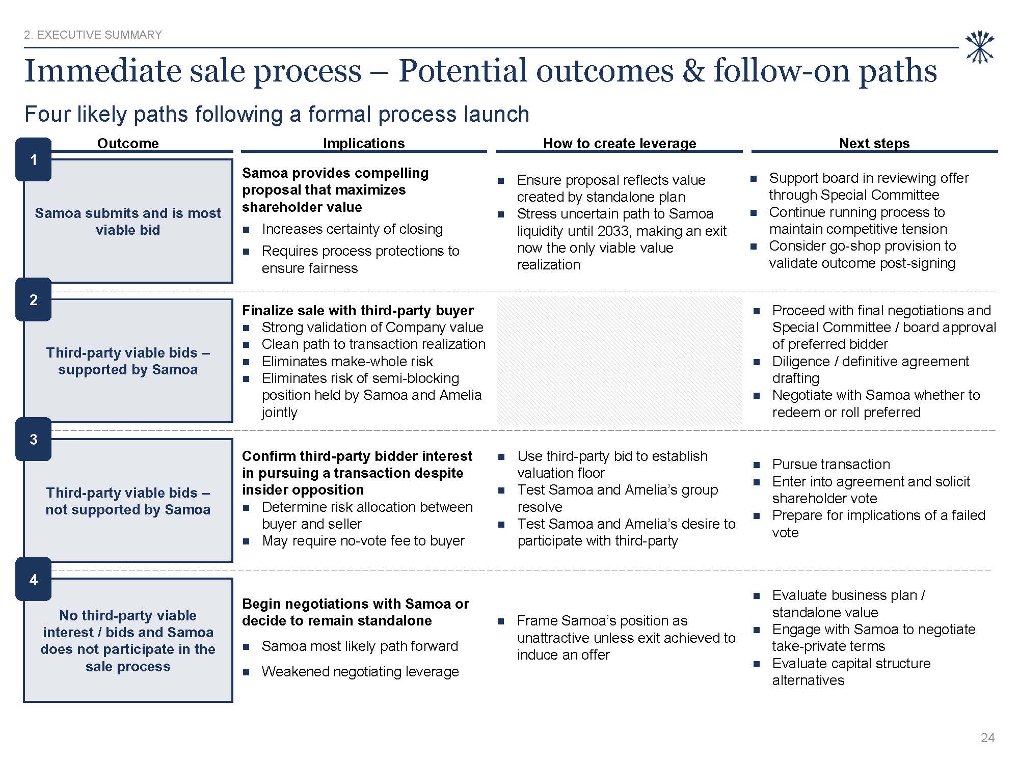 Third-party viable bids – not supported by Samoa  Immediate sale process – Potential outcomes & follow-on paths  Four likely paths following a formal process launch  No third-party viable interest / bids and Samoa does not participate in the sale process  Third-party viable bids – supported by Samoa  Begin negotiations with Samoa or decide to remain standalone  Samoa most likely path forward  Weakened negotiating leverage  Confirm third-party bidder interest in pursuing a transaction despite insider opposition  Determine risk allocation between buyer and seller  May require no-vote fee to buyer  Finalize sale with third-party buyer  Strong validation of Company value  Clean path to transaction realization  Eliminates make-whole risk  Eliminates risk of semi-blocking position held by Samoa and Amelia jointly  Evaluate business plan / standalone value  Engage with Samoa to negotiate take-private terms  Evaluate capital structure  alternatives  Pursue transaction  Enter into agreement and solicit shareholder vote  Prepare for implications of a failed vote  Proceed with final negotiations and Special Committee / board approval of preferred bidder  Diligence / definitive agreement  drafting  Negotiate with Samoa whether to redeem or roll preferred  Frame Samoa’s position as unattractive unless exit achieved to induce an offer  Use third-party bid to establish  valuation floor  Test Samoa and Amelia’s group resolve  Test Samoa and Amelia’s desire to participate with third-party  Samoa submits and is most viable bid  Samoa provides compelling proposal that maximizes shareholder value  Increases certainty of closing  Requires process protections to ensure fairness  Support board in reviewing offer through Special Committee  Continue running process to maintain competitive tension  Consider go-shop provision to validate outcome post-signing  2  3  Outcome Implications How to create leverage Next steps   1  4  Ensure proposal reflects value created by standalone plan  Stress uncertain path to Samoa liquidity until 2033, making an exit now the only viable value realization  2. EXECUTIVE SUMMARY  24