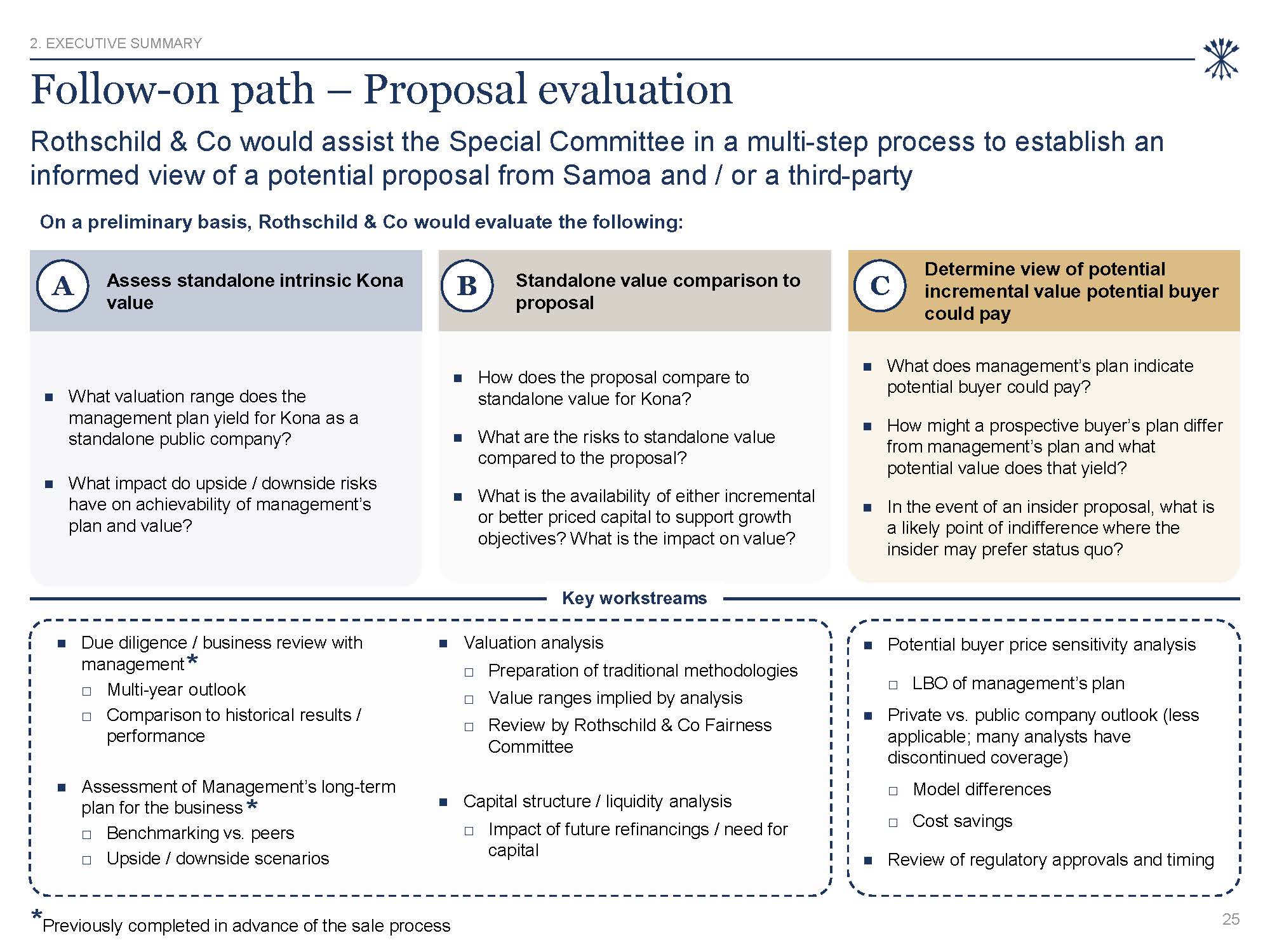 Follow-on path – Proposal evaluation  Rothschild & Co would assist the Special Committee in a multi-step process to establish an  informed view of a potential proposal from Samoa and / or a third-party  On a preliminary basis, Rothschild & Co would evaluate the following:  What valuation range does the management plan yield for Kona as a standalone public company?  What impact do upside / downside risks have on achievability of management’s plan and value?  How does the proposal compare to standalone value for Kona?  What are the risks to standalone value compared to the proposal?  What is the availability of either incremental or better priced capital to support growth objectives? What is the impact on value?  What does management’s plan indicate potential buyer could pay?  How might a prospective buyer’s plan differ from management’s plan and what potential value does that yield?  In the event of an insider proposal, what is a likely point of indifference where the insider may prefer status quo?  Assess standalone intrinsic Kona  value  Standalone value comparison to  proposal  Determine view of potential  C incremental value potential buyer  could pay  A B  Potential buyer price sensitivity analysis  LBO of management’s plan  Private vs. public company outlook (less applicable; many analysts have discontinued coverage)  Model differences  Cost savings  Review of regulatory approvals and timing  Valuation analysis  Preparation of traditional methodologies  Value ranges implied by analysis  Review by Rothschild & Co Fairness Committee  Capital structure / liquidity analysis  □ Impact of future refinancings / need for capital  Due diligence / business review with management*  Multi-year outlook  Comparison to historical results /  performance  Assessment of Management’s long-term plan for the business *  Benchmarking vs. peers  Upside / downside scenarios  Key workstreams  *Previously completed in advance of the sale process  2. EXECUTIVE SUMMARY  25