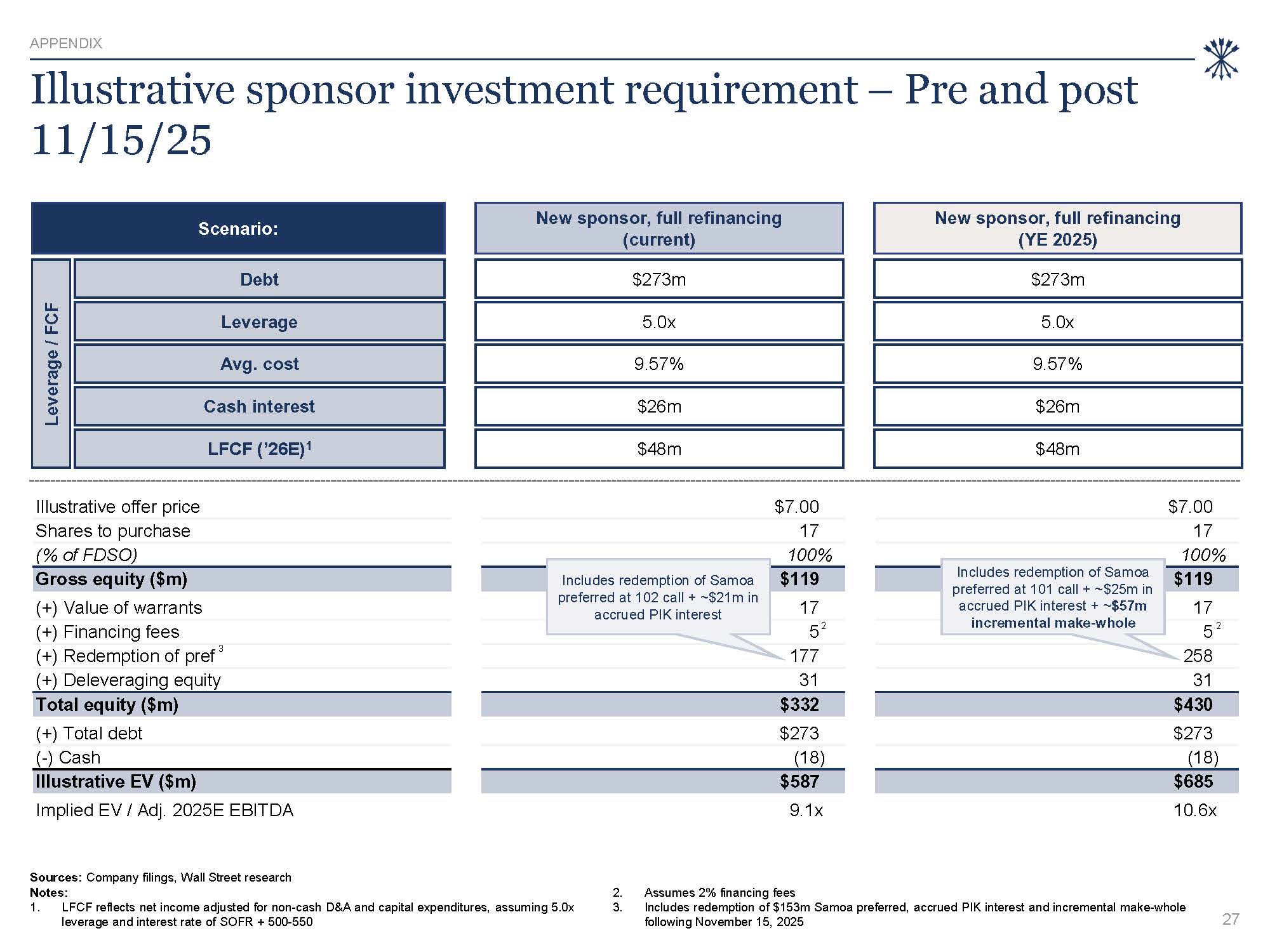 Illustrative offer price  $7.00  $7.00  Shares to purchase  17  17  (% of FDSO)  100%  100%  Gross equity ($m)  $119  17  $119  17  (+) Value of warrants  177  258  (+) Financing fees  (+) Redemption of pref 3  52  5 2  Illustrative sponsor investment requirement – Pre and post 11/15/25  Scenario:  Leverage / FCF  Debt  Leverage  Avg. cost  Cash interest  LFCF (’26E)1  1. LFCF reflects net income adjusted for non-cash D&A and capital expenditures, assuming 5.0x leverage and interest rate of SOFR + 500-550  (+) Deleveraging equity  31  31  Total equity ($m)  $332  $430  (+) Total debt  $273  $273  (-) Cash  (18)  (18)  Illustrative EV ($m)  $587  $685  Implied EV / Adj. 2025E EBITDA  9.1x  10.6x  Sources: Company filings, Wall Street research  Notes:  2.  Assumes 2% financing fees  3. Includes redemption of $153m Samoa preferred, accrued PIK interest and incremental make-whole following November 15, 2025  New sponsor, full refinancing (current)  $273m  5.0x  9.57%  $26m  $48m  New sponsor, full refinancing (YE 2025)  $273m  5.0x  9.57%  $26m  $48m  Includes redemption of Samoa preferred at 102 call + ~$21m in accrued PIK interest  Includes redemption of Samoa preferred at 101 call + ~$25m in accrued PIK interest + ~$57m incremental make-whole  APPENDIX  27