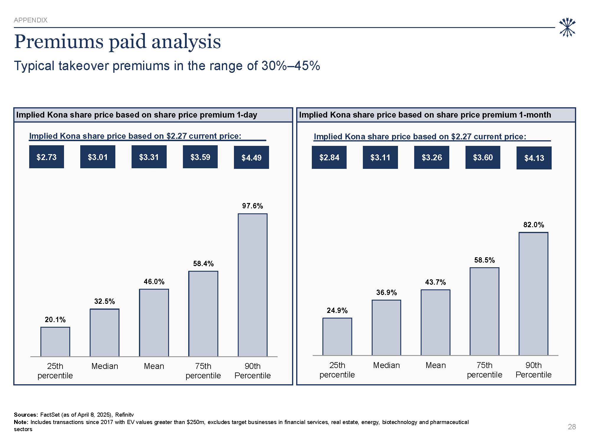 Premiums paid analysis  Typical takeover premiums in the range of 30%–45%  Implied Kona share price based on share price premium 1-day  $2.73  $3.31  $3.01  $3.59  Implied Kona share price based on $2.27 current price:   $4.49  Sources: FactSet (as of April 8, 2025), Refinitv  Note: Includes transactions since 2017 with EV values greater than $250m, excludes target businesses in financial services, real estate, energy, biotechnology and pharmaceutical sectors  20.1%  32.5%  46.0%  58.4%  97.6%  25th percentile  Median  Mean  75th percentile  90th Percentile  Chart Title  Implied Kona share price based on share price premium 1-month  Implied Kona share price based on $2.27 current price:   $2.84  $3.11  $3.60  $4.13  24.9%  36.9%  43.7%  58.5%  82.0%  25th  percentile  Median  Mean  75th  percentile  90th  Percentile  Chart Title  $3.26  APPENDIX  28