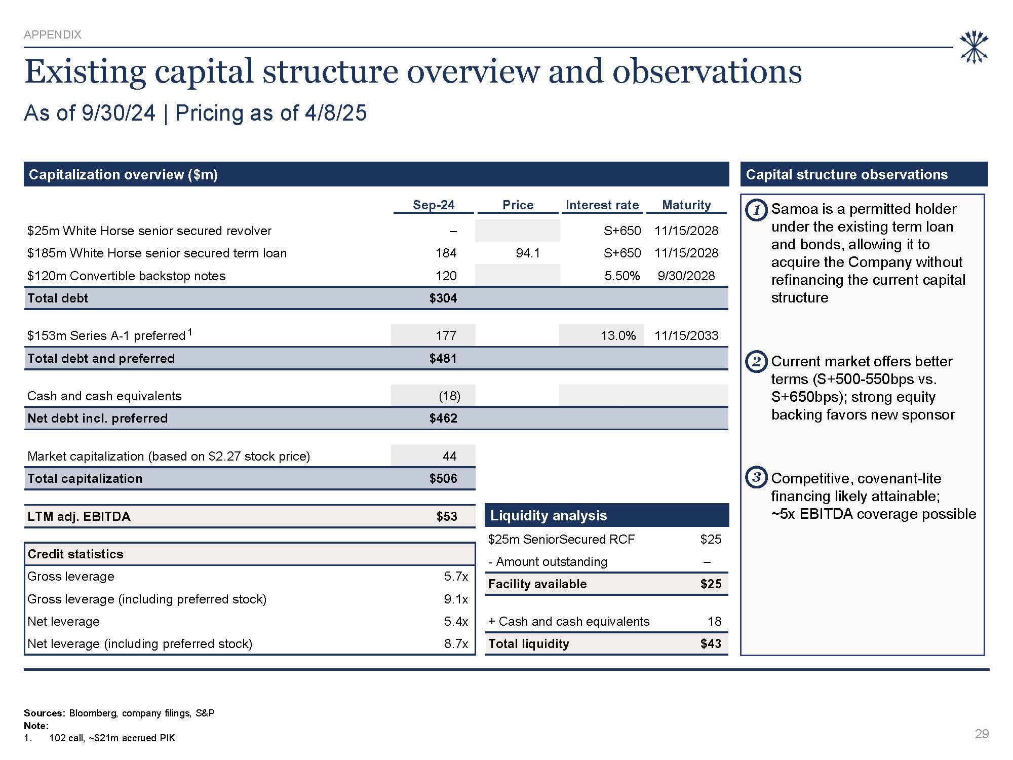 $25m White Horse senior secured revolver  –  S+650  11/15/2028  $185m White Horse senior secured term loan  184  94.1  S+650  11/15/2028  $120m Convertible backstop notes  120  5.50%  9/30/2028  Total debt  $304  $153m Series A-1 preferred 1  177  13.0%  11/15/2033  Total debt and preferred  $481  Cash and cash equivalents  (18)  Net debt incl. preferred  $462  Market capitalization (based on $2.27 stock price)  44  Total capitalization  $506  Credit statistics  Gross leverage  5.7x  Gross leverage (including preferred stock)  9.1x  Net leverage  5.4x  Net leverage (including preferred stock)  8.7x   Sep-24 Price Interest rate Maturity   LTM adj. EBITDA $53  Existing capital structure overview and observations  As of 9/30/24 | Pricing as of 4/8/25  Capitalization overview ($m)  Capital structure observations  Sources: Bloomberg, company filings, S&P  Note:  1. 102 call, ~$21m accrued PIK  Liquidity analysis  $25m SeniorSecured RCF $25  - Amount outstanding –  Facility available $25  + Cash and cash equivalents 18  Total liquidity $43  1 Samoa is a permitted holder under the existing term loan and bonds, allowing it to acquire the Company without refinancing the current capital structure  2 Current market offers better  terms (S+500-550bps vs. S+650bps); strong equity backing favors new sponsor  3 Competitive, covenant-lite financing likely attainable;  ~5x EBITDA coverage possible  APPENDIX  29