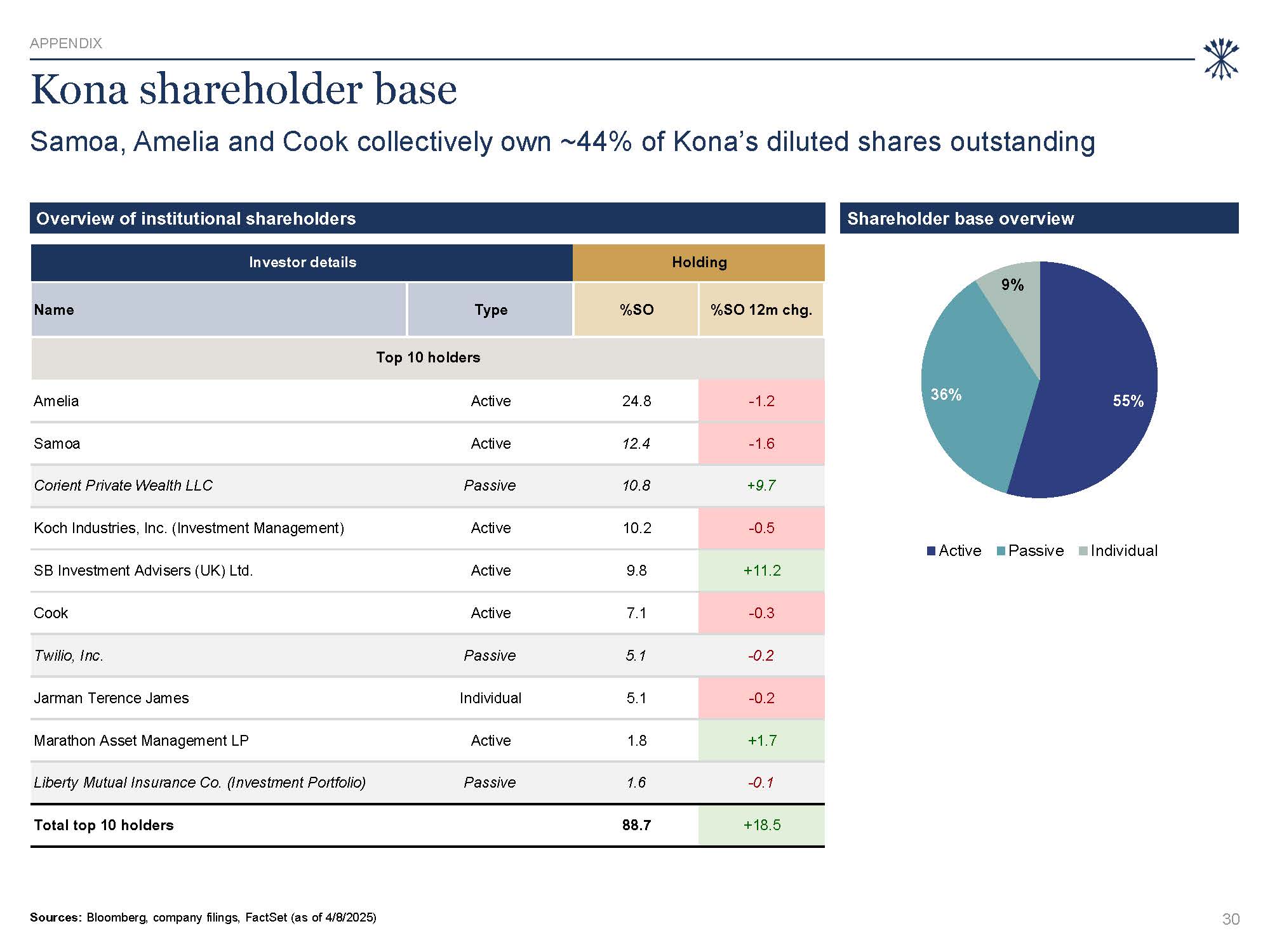 55%  36%  9%  Active  Passive  Individual  Kona shareholder base  Sources: Bloomberg, company filings, FactSet (as of 4/8/2025)  Shareholder base overview  Samoa, Amelia and Cook collectively own ~44% of Kona’s diluted shares outstanding  HS to re  flash  Overview of institutional shareholders  Investor details  Holding  Name  Type  %SO  %SO 12m chg.  Top 10 holders  Amelia  Active  24.8  -1.2  Samoa  Active  12.4  -1.6  Corient Private Wealth LLC  Passive  10.8  +9.7  Koch Industries, Inc. (Investment Management)  Active  10.2  -0.5  SB Investment Advisers (UK) Ltd.  Active  9.8  +11.2  Cook  Active  7.1  -0.3  Twilio, Inc.  Passive  5.1  -0.2  Jarman Terence James  Individual  5.1  -0.2  Marathon Asset Management LP  Active  1.8  +1.7  Liberty Mutual Insurance Co. (Investment Portfolio)  Passive  1.6  -0.1  Total top 10 holders  88.7  +18.5  APPENDIX  30