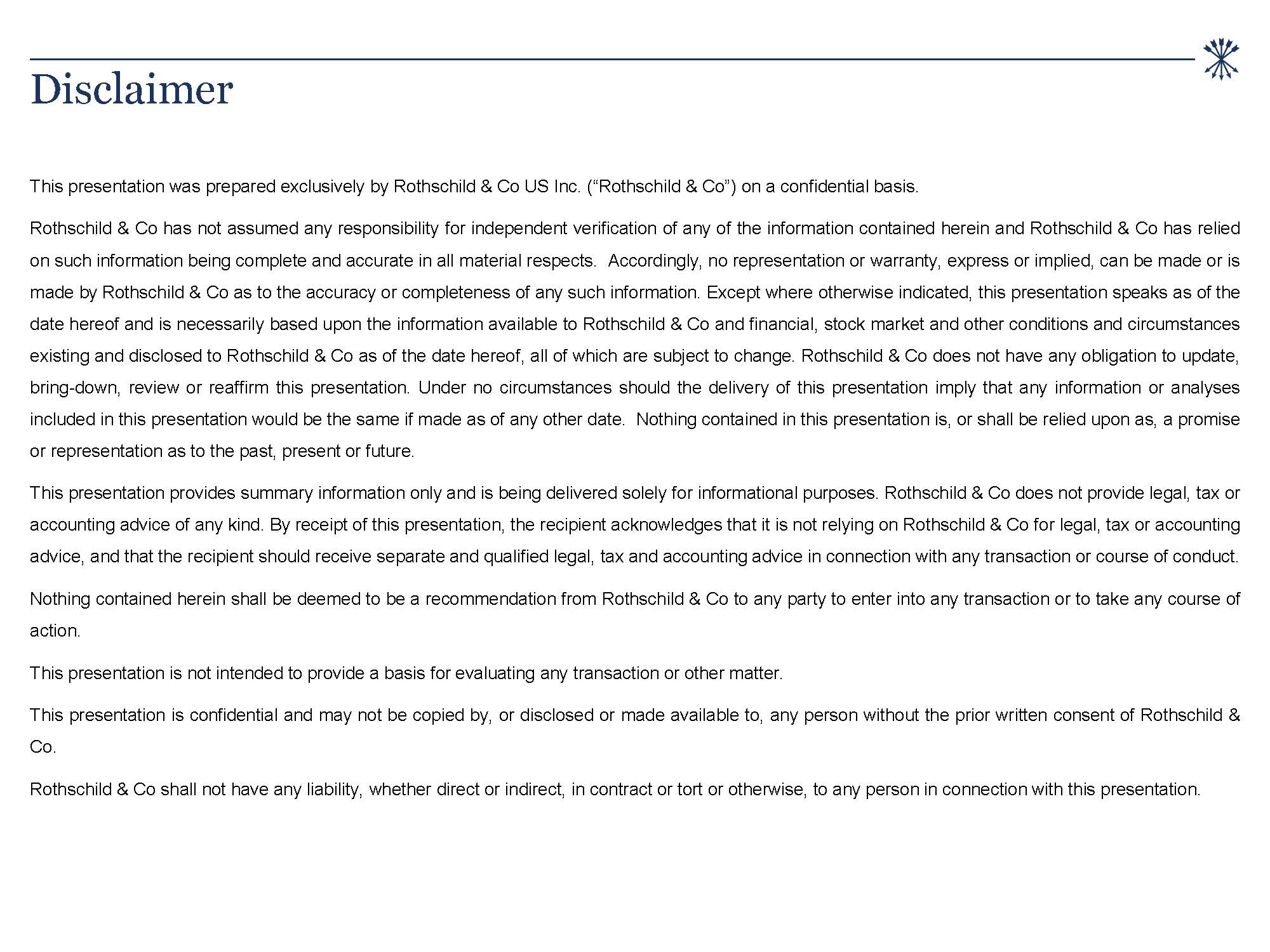 Disclaimer  This presentation was prepared exclusively by Rothschild & Co US Inc. (“Rothschild & Co”) on a confidential basis.  Rothschild & Co has not assumed any responsibility for independent verification of any of the information contained herein and Rothschild & Co has relied on such information being complete and accurate in all material respects. Accordingly, no representation or warranty, express or implied, can be made or is made by Rothschild & Co as to the accuracy or completeness of any such information. Except where otherwise indicated, this presentation speaks as of the date hereof and is necessarily based upon the information available to Rothschild & Co and financial, stock market and other conditions and circumstances existing and disclosed to Rothschild & Co as of the date hereof, all of which are subject to change. Rothschild & Co does not have any obligation to update, bring-down, review or reaffirm this presentation. Under no circumstances should the delivery of this presentation imply that any information or analyses included in this presentation would be the same if made as of any other date. Nothing contained in this presentation is, or shall be relied upon as, a promise or representation as to the past, present or future.  This presentation provides summary information only and is being delivered solely for informational purposes. Rothschild & Co does not provide legal, tax or accounting advice of any kind. By receipt of this presentation, the recipient acknowledges that it is not relying on Rothschild & Co for legal, tax or accounting advice, and that the recipient should receive separate and qualified legal, tax and accounting advice in connection with any transaction or course of conduct.  Nothing contained herein shall be deemed to be a recommendation from Rothschild & Co to any party to enter into any transaction or to take any course of action.  This presentation is not intended to provide a basis for evaluating any transaction or other matter.  This presentation is confidential and may not be copied by, or disclosed or made available to, any person without the prior written consent of Rothschild & Co.  Rothschild & Co shall not have any liability, whether direct or indirect, in contract or tort or otherwise, to any person in connection with this presentation.
