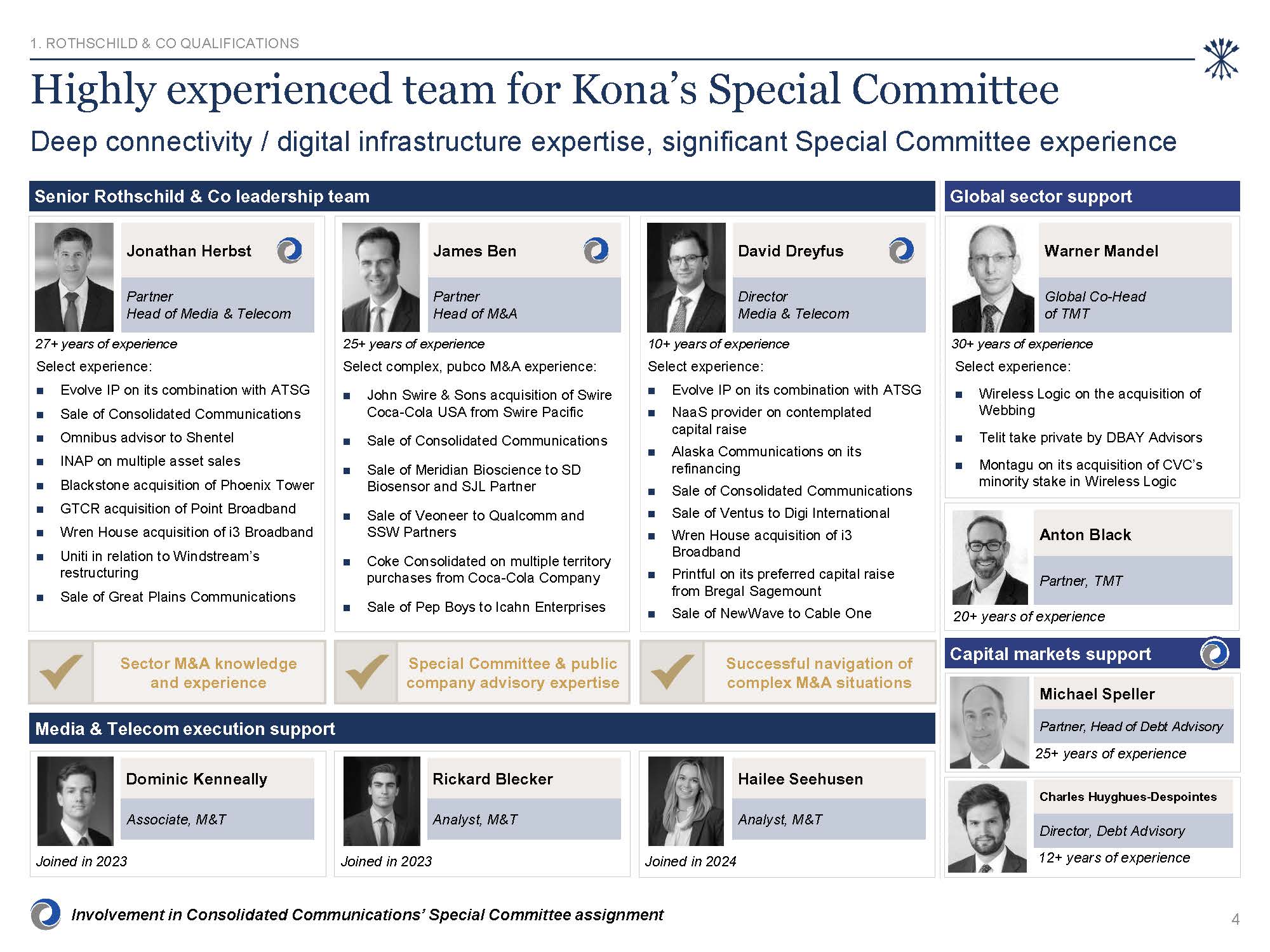 Highly experienced team for Kona’s Special Committee  Deep connectivity / digital infrastructure expertise, significant Special Committee experience  Involvement in Consolidated Communications’ Special Committee assignment  Media & Telecom execution support  Sector M&A knowledge and experience  Special Committee & public company advisory expertise  Successful navigation of complex M&A situations  Dominic Kenneally  Associate, M&T  Joined in 2023  Rickard Blecker  Analyst, M&T  Joined in 2023  Hailee Seehusen  Analyst, M&T  Joined in 2024  Senior Rothschild & Co leadership team  Jonathan Herbst  Partner  Head of Media & Telecom  27+ years of experience  Select experience:  Evolve IP on its combination with ATSG  Sale of Consolidated Communications  Omnibus advisor to Shentel  INAP on multiple asset sales  Blackstone acquisition of Phoenix Tower  GTCR acquisition of Point Broadband  Wren House acquisition of i3 Broadband  Uniti in relation to Windstream’s restructuring  Sale of Great Plains Communications  James Ben  Partner  Head of M&A  25+ years of experience  Select complex, pubco M&A experience:  John Swire & Sons acquisition of Swire Coca-Cola USA from Swire Pacific  Sale of Consolidated Communications  Sale of Meridian Bioscience to SD Biosensor and SJL Partner  Sale of Veoneer to Qualcomm and SSW Partners  Coke Consolidated on multiple territory purchases from Coca-Cola Company  Sale of Pep Boys to Icahn Enterprises  David Dreyfus  Director  Media & Telecom  10+ years of experience  Select experience:  Evolve IP on its combination with ATSG  NaaS provider on contemplated capital raise  Alaska Communications on its refinancing  Sale of Consolidated Communications  Sale of Ventus to Digi International  Wren House acquisition of i3  Broadband  Printful on its preferred capital raise from Bregal Sagemount  Sale of NewWave to Cable One  Global sector support  Warner Mandel  Global Co-Head of TMT  30+ years of experience  Select experience:  Wireless Logic on the acquisition of Webbing  Telit take private by DBAY Advisors  Montagu on its acquisition of CVC’s minority stake in Wireless Logic  Anton Black  Partner, TMT 20+ years of experience  Capital markets support  Michael Speller  Partner, Head of Debt Advisory  25+ years of experience  Charles Huyghues-Despointes  Director, Debt Advisory  12+ years of experience  1. ROTHSCHILD & CO QUALIFICATIONS  4