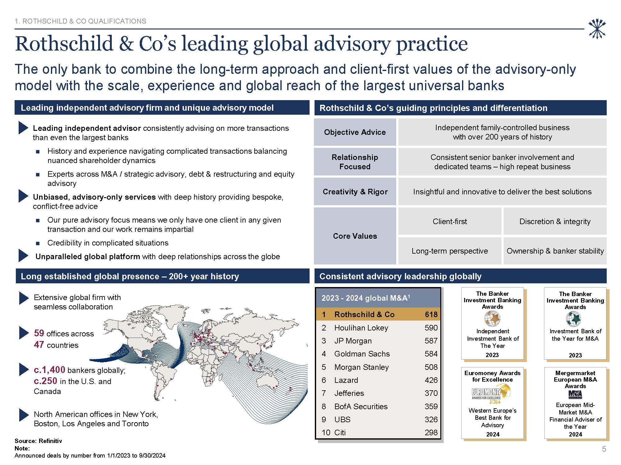 2023 - 2024 global M&A1  1  Rothschild & Co  618  2  Houlihan Lokey  590  3  JP Morgan  587  4  Goldman Sachs  584  5  Morgan Stanley  508  6  Lazard  426  7  Jefferies  370  8  BofA Securities  359  9  UBS  326  10  Citi  298  Rothschild & Co’s leading global advisory practice  The only bank to combine the long-term approach and client-first values of the advisory-only  model with the scale, experience and global reach of the largest universal banks  Rothschild & Co’s guiding principles and differentiation  Objective Advice  Independent family-controlled business with over 200 years of history  Relationship Focused  Consistent senior banker involvement and dedicated teams – high repeat business  Creativity & Rigor  Insightful and innovative to deliver the best solutions  Core Values  Client-first  Discretion & integrity  Long-term perspective  Ownership & banker stability  Consistent advisory leadership globally  Extensive global firm with seamless collaboration  c.1,400 bankers globally;  c.250 in the U.S. and Canada  59 offices across  47 countries  North American offices in New York, Boston, Los Angeles and Toronto  Leading independent advisory firm and unique advisory model  Leading independent advisor consistently advising on more transactions than even the largest banks  History and experience navigating complicated transactions balancing nuanced shareholder dynamics  Experts across M&A / strategic advisory, debt & restructuring and equity advisory  Unbiased, advisory-only services with deep history providing bespoke, conflict-free advice  Our pure advisory focus means we only have one client in any given transaction and our work remains impartial  Credibility in complicated situations  Unparalleled global platform with deep relationships across the globe  Long established global presence – 200+ year history  The Banker Investment Banking Awards  Independent Investment Bank of The Year  2023  The Banker Investment Banking Awards  Investment Bank of the Year for M&A  2023  Euromoney Awards  for Excellence  Western Europe’s Best Bank for Advisory  2024  Mergermarket European M&A Awards  European Mid-Market M&A Financial Adviser of the Year  2024  Source: Refinitiv Note:  Announced deals by number from 1/1/2023 to 9/30/2024  1. ROTHSCHILD & CO QUALIFICATIONS  5
