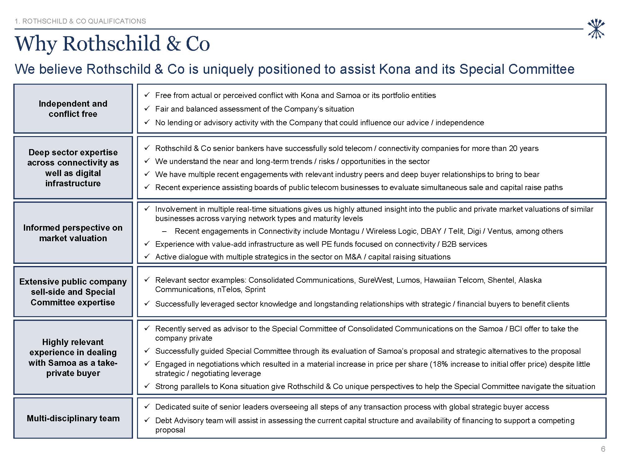 Why Rothschild & Co  We believe Rothschild & Co is uniquely positioned to assist Kona and its Special Committee  Deep sector expertise across connectivity as well as digital infrastructure  Rothschild & Co senior bankers have successfully sold telecom / connectivity companies for more than 20 years  We understand the near and long-term trends / risks / opportunities in the sector  We have multiple recent engagements with relevant industry peers and deep buyer relationships to bring to bear  Recent experience assisting boards of public telecom businesses to evaluate simultaneous sale and capital raise paths  Informed perspective on market valuation  Involvement in multiple real-time situations gives us highly attuned insight into the public and private market valuations of similar businesses across varying network types and maturity levels  – Recent engagements in Connectivity include Montagu / Wireless Logic, DBAY / Telit, Digi / Ventus, among others  Experience with value-add infrastructure as well PE funds focused on connectivity / B2B services  Active dialogue with multiple strategics in the sector on M&A / capital raising situations  Extensive public company sell-side and Special Committee expertise  Relevant sector examples: Consolidated Communications, SureWest, Lumos, Hawaiian Telcom, Shentel, Alaska Communications, nTelos, Sprint  Successfully leveraged sector knowledge and longstanding relationships with strategic / financial buyers to benefit clients  Independent and conflict free  Free from actual or perceived conflict with Kona and Samoa or its portfolio entities  Fair and balanced assessment of the Company’s situation  No lending or advisory activity with the Company that could influence our advice / independence  Multi-disciplinary team  Dedicated suite of senior leaders overseeing all steps of any transaction process with global strategic buyer access  Debt Advisory team will assist in assessing the current capital structure and availability of financing to support a competing proposal  Highly relevant experience in dealing with Samoa as a take-private buyer  Recently served as advisor to the Special Committee of Consolidated Communications on the Samoa / BCI offer to take the  company private  Successfully guided Special Committee through its evaluation of Samoa’s proposal and strategic alternatives to the proposal  Engaged in negotiations which resulted in a material increase in price per share (18% increase to initial offer price) despite little strategic / negotiating leverage  Strong parallels to Kona situation give Rothschild & Co unique perspectives to help the Special Committee navigate the situation  1. ROTHSCHILD & CO QUALIFICATIONS  6