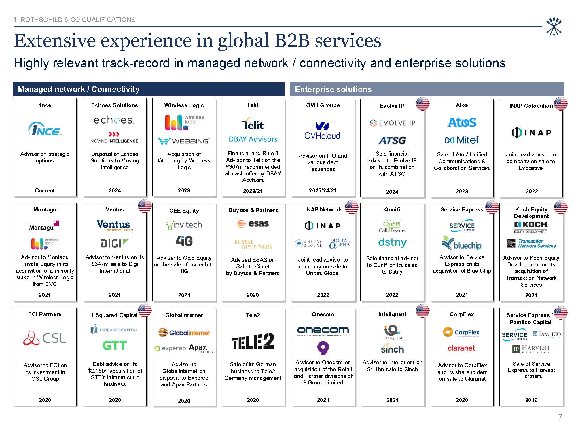 Extensive experience in global B2B services  Highly relevant track-record in managed network / connectivity and enterprise solutions  Managed network / Connectivity  Wireless Logic  Acquisition of Webbing by Wireless Logic  2023  Echoes Solutions  Disposal of Echoes Solutions to Moving Intelligence  2024  Qunifi  Sole financial advisor to Qunifi on its sales to Dstny  2022  INAP Network  Joint lead advisor to company on sale to Unitas Global  2022  2021  Ventus  Advisor to Ventus on its  $347m sale to Digi International  2021  Service Express  Advisor to Service Express on its acquisition of Blue Chip  Montagu  Advisor to Montagu Private Equity in its acquisition of a minority stake in Wireless Logic from CVC  2021  Koch Equity Development  Advisor to Koch Equity Development on its acquisition of Transaction Network Services  2021  1nce  Advisor on strategic options  Current  Telit  Financial and Rule 3 Advisor to Telit on the  £307m recommended all-cash offer by DBAY Advisors  2022/21  Onecom  Advisor to Onecom on acquisition of the Retail and Partner divisions of 9 Group Limited  2021  CEE Equity  Adviser to CEE Equity on the sale of Invitech to 4iG  2021  CorpFlex  Advisor to CorpFlex and its shareholders on sale to Claranet  2020  ECI Partners  Advisor to ECI on its investment in CSL Group  2020  Tele2  Sale of its German business to Tele2 Germany management  2020  2020  I Squared Capital  Debt advice on its  $2.15bn acquisition of GTT’s infrastructure business  Buysse & Partners  Advised ESAS on Sale to Circet  by Buysse & Partners  2020  2021  Inteliquent  Advisor to Inteliquent on  $1.1bn sale to Sinch  Service Express / Pamlico Capital  Sale of Service Express to Harvest Partners  2019  Enterprise solutions  OVH Groupe  Advisor on IPO and various debt issuances  2025/24/21  Evolve IP Atos INAP Colocation  Sole financial Sale of Atos’ Unified Joint lead advisor to advisor to Evolve IP Communications & company on sale to on its combination Collaboration Services Evocative  with ATSG  2024 2023 2022  GlobalInternet  Advisor to GlobalInternet on disposal to Expereo and Apax Partners  2020  1. ROTHSCHILD & CO QUALIFICATIONS  7