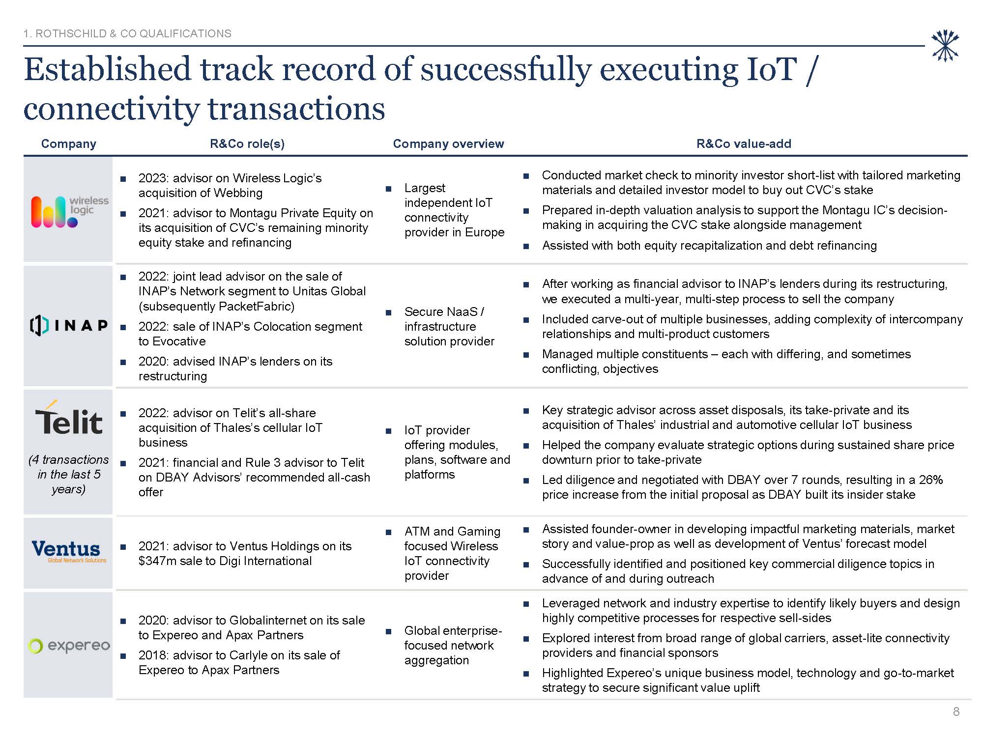 Company  R&Co role(s)  Company overview  R&Co value-add  2023: advisor on Wireless Logic’s acquisition of Webbing  2021: advisor to Montagu Private Equity on its acquisition of CVC’s remaining minority equity stake and refinancing  Largest independent IoT connectivity provider in Europe  Conducted market check to minority investor short-list with tailored marketing materials and detailed investor model to buy out CVC’s stake  Prepared in-depth valuation analysis to support the Montagu IC’s decision- making in acquiring the CVC stake alongside management  Assisted with both equity recapitalization and debt refinancing  2022: joint lead advisor on the sale of  INAP’s Network segment to Unitas Global  (subsequently PacketFabric)  2022: sale of INAP’s Colocation segment to Evocative  2020: advised INAP’s lenders on its restructuring  Secure NaaS / infrastructure solution provider  After working as financial advisor to INAP’s lenders during its restructuring,  we executed a multi-year, multi-step process to sell the company  Included carve-out of multiple businesses, adding complexity of intercompany relationships and multi-product customers  Managed multiple constituents – each with differing, and sometimes conflicting, objectives  (4 transactions in the last 5 years)  2022: advisor on Telit’s all-share acquisition of Thales’s cellular IoT business  2021: financial and Rule 3 advisor to Telit on DBAY Advisors’ recommended all-cash offer  IoT provider offering modules, plans, software and platforms  Key strategic advisor across asset disposals, its take-private and its acquisition of Thales’ industrial and automotive cellular IoT business  Helped the company evaluate strategic options during sustained share price downturn prior to take-private  Led diligence and negotiated with DBAY over 7 rounds, resulting in a 26%  price increase from the initial proposal as DBAY built its insider stake  2021: advisor to Ventus Holdings on its  $347m sale to Digi International  ATM and Gaming focused Wireless IoT connectivity provider  Assisted founder-owner in developing impactful marketing materials, market  story and value-prop as well as development of Ventus’ forecast model  Successfully identified and positioned key commercial diligence topics in advance of and during outreach  2020: advisor to Globalinternet on its sale to Expereo and Apax Partners  2018: advisor to Carlyle on its sale of Expereo to Apax Partners  Global enterprise-focused network aggregation  Leveraged network and industry expertise to identify likely buyers and design highly competitive processes for respective sell-sides  Explored interest from broad range of global carriers, asset-lite connectivity providers and financial sponsors  Highlighted Expereo’s unique business model, technology and go-to-market strategy to secure significant value uplift  Established track record of successfully executing IoT / connectivity transactions  1. ROTHSCHILD & CO QUALIFICATIONS  8