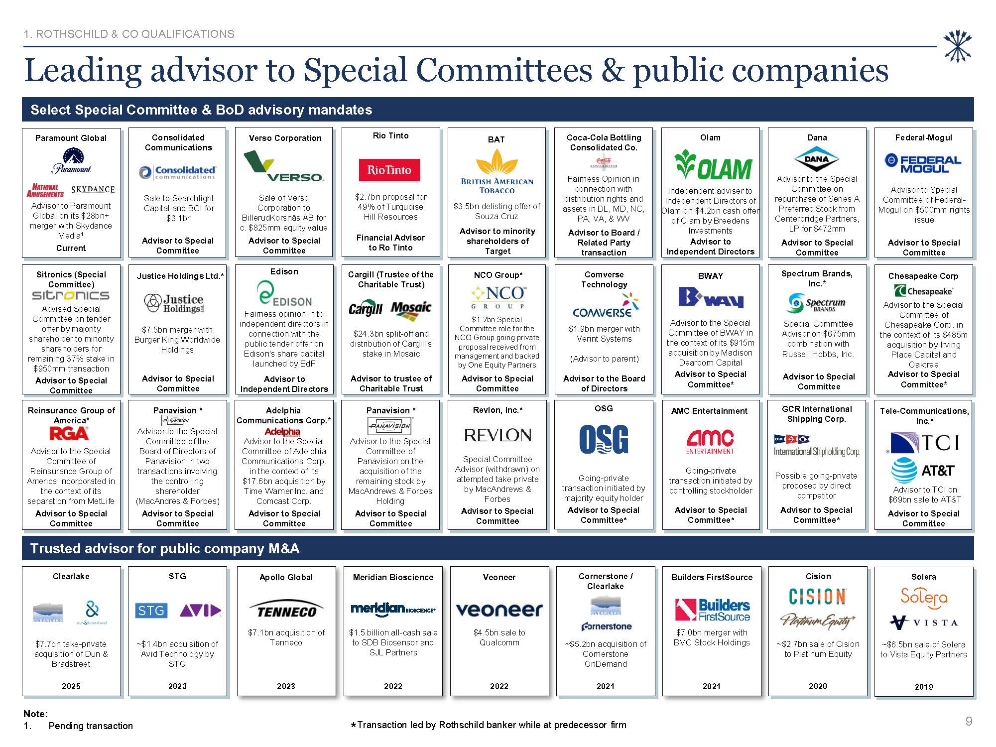 Comverse Technology  $1.9bn merger with Verint Systems  (Advisor to parent)  Advisor to the Board of Directors  Leading advisor to Special Committees & public companies  Reinsurance Group of America*  Advisor to the Special Committee of Reinsurance Group of America Incorporated in the context of its separation from MetLife  Advisor to Special  Committee  Justice Holdings Ltd.*  $7.5bn merger with Burger King Worldwide Holdings  Advisor to Special Committee  Cargill (Trustee of the Charitable Trust)  $24.3bn split-off and distribution of Cargill’s stake in Mosaic  Advisor to trustee of Charitable Trust  Sitronics (Special Committee)  Advised Special Committee on tender offer by majority shareholder to minority shareholders for remaining 37% stake in  $950mm transaction  Advisor to Special Committee  Federal-Mogul  Advisor to Special Committee of Federal-Mogul on $500mm rights issue  Advisor to Special Committee  Dana  Advisor to the Special Committee on repurchase of Series A Preferred Stock from Centerbridge Partners, LP for $472mm  Advisor to Special Committee  Olam  Independent adviser to Independent Directors of Olam on $4.2bn cash offer of Olam by Breedens Investments  Advisor to Independent Directors  Verso Corporation  Sale of Verso Corporation to BillerudKorsnäs AB for  c. $825mm equity value  Advisor to Special Committee  Edison  Fairness opinion in to independent directors in connection with the public tender offer on Edison's share capital launched by EdF  Advisor to Independent Directors  Adelphia Communications Corp.*  Advisor to the Special Committee of Adelphia Communications Corp. in the context of its  $17.6bn acquisition by Time Warner Inc. and Comcast Corp.  Advisor to Special  Committee  Coca-Cola Bottling Consolidated Co.  Fairness Opinion in connection with distribution rights and assets in DL, MD, NC, PA, VA, & WV  Advisor to Board / Related Party transaction  *Transaction led by Rothschild banker while at predecessor firm  BAT  $3.5bn delisting offer of Souza Cruz  Advisor to minority shareholders of Target  NCO Group*  $1.2bn Special Committee role for the NCO Group going private proposal received from management and backed by One Equity Partners  Advisor to Special Committee  Revlon, Inc.*  Special Committee Advisor (withdrawn) on attempted take private by MacAndrews & Forbes  Advisor to Special  Committee  Consolidated Communications  Sale to Searchlight Capital and BCI for  $3.1bn  Advisor to Special Committee  Chesapeake Corp  Advisor to the Special Committee of Chesapeake Corp. in the context of its $485m acquisition by Irving Place Capital and Oaktree  Advisor to Special  Committee*  BWAY  Spectrum Brands, Inc.*  Advisor to the Special Committee of BWAY in the context of its $915m acquisition by Madison Dearborn Capital  Special Committee Advisor on $675mm combination with Russell Hobbs, Inc.  Advisor to Special  Committee*  Advisor to Special Committee  Select Special Committee & BoD advisory mandates  Panavision *  Advisor to the Special Committee of Panavision on the acquisition of the remaining stock by MacAndrews & Forbes Holding  Advisor to Special  Committee  GCR International Shipping Corp.  Possible going-private proposed by direct competitor  Advisor to Special Committee*  AMC Entertainment  Going-private transaction initiated by controlling stockholder  Advisor to Special Committee*  OSG  Going-private transaction initiated by majority equity holder  Advisor to Special Committee*  Panavision *  Advisor to the Special Committee of the Board of Directors of Panavision in two transactions involving the controlling shareholder (MacAndres & Forbes)  Advisor to Special  Committee  Tele-Communications, Inc.*  Advisor to TCI on  $69bn sale to AT&T  Advisor to Special Committee  Clearlake  STG  $7.7bn take-private acquisition of Dun & Bradstreet  ~$1.4bn acquisition of Avid Technology by STG  2025  2023  Note:  1. Pending transaction  Cision  Solera  ~$2.7bn sale of Cision  ~$6.5bn sale of Solera  to Platinum Equity  to Vista Equity Partners  2020  2019  Trusted advisor for public company M&A  Paramount Global  Advisor to Paramount Global on its $28bn+ merger with Skydance Media1  Current  Rio Tinto  $2.7bn proposal for 49% of Turquoise Hill Resources  Financial Advisor to Ro Tinto  Apollo Global  $7.1bn acquisition of Tenneco  2023  Meridian Bioscience  $1.5 billion all-cash sale to SDB Biosensor and SJL Partners  2022  Veoneer  $4.5bn sale to Qualcomm  2022  Cornerstone / Clearlake  Builders FirstSource  $7.0bn merger with  ~$5.2bn acquisition of  BMC Stock Holdings  Cornerstone  OnDemand  2021  2021  1. ROTHSCHILD & CO QUALIFICATIONS  9