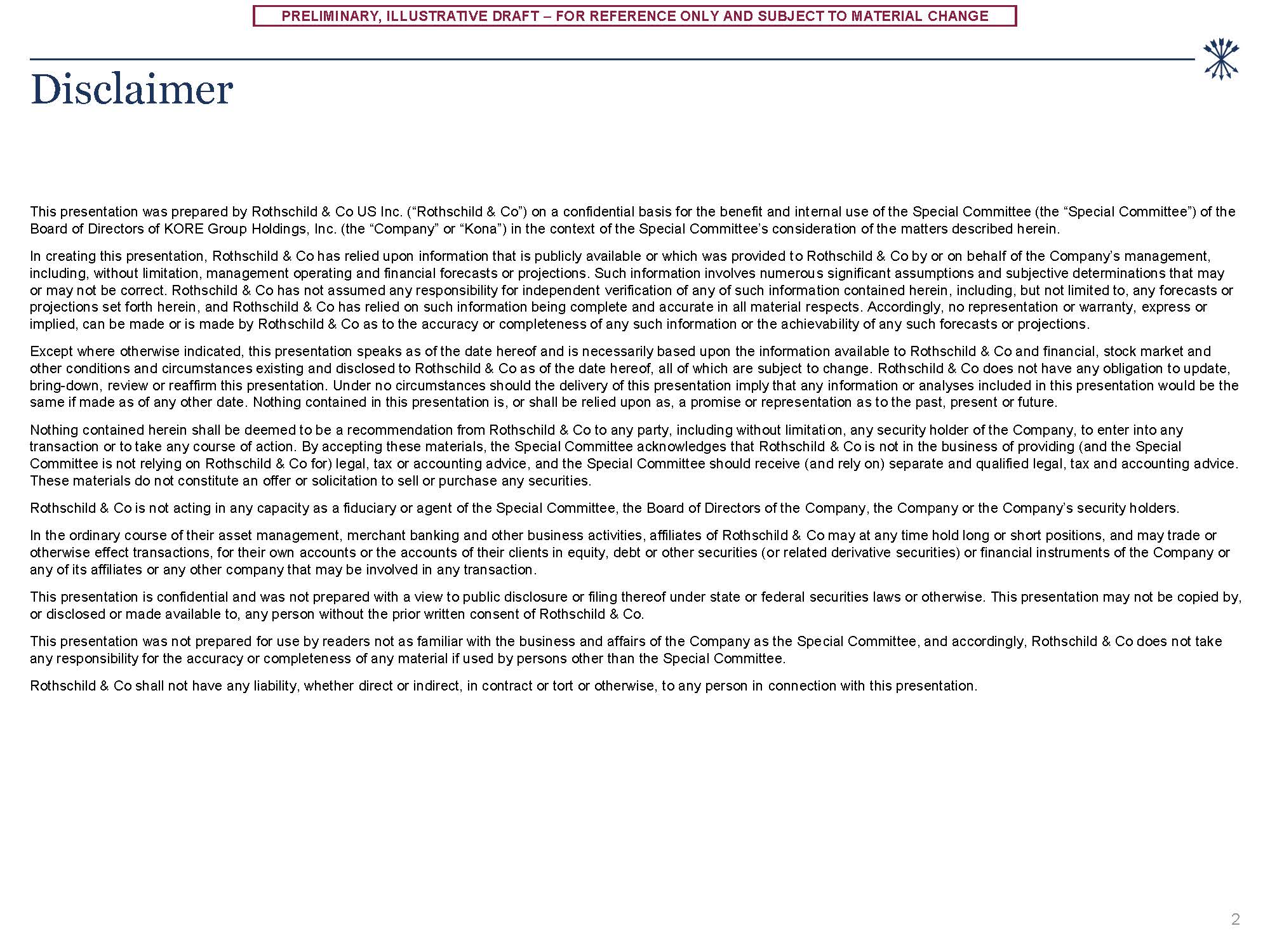 PRELIMINARY, ILLUSTRATIVE DRAFT – FOR REFERENCE ONLY AND SUBJECT TO MATERIAL CHANGE  Disclaimer  1. Section name  This presentation was prepared by Rothschild & Co US Inc. (“Rothschild & Co”) on a confidential basis for the benefit and internal use of the Special Committee (the “Special Committee”) of the Board of Directors of KORE Group Holdings, Inc. (the “Company” or “Kona”) in the context of the Special Committee’s consideration of the matters described herein.  In creating this presentation, Rothschild & Co has relied upon information that is publicly available or which was provided to Rothschild & Co by or on behalf of the Company’s management, including, without limitation, management operating and financial forecasts or projections. Such information involves numerous significant assumptions and subjective determinations that may or may not be correct. Rothschild & Co has not assumed any responsibility for independent verification of any of such information contained herein, including, but not limited to, any forecasts or projections set forth herein, and Rothschild & Co has relied on such information being complete and accurate in all material respects. Accordingly, no representation or warranty, express or implied, can be made or is made by Rothschild & Co as to the accuracy or completeness of any such information or the achievability of any such forecasts or projections.  Except where otherwise indicated, this presentation speaks as of the date hereof and is necessarily based upon the information available to Rothschild & Co and financial, stock market and other conditions and circumstances existing and disclosed to Rothschild & Co as of the date hereof, all of which are subject to change. Rothschild & Co does not have any obligation to update, bring-down, review or reaffirm this presentation. Under no circumstances should the delivery of this presentation imply that any information or analyses included in this presentation would be the same if made as of any other date. Nothing contained in this presentation is, or shall be relied upon as, a promise or representation as to the past, present or future.  Nothing contained herein shall be deemed to be a recommendation from Rothschild & Co to any party, including without limitation, any security holder of the Company, to enter into any transaction or to take any course of action. By accepting these materials, the Special Committee acknowledges that Rothschild & Co is not in the business of providing (and the Special Committee is not relying on Rothschild & Co for) legal, tax or accounting advice, and the Special Committee should receive (and rely on) separate and qualified legal, tax and accounting advice. These materials do not constitute an offer or solicitation to sell or purchase any securities.  Rothschild & Co is not acting in any capacity as a fiduciary or agent of the Special Committee, the Board of Directors of the Company, the Company or the Company’s security holders.  In the ordinary course of their asset management, merchant banking and other business activities, affiliates of Rothschild & Co may at any time hold long or short positions, and may trade or otherwise effect transactions, for their own accounts or the accounts of their clients in equity, debt or other securities (or related derivative securities) or financial instruments of the Company or any of its affiliates or any other company that may be involved in any transaction.  This presentation is confidential and was not prepared with a view to public disclosure or filing thereof under state or federal securities laws or otherwise. This presentation may not be copied by,  or disclosed or made available to, any person without the prior written consent of Rothschild & Co.  This presentation was not prepared for use by readers not as familiar with the business and affairs of the Company as the Special Committee, and accordingly, Rothschild & Co does not take any responsibility for the accuracy or completeness of any material if used by persons other than the Special Committee.  Rothschild & Co shall not have any liability, whether direct or indirect, in contract or tort or otherwise, to any person in connection with this presentation.  2
