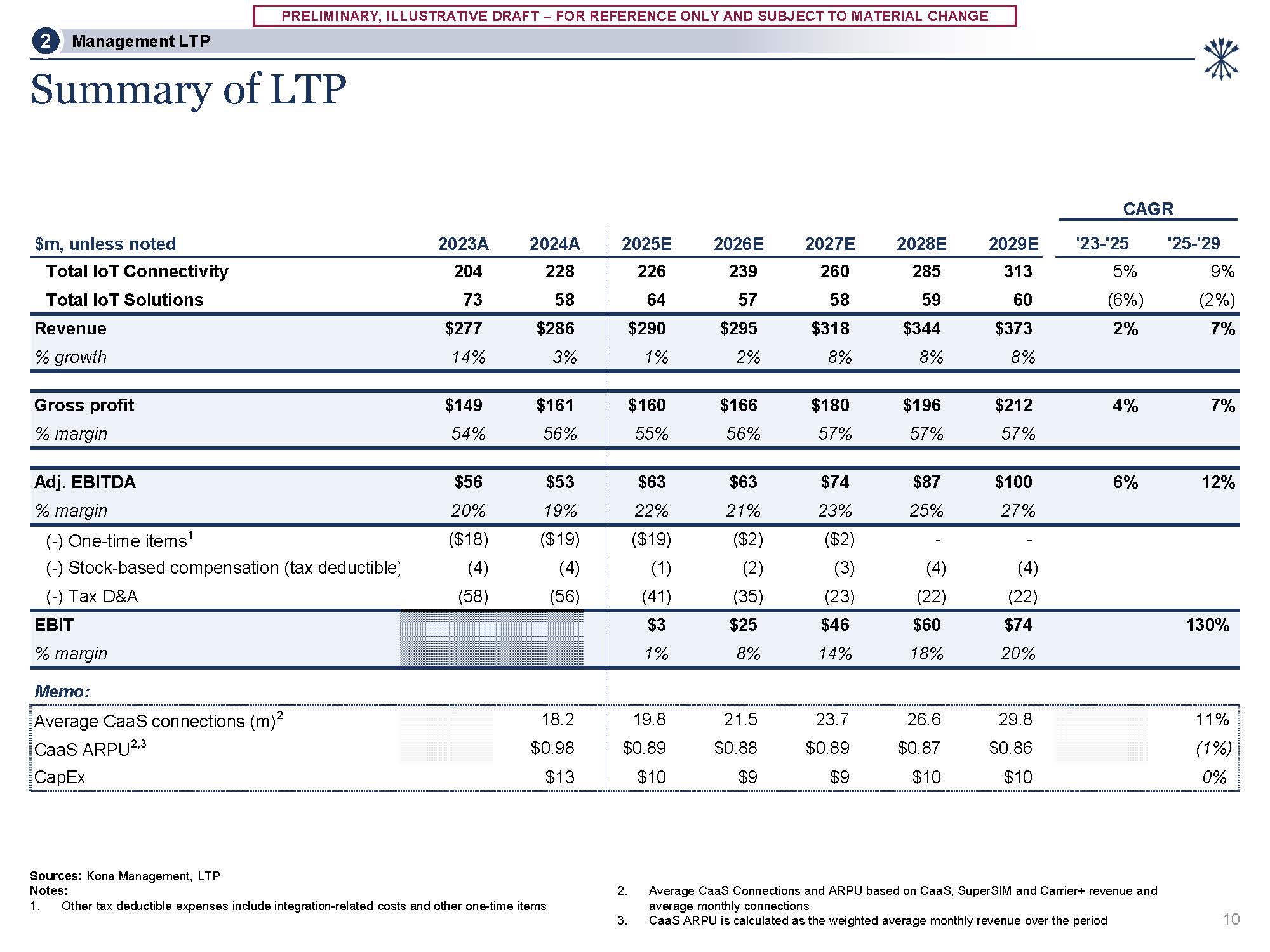 PRELIMINARY, ILLUSTRATIVE DRAFT – FOR REFERENCE ONLY AND SUBJECT TO MATERIAL CHANGE  Summary of LTP  Sources: Kona Management, LTP  Notes:  1. Other tax deductible expenses include integration-related costs and other one-time items  Average CaaS Connections and ARPU based on CaaS, SuperSIM and Carrier+ revenue and  average monthly connections  CaaS ARPU is calculated as the weighted average monthly revenue over the period   CAGR   $m, unless noted 2023A 2024A  2025E 2026E 2027E 2028E 2029E  '23-'25 '25-'29  Total IoT Connectivity 204 228  Total IoT Solutions 73 58  226 239 260 285 313  64 57 58 59 60  5% 9%  (6%) (2%)  Revenue $277 $286  % growth 14% 3%  $290 $295 $318 $344 $373 2% 7%  1% 2% 8% 8% 8%  Gross profit $149 $161  % margin 54% 56%  $160 $166 $180 $196 $212 4% 7%  55% 56% 57% 57% 57%  Adj. EBITDA $56 $53  % margin 20% 19%  $63 $63 $74 $87 $100 6% 12%  22% 21% 23% 25% 27%  (-) One-time items1 ($18) ($19) (-) Stock-based compensation (tax deductible (4) (4)  (-) Tax D&A (58) (56)  ($19) ($2) ($2) - -  (1) (2) (3) (4) (4)  (41) (35) (23) (22) (22)  EBIT  % margin  $3 $25 $46 $60 $74 130%  1% 8% 14% 18% 20%  Memo:  Average CaaS connections (m)2 18.2  CaaS ARPU2,3 $0.98  CapEx $13  19.8 21.5 23.7 26.6 29.8 11%  $0.89 $0.88 $0.89 $0.87 $0.86 (1%)  $10 $9 $9 $10 $10 0%  Management LTP  2  10
