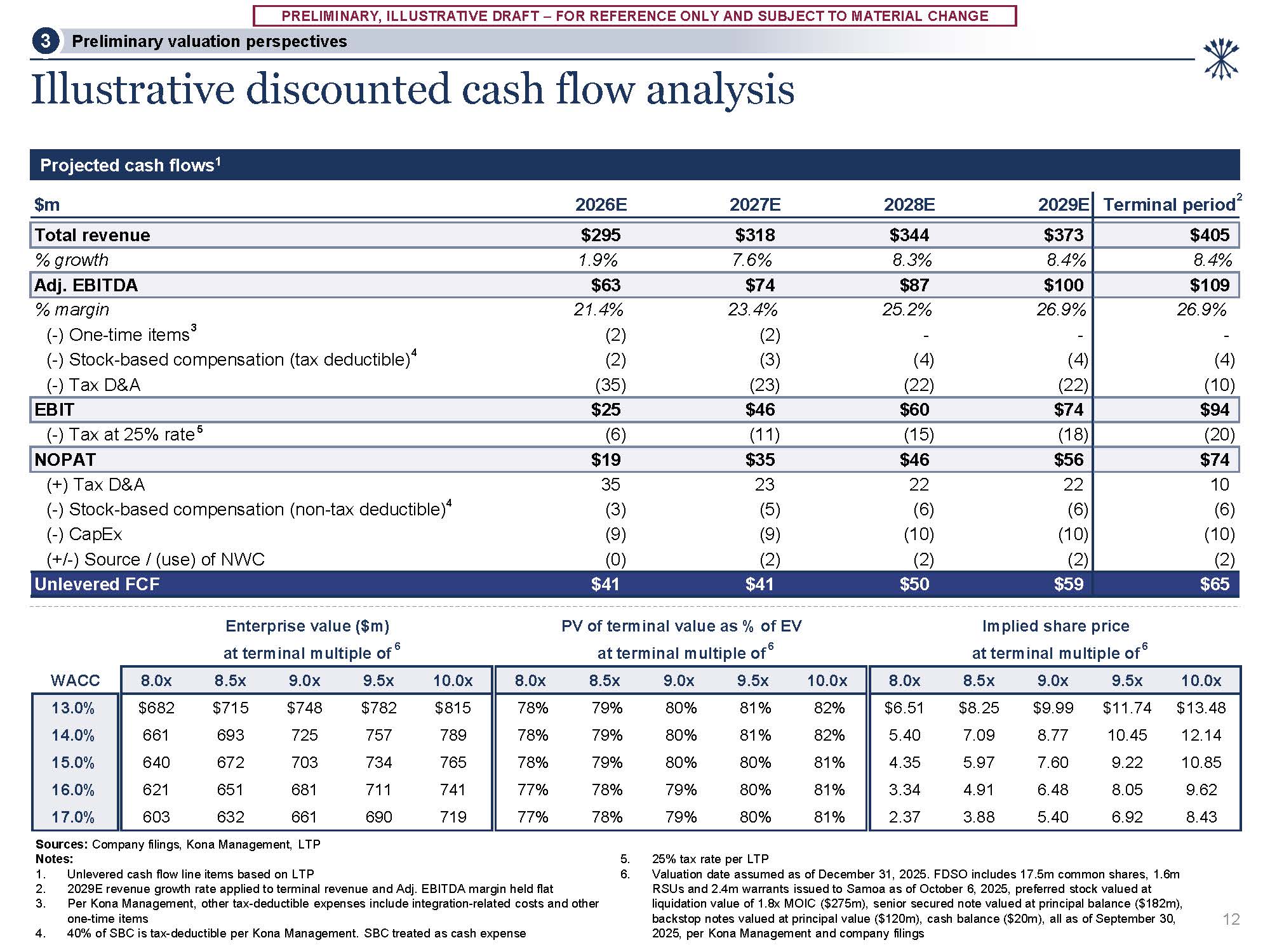 PRELIMINARY, ILLUSTRATIVE DRAFT – FOR REFERENCE ONLY AND SUBJECT TO MATERIAL CHANGE  Illustrative discounted cash flow analysis  Projected cash flows1  Sources: Company filings, Kona Management, LTP  Notes:  Unlevered cash flow line items based on LTP  2029E revenue growth rate applied to terminal revenue and Adj. EBITDA margin held flat  Per Kona Management, other tax-deductible expenses include integration-related costs and other one-time items  40% of SBC is tax-deductible per Kona Management. SBC treated as cash expense  25% tax rate per LTP  Valuation date assumed as of December 31, 2025. FDSO includes 17.5m common shares, 1.6m RSUs and 2.4m warrants issued to Samoa as of October 6, 2025, preferred stock valued at liquidation value of 1.8x MOIC ($275m), senior secured note valued at principal balance ($182m), backstop notes valued at principal value ($120m), cash balance ($20m), all as of September 30, 2025, per Kona Management and company filings  Enterprise value ($m) at terminal multiple of 6  PV of terminal value as % of EV at terminal multiple of 6  Implied share price at terminal multiple of 6  2  $m  2026E  2027E  2028E  2029E  Terminal period  Total revenue  $295  $318  $344  $373  $405  % growth  1.9%  7.6%  8.3%  8.4%  8.4%  Adj. EBITDA  $63  $74  $87  $100  $109  % margin  21.4%  23.4%  25.2%  26.9%  26.9%  (-) One-time items3  (2)  (2)  -  -  -  (-) Stock-based compensation (tax deductible)4  (2)  (3)  (4)  (4)  (4)  (-) Tax D&A  (35)  (23)  (22)  (22)  (10)  EBIT  $25  $46  $60  $74  $94  (-) Tax at 25% rate 5  (6)  (11)  (15)  (18)  (20)  NOPAT  $19  $35  $46  $56  $74  (+) Tax D&A  35  23  22  22  10  (-) Stock-based compensation (non-tax deductible)4  (3)  (5)  (6)  (6)  (6)  (-) CapEx  (9)  (9)  (10)  (10)  (10)  (+/-) Source / (use) of NWC  (0)  (2)  (2)  (2)  (2)  Unlevered FCF  $41  $41  $50  $59  $65  WACC  8.0x  8.5x  9.0x  9.5x  10.0x  8.0x  8.5x  9.0x  9.5x  10.0x  8.0x  8.5x  9.0x  9.5x  10.0x  13.0%  $682  $715  $748  $782  $815  78%  79%  80%  81%  82%  $6.51  $8.25  $9.99  $11.74  $13.48  14.0%  661  693  725  757  789  78%  79%  80%  81%  82%  5.40  7.09  8.77  10.45  12.14  15.0%  640  672  703  734  765  78%  79%  80%  80%  81%  4.35  5.97  7.60  9.22  10.85  16.0%  621  651  681  711  741  77%  78%  79%  80%  81%  3.34  4.91  6.48  8.05  9.62  17.0%  603  632  661  690  719  77%  78%  79%  80%  81%  2.37  3.88  5.40  6.92  8.43  Preliminary valuation perspectives  3  12