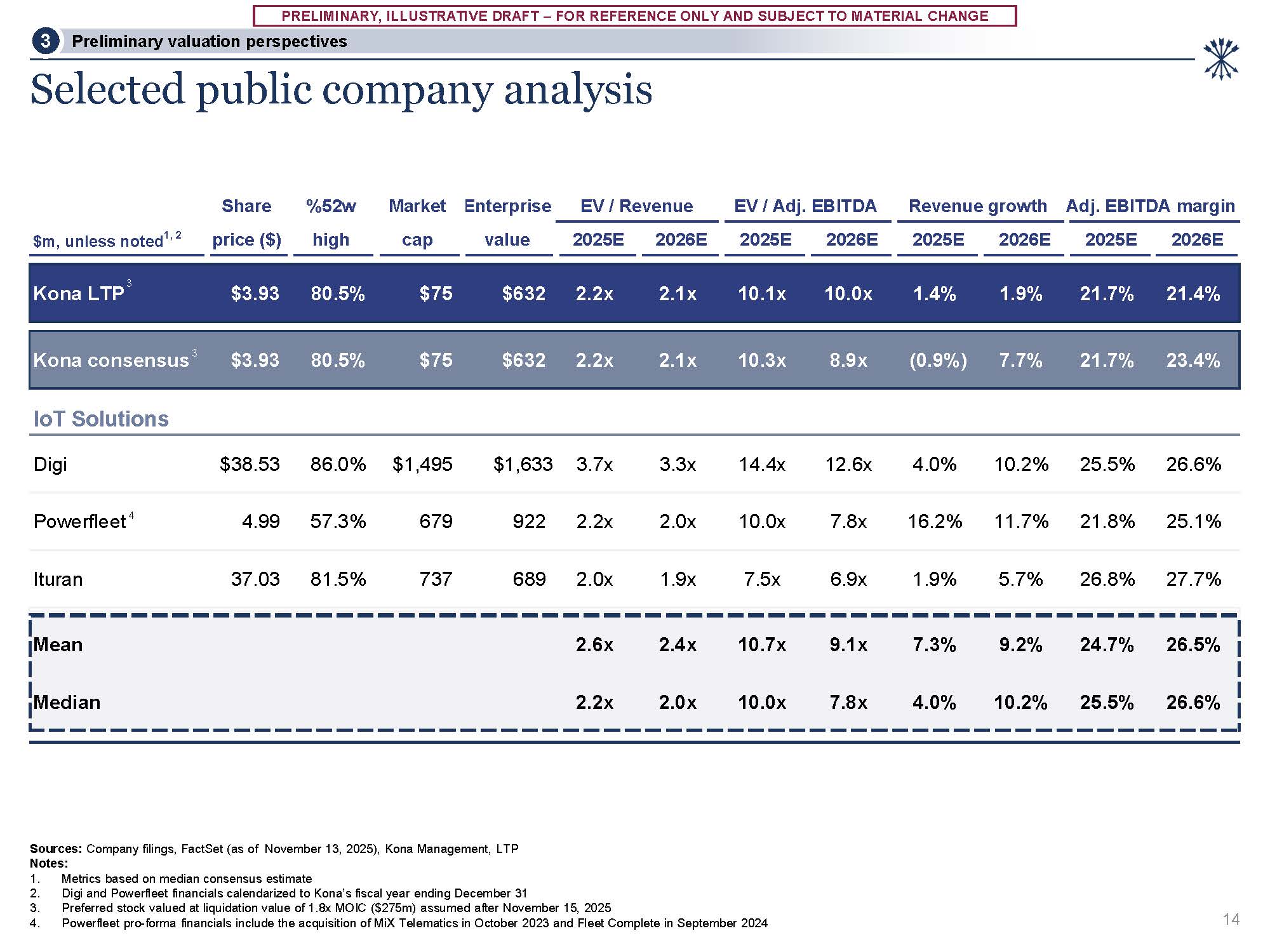 PRELIMINARY, ILLUSTRATIVE DRAFT – FOR REFERENCE ONLY AND SUBJECT TO MATERIAL CHANGE  Selected public company analysis  Sources: Company filings, FactSet (as of November 13, 2025), Kona Management, LTP  Notes:  Metrics based on median consensus estimate  Digi and Powerfleet financials calendarized to Kona’s fiscal year ending December 31  Preferred stock valued at liquidation value of 1.8x MOIC ($275m) assumed after November 15, 2025  Powerfleet pro-forma financials include the acquisition of MiX Telematics in October 2023 and Fleet Complete in September 2024  Share %52w Market  Enterprise EV / Revenue EV / Adj. EBITDA Revenue growth Adj. EBITDA margin  $m, unless noted1, 2  price ($)  high  cap  value  2025E  2026E  2025E  2026E  2025E  2026E  2025E  2026E  3  Kona LTP  $3.93  80.5%  $75  $632  2.2x  2.1x  10.1x  10.0x  1.4%  1.9%  21.7%  21.4%  Kona consensus3  $3.93  80.5%  $75  $632  2.2x  2.1x  10.3x  8.9x  (0.9%)  7.7%  21.7%  23.4%  IoT Solutions  Digi  $38.53  86.0%  $1,495  $1,633  3.7x  3.3x  14.4x  12.6x  4.0%  10.2%  25.5%  26.6%  Powerfleet 4  4.99  57.3%  679  922  2.2x  2.0x  10.0x  7.8x  16.2%  11.7%  21.8%  25.1%  Ituran  37.03  81.5%  737  689  2.0x  1.9x  7.5x  6.9x  1.9%  5.7%  26.8%  27.7%  Mean  2.6x  2.4x  10.7x  9.1x  7.3%  9.2%  24.7%  26.5%  Median  2.2x  2.0x  10.0x  7.8x  4.0%  10.2%  25.5%  26.6%  Preliminary valuation perspectives  3  14