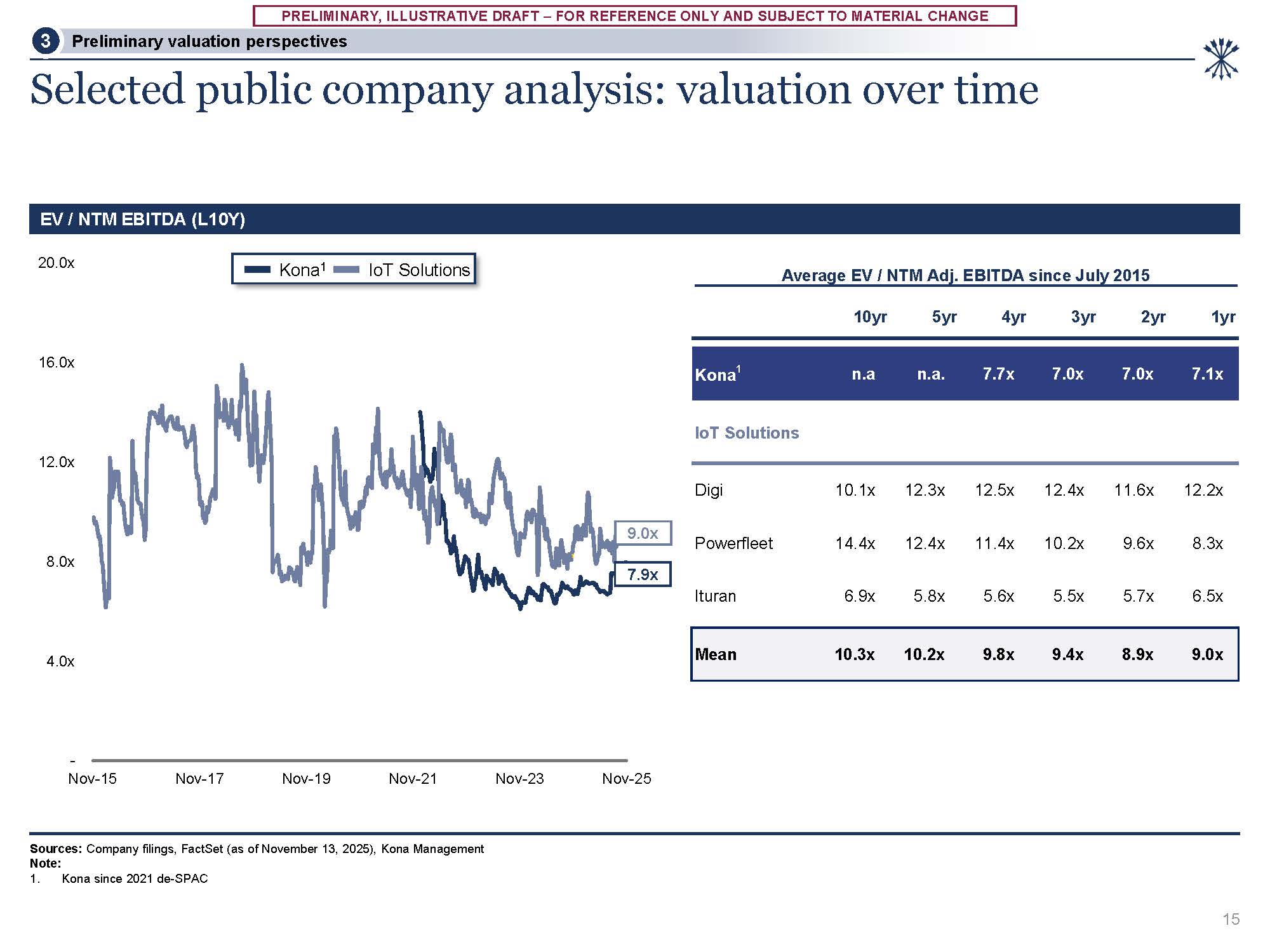 PRELIMINARY, ILLUSTRATIVE DRAFT – FOR REFERENCE ONLY AND SUBJECT TO MATERIAL CHANGE  10yr  5yr  4yr  3yr  2yr  1yr  Kona1  n.a  n.a.  7.7x  7.0x  7.0x  7.1x  IoT Solutions  Digi  10.1x  12.3x  12.5x  12.4x  11.6x  12.2x  Powerfleet  14.4x  12.4x  11.4x  10.2x  9.6x  8.3x  Ituran  6.9x  5.8x  5.6x  5.5x  5.7x  6.5x  Mean  10.3x  10.2x  9.8x  9.4x  8.9x  9.0x   Average EV / NTM Adj. EBITDA since July 2015   -  4.0x  8.0x  12.0x  16.0x  20.0x  Nov-15  Nov-17  Nov-19  Nov-21  Nov-23  Nov-25  Selected public company analysis: valuation over time  EV / NTM EBITDA (L10Y)  Sources: Company filings, FactSet (as of November 13, 2025), Kona Management  Note:  1. Kona since 2021 de-SPAC  Kona1 IoT Solutions  9.0x  7.9x  Preliminary valuation perspectives  3  15