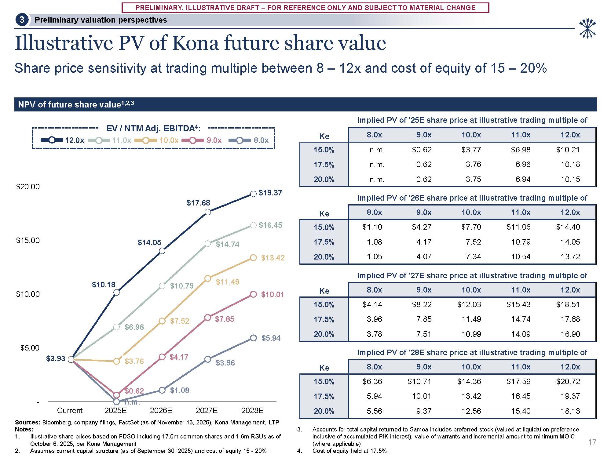 PRELIMINARY, ILLUSTRATIVE DRAFT – FOR REFERENCE ONLY AND SUBJECT TO MATERIAL CHANGE  Ke  8.0x  9.0x  10.0x  11.0x  12.0x  15.0%  n.m.  $0.62  $3.77  $6.98  $10.21  17.5%  n.m.  0.62  3.76  6.96  10.18  20.0%  n.m.  0.62  3.75  6.94  10.15  Ke  8.0x  9.0x  10.0x  11.0x  12.0x  15.0%  $1.10  $4.27  $7.70  $11.06  $14.40  17.5%  1.08  4.17  7.52  10.79  14.05  20.0%  1.05  4.07  7.34  10.54  13.72  Ke  8.0x  9.0x  10.0x  11.0x  12.0x  15.0%  $4.14  $8.22  $12.03  $15.43  $18.51  17.5%  3.96  7.85  11.49  14.74  17.68  20.0%  3.78  7.51  10.99  14.09  16.90  Ke  8.0x  9.0x  10.0x  11.0x  12.0x  15.0%  $6.36  $10.71  $14.36  $17.59  $20.72  17.5%  5.94  10.01  13.42  16.45  19.37  20.0%  5.56  9.37  12.56  15.40  18.13  Implied PV of '25E share price at illustrative trading multiple of  Implied PV of '26E share price at illustrative trading multiple of  Implied PV of '27E share price at illustrative trading multiple of  Implied PV of '28E share price at illustrative trading multiple of  Illustrative PV of Kona future share value  Share price sensitivity at trading multiple between 8 – 12x and cost of equity of 15 – 20%  Sources: Bloomberg, company filings, FactSet (as of November 13, 2025), Kona Management, LTP  Notes:  Illustrative share prices based on FDSO including 17.5m common shares and 1.6m RSUs as of  October 6, 2025, per Kona Management  Assumes current capital structure (as of September 30, 2025) and cost of equity 15 - 20%  Accounts for total capital returned to Samoa includes preferred stock (valued at liquidation preference inclusive of accumulated PIK interest), value of warrants and incremental amount to minimum MOIC (where applicable)  Cost of equity held at 17.5%  NPV of future share value1,2,3  9.0x  8.0x  EV / NTM Adj. EBITDA4:  11.0x 10.0x  12.0x  Preliminary valuation perspectives  3  17  $1.08  $3.96  $5.94  $0.62  n.m.  $4.17  $7.85  $10.01  $3.76  $7.52  $11.49  $13.42  $6.96  $10.79  $14.74  $16.45  $3.93  $10.18  $14.05  $17.68  $19.37  -  $5.00  $10.00  $15.00  $20.00  Current 2025E 2026E 2027E 2028E