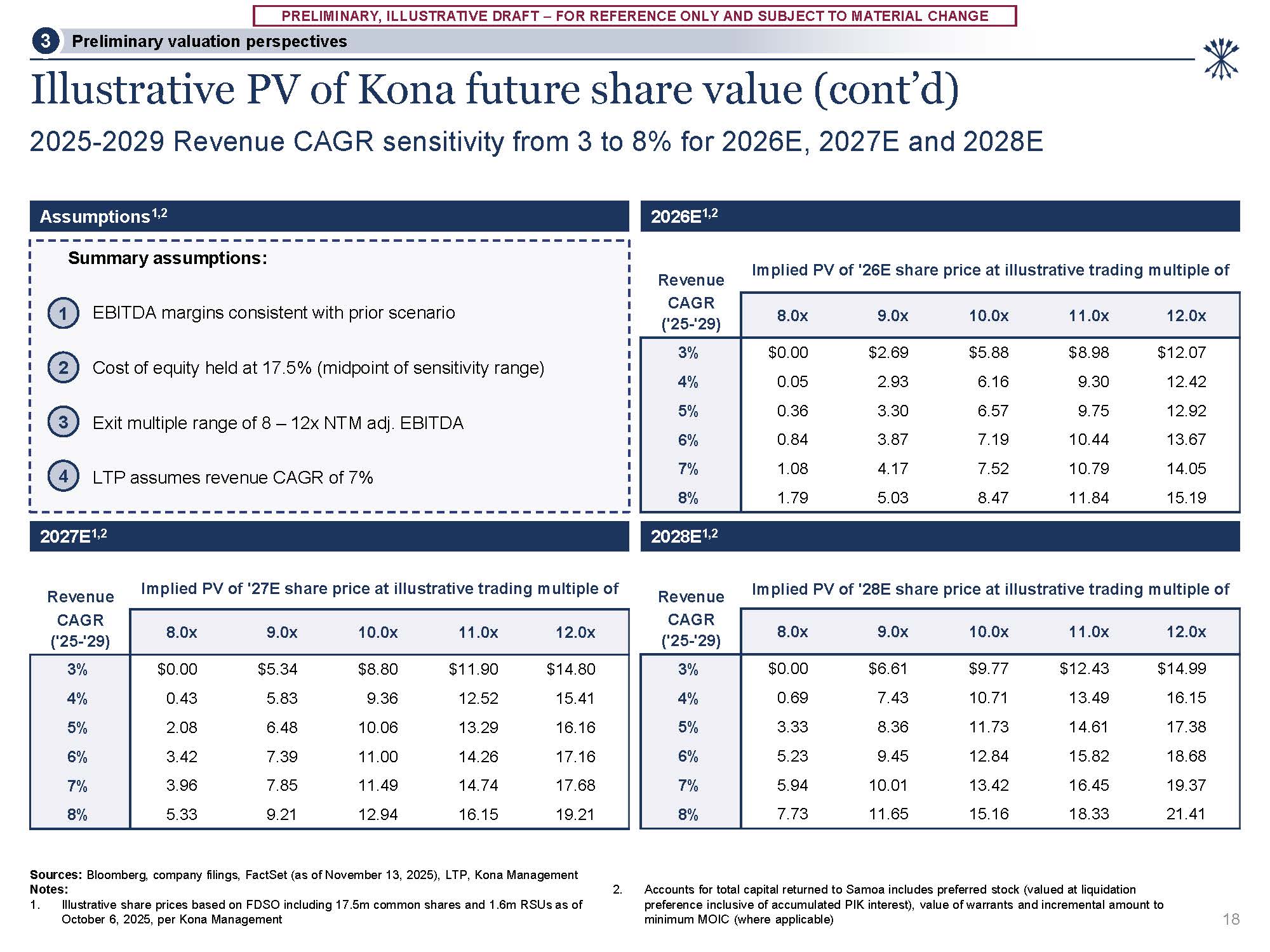 PRELIMINARY, ILLUSTRATIVE DRAFT – FOR REFERENCE ONLY AND SUBJECT TO MATERIAL CHANGE  Illustrative PV of Kona future share value (cont’d)  2025-2029 Revenue CAGR sensitivity from 3 to 8% for 2026E, 2027E and 2028E  Assumptions1,2  2026E1,2  Summary assumptions:  1 EBITDA margins consistent with prior scenario  2 Cost of equity held at 17.5% (midpoint of sensitivity range)  3 Exit multiple range of 8 – 12x NTM adj. EBITDA  4 LTP assumes revenue CAGR of 7%  Sources: Bloomberg, company filings, FactSet (as of November 13, 2025), LTP, Kona Management  Notes:  1. Illustrative share prices based on FDSO including 17.5m common shares and 1.6m RSUs as of October 6, 2025, per Kona Management  2. Accounts for total capital returned to Samoa includes preferred stock (valued at liquidation preference inclusive of accumulated PIK interest), value of warrants and incremental amount to minimum MOIC (where applicable)  2027E1,2  2028E1,2  Preliminary valuation perspectives  3  Revenue  Implied PV of '26E share price at illustrative trading multiple of  CAGR ('25-'29)  8.0x  9.0x  10.0x  11.0x  12.0x  3%  $0.00  $2.69  $5.88  $8.98  $12.07  4%  0.05  2.93  6.16  9.30  12.42  5%  0.36  3.30  6.57  9.75  12.92  6%  0.84  3.87  7.19  10.44  13.67  7%  1.08  4.17  7.52  10.79  14.05  8%  1.79  5.03  8.47  11.84  15.19  Revenue  Implied PV of '27E share price at illustrative trading multiple of  CAGR ('25-'29)  8.0x  9.0x  10.0x  11.0x  12.0x  3%  $0.00  $5.34  $8.80  $11.90  $14.80  4%  0.43  5.83  9.36  12.52  15.41  5%  2.08  6.48  10.06  13.29  16.16  6%  3.42  7.39  11.00  14.26  17.16  7%  3.96  7.85  11.49  14.74  17.68  8%  5.33  9.21  12.94  16.15  19.21  Revenue  Implied PV of '28E share price at illustrative trading multiple of  CAGR ('25-'29)  8.0x  9.0x  10.0x  11.0x  12.0x  3%  $0.00  $6.61  $9.77  $12.43  $14.99  4%  0.69  7.43  10.71  13.49  16.15  5%  3.33  8.36  11.73  14.61  17.38  6%  5.23  9.45  12.84  15.82  18.68  7%  5.94  10.01  13.42  16.45  19.37  8%  7.73  11.65  15.16  18.33  21.41  18