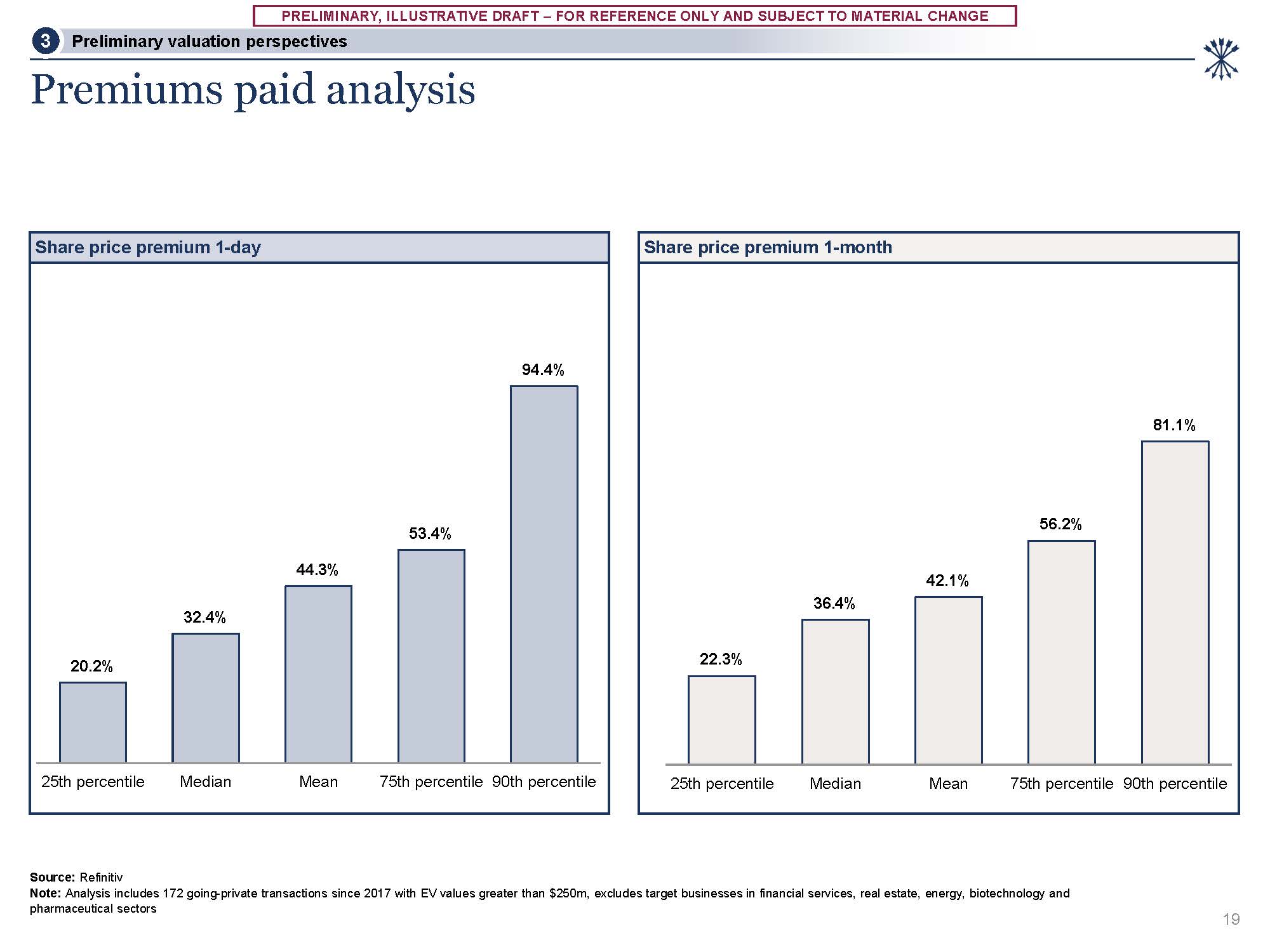 PRELIMINARY, ILLUSTRATIVE DRAFT – FOR REFERENCE ONLY AND SUBJECT TO MATERIAL CHANGE  22.3%  36.4%  42.1%  56.2%  81.1%  25th percentile  Median  Mean  75th percentile 90th percentile  20.2%  32.4%  44.3%  53.4%  94.4%  25th percentile  Median  Mean  75th percentile 90th percentile  Share price premium 1-day  Premiums paid analysis  Share price premium 1-month  Source: Refinitiv  Note: Analysis includes 172 going-private transactions since 2017 with EV values greater than $250m, excludes target businesses in financial services, real estate, energy, biotechnology and pharmaceutical sectors  Preliminary valuation perspectives  3  19