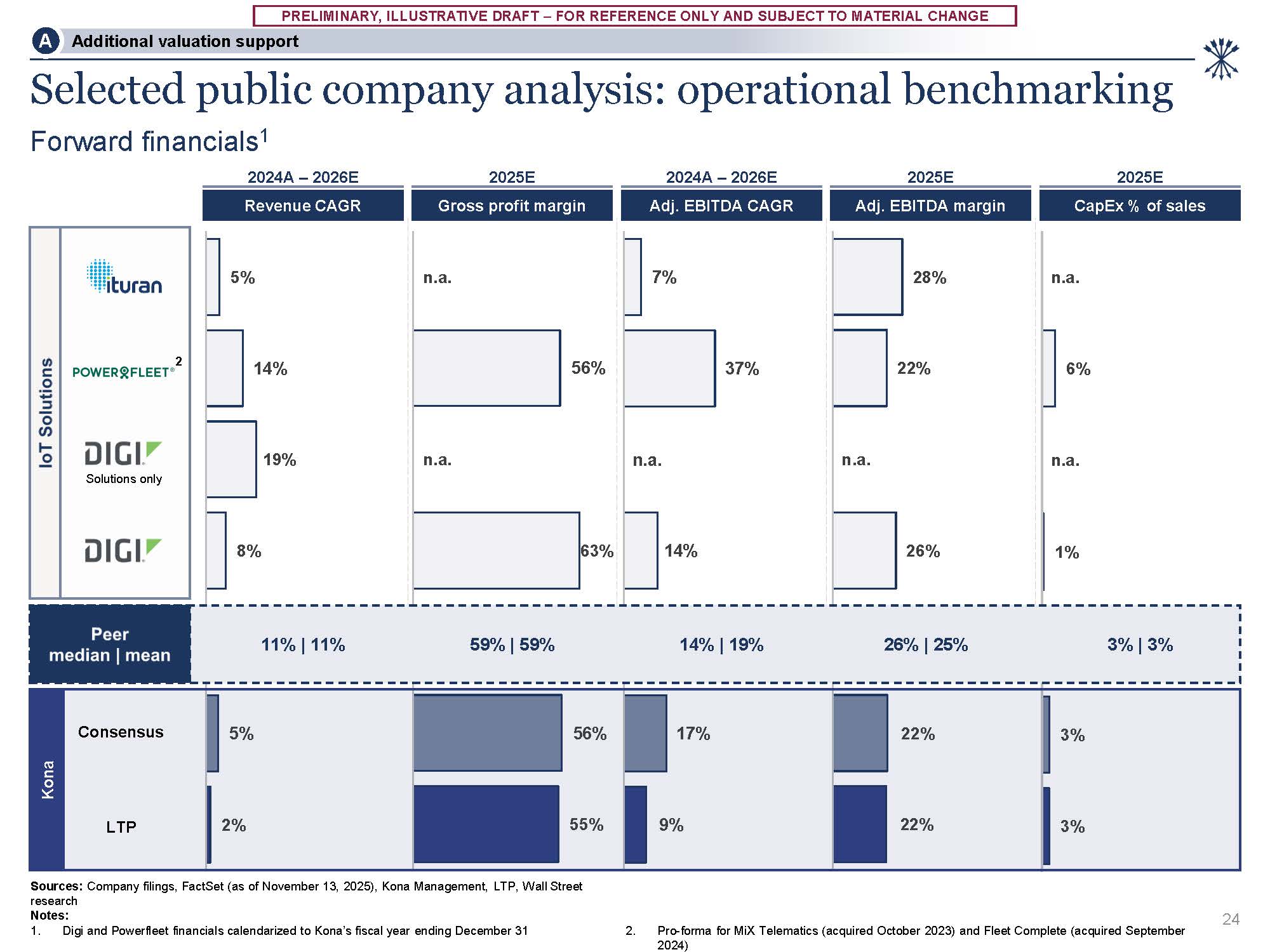 PRELIMINARY, ILLUSTRATIVE DRAFT – FOR REFERENCE ONLY AND SUBJECT TO MATERIAL CHANGE  n.a.  6%  n.a.  1%  3%  3%  28%  22%  n.a.  26%  22%  22%  7%  37%  n.a.  14%  17%  9%  n.a.  56%  n.a.  63%  56%  55%  5%  14%  19%  8%  5%  2%  Kona  Consensus  LTP  Sources: Company filings, FactSet (as of November 13, 2025), Kona Management, LTP, Wall Street research  Notes:  1. Digi and Powerfleet financials calendarized to Kona’s fiscal year ending December 31  2. Pro-forma for MiX Telematics (acquired October 2023) and Fleet Complete (acquired September  2024)  Additional valuation support  A  Selected public company analysis: operational benchmarking  Forward financials1   2024A – 2026E 2025E 2024A – 2026E 2025E 2025E   Gross profit margin Adj. EBITDA CAGR Adj. EBITDA margin  CapEx % of sales  Revenue CAGR  11% | 11%  59% | 59%  14% | 19%  26% | 25%  3% | 3%  2  Solutions only  24
