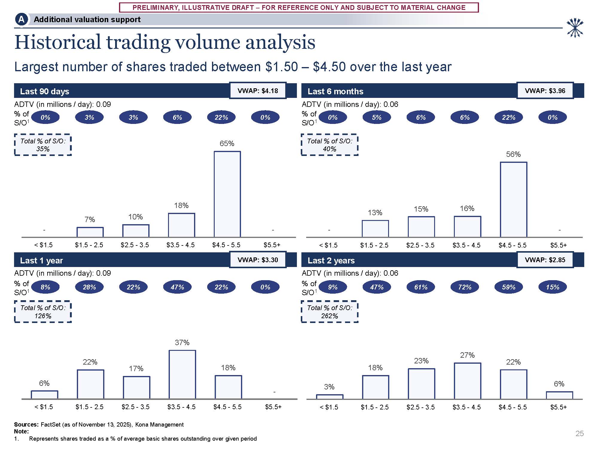 PRELIMINARY, ILLUSTRATIVE DRAFT – FOR REFERENCE ONLY AND SUBJECT TO MATERIAL CHANGE  3%  18%  23%  27%  22%  6%  < $1.5  $1.5 - 2.5  $2.5 - 3.5  $3.5 - 4.5  $4.5 - 5.5  $5.5+  6%  22%  17%  37%  18%  -  < $1.5 $1.5 - 2.5 $2.5 - 3.5 $3.5 - 4.5  Sources: FactSet (as of November 13, 2025), Kona Management  Note:  $4.5 - 5.5  $5.5+  -  13%  15%  16%  56%  -  < $1.5  $1.5 - 2.5  $2.5 - 3.5  $3.5 - 4.5  $4.5 - 5.5  $5.5+  7%  10%  18%  65%  -  -  < $1.5 $1.5 - 2.5 $2.5 - 3.5 $3.5 - 4.5  $4.5 - 5.5  $5.5+  Last 90 days  Last 6 months  Last 1 year  Last 2 years  1. Represents shares traded as a % of average basic shares outstanding over given period  ADTV (in millions / day): 0.09  % of  VWAP: $4.18  VWAP: $3.96  ADTV (in millions / day): 0.06  % of  VWAP: $3.30  ADTV (in millions / day): 0.09  % of  VWAP: $2.85  ADTV (in millions / day): 0.06  % of  S/O1  S/O1  3%  0% 3%  6%  22%  0%  S/O1  S/O1  Total % of S/O:  35%  Total % of S/O:  40%  Total % of S/O: 126%  Total % of S/O: 262%  6%  0% 5%  6%  22%  0%  22%  8% 28%  47%  22%  0%  61%  9% 47%  72%  59%  15%  Historical trading volume analysis  Largest number of shares traded between $1.50 – $4.50 over the last year  Additional valuation support  A  25