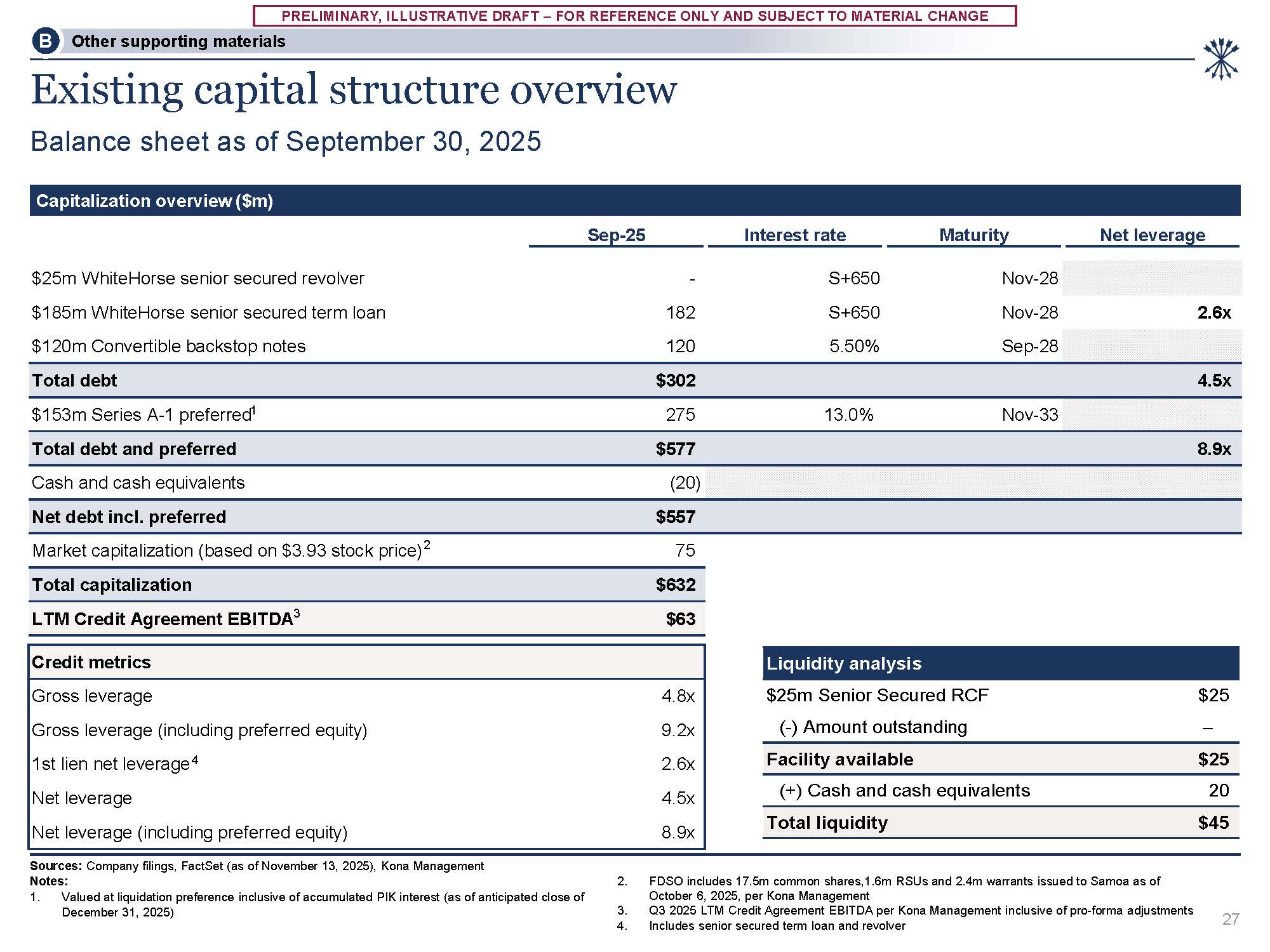 PRELIMINARY, ILLUSTRATIVE DRAFT – FOR REFERENCE ONLY AND SUBJECT TO MATERIAL CHANGE  Sep-25  Interest rate  Maturity  Net leverage  $25m WhiteHorse senior secured revolver  $185m WhiteHorse senior secured term loan  $120m Convertible backstop notes  -  182  120  S+650  S+650 5.50%  Nov-28  Nov-28 Sep-28  2.6x  4.8x  9.2x  2.6x  4.5x  8.9x  Existing capital structure overview  Balance sheet as of September 30, 2025  Capitalization overview ($m)  Sources: Company filings, FactSet (as of November 13, 2025), Kona Management  Notes:  1. Valued at liquidation preference inclusive of accumulated PIK interest (as of anticipated close of December 31, 2025)  FDSO includes 17.5m common shares,1.6m RSUs and 2.4m warrants issued to Samoa as of October 6, 2025, per Kona Management  Q3 2025 LTM Credit Agreement EBITDA per Kona Management inclusive of pro-forma adjustments  Includes senior secured term loan and revolver  Other supporting materials  B  $25m Senior Secured RCF $25  (-) Amount outstanding –  Facility available $25  (+) Cash and cash equivalents 20  Total liquidity $45  Gross leverage  Gross leverage (including preferred equity) 1st lien net leverage4  Net leverage  Net leverage (including preferred equity)  Total debt $302 4.5x  $153m Series A-1 preferred1 275 13.0% Nov-33  Total debt and preferred $577 8.9x  Cash and cash equivalents (20)  Net debt incl. preferred $557  Market capitalization (based on $3.93 stock price)2 75  Total capitalization $632  LTM Credit Agreement EBITDA3 $63  Credit metrics Liquidity analysis  27