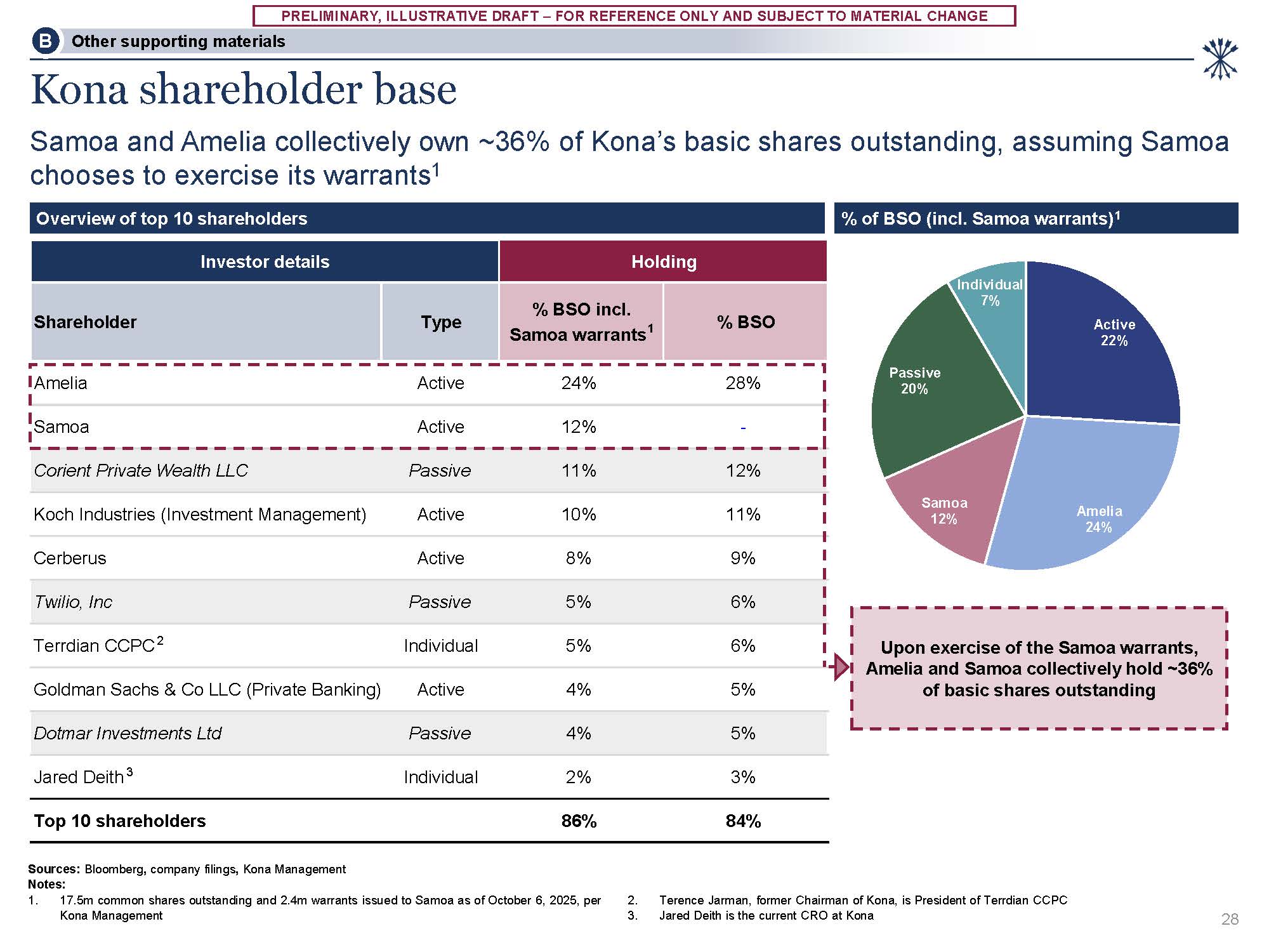 PRELIMINARY, ILLUSTRATIVE DRAFT – FOR REFERENCE ONLY AND SUBJECT TO MATERIAL CHANGE  24%  12%  Kona shareholder base  Samoa and Amelia collectively own ~36% of Kona’s basic shares outstanding, assuming Samoa  chooses to exercise its warrants1  1. 17.5m common shares outstanding and 2.4m warrants issued to Samoa as of October 6, 2025, per Kona Management  Terence Jarman, former Chairman of Kona, is President of Terrdian CCPC  Jared Deith is the current CRO at Kona  Overview of top 10 shareholders  % of BSO (incl. Samoa warrants)1  Investor details  Holding  Shareholder  Type  % BSO incl.  Samoa warrants1  % BSO  Amelia Active 24% 28%  Samoa Active 12% -  Corient Private Wealth LLC Passive 11% 12%  Koch Industries (Investment Management) Active 10% 11%  Cerberus Active 8% 9%  Twilio, Inc Passive 5% 6%  Terrdian CCPC 2 Individual 5% 6%  Other supporting materials  B  Individual 7%  Active  22%  Passive 20%  Samoa Amelia  Upon exercise of the Samoa warrants,  Goldman Sachs & Co LLC (Private Banking)  Active  4%  5%  Amelia and Samoa collectively hold ~36%  of basic shares outstanding  Dotmar Investments Ltd  Passive  4%  5%  Jared Deith 3  Individual  2%  3%  Top 10 shareholders  86%  84%  Sources: Bloomberg, company filings, Kona Management  Notes:  28