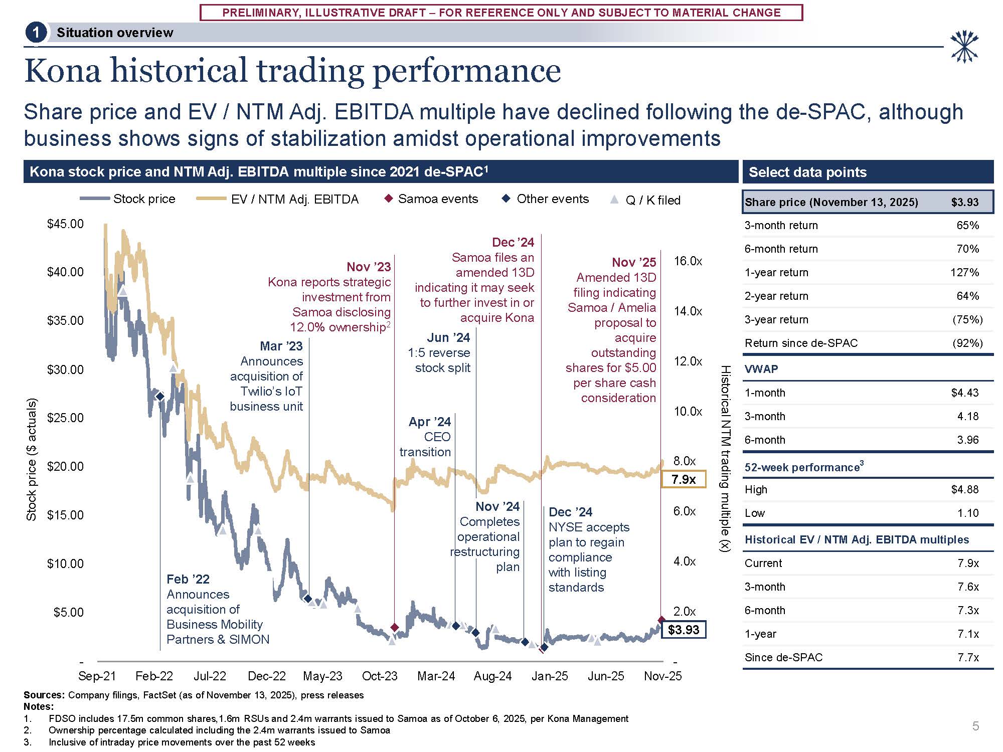 PRELIMINARY, ILLUSTRATIVE DRAFT – FOR REFERENCE ONLY AND SUBJECT TO MATERIAL CHANGE  -  -  Sep-21  Feb-22  Jul-22  Dec-22  May-23  Oct-23  Mar-24  Aug-24  Jan-25  Jun-25 Nov-25  $5.00  $10.00  $15.00  $20.00  $25.00  $30.00  $35.00  $40.00  6-month return  70%  1-year return  127%  2-year return  64%  3-year return  (75%)  Return since de-SPAC  (92%)  VWAP  1-month  $4.43  3-month  4.18  6-month  3.96  52-week performance  3  High  $4.88  Low 1.10  Historical EV / NTM Adj. EBITDA multiples  Current 7.9x  3-month 7.6x  6-month 7.3x  1-year 7.1x  Since de-SPAC 7.7x  Dec ’24 Samoa files an amended 13D indicating it may seek to further invest in or  acquire Kona  Mar ’23  Announces acquisition of  Twilio’s IoT  business unit  Jun ’24  1:5 reverse stock split  Nov ’24 Completes operational  restructuring  plan  Nov ’23 Kona reports strategic investment from Samoa disclosing 12.0% ownership2  Apr ’24  CEO  transition  Feb ’22 Announces acquisition of  Business Mobility Partners & SIMON  Stock price  EV / NTM Adj. EBITDA  Samoa events  Other events  Q / K filed  Share price (November 13, 2025)  $3.93  $45.00  3-month return  65%  Kona historical trading performance  Share price and EV / NTM Adj. EBITDA multiple have declined following the de-SPAC, although  business shows signs of stabilization amidst operational improvements  Sources: Company filings, FactSet (as of November 13, 2025), press releases  Notes:  FDSO includes 17.5m common shares,1.6m RSUs and 2.4m warrants issued to Samoa as of October 6, 2025, per Kona Management  Ownership percentage calculated including the 2.4m warrants issued to Samoa  Inclusive of intraday price movements over the past 52 weeks  Kona stock price and NTM Adj. EBITDA multiple since 2021 de-SPAC1 Select data points  Stock price ($ actuals)  Historical NTM trading multiple (x)  Situation overview  1  16.0x  14.0x  12.0x  10.0x  8.0x  7.9x  6.0x  4.0x  2.0x  $3.93  Dec ’24 NYSE accepts plan to regain compliance with listing standards  Nov ’25 Amended 13D filing indicating Samoa / Amelia  proposal to  acquire outstanding shares for $5.00 per share cash consideration  5