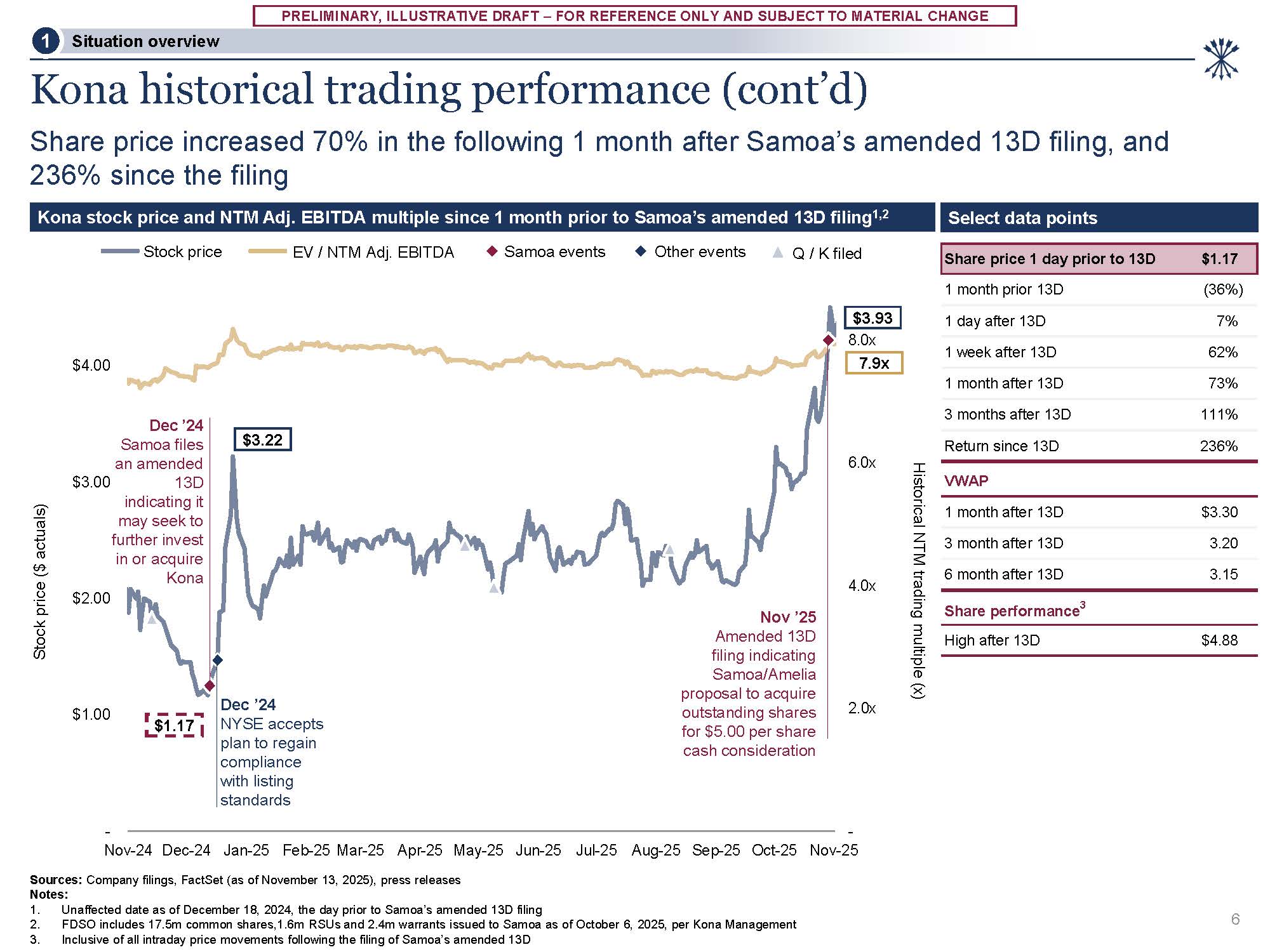 PRELIMINARY, ILLUSTRATIVE DRAFT – FOR REFERENCE ONLY AND SUBJECT TO MATERIAL CHANGE  -  2.0x  4.0x  6.0x  8.0x  -  Nov-24 Dec-24 Jan-25 Feb-25 Mar-25 Apr-25 May-25 Jun-25 Jul-25  Sources: Company filings, FactSet (as of November 13, 2025), press releases  Notes:  $1.00  $2.00  $3.00  $4.00  Aug-25 Sep-25 Oct-25 Nov-25  Share price 1 day prior to 13D  $1.17  1 month prior 13D  (36%)  1 day after 13D  7%  1 week after 13D  62%  1 month after 13D  73%  3 months after 13D  111%  Return since 13D  236%  VWAP  1 month after 13D  $3.30  3 month after 13D  3.20  6 month after 13D  3.15  Share performance3  High after 13D  $4.88  Kona historical trading performance (cont’d)  Share price increased 70% in the following 1 month after Samoa’s amended 13D filing, and  236% since the filing  7.9x  $1.17  Situation overview  1  $3.93  $3.22  Dec ’24 Samoa files an amended  13D  indicating it may seek to further invest in or acquire  Kona  Stock price ($ actuals)  Historical NTM trading multiple (x)  Dec ’24 NYSE accepts plan to regain compliance with listing standards  Unaffected date as of December 18, 2024, the day prior to Samoa’s amended 13D filing  FDSO includes 17.5m common shares,1.6m RSUs and 2.4m warrants issued to Samoa as of October 6, 2025, per Kona Management  Inclusive of all intraday price movements following the filing of Samoa’s amended 13D  Kona stock price and NTM Adj. EBITDA multiple since 1 month prior to Samoa’s amended 13D filing1,2 Select data points  Stock price EV / NTM Adj. EBITDA Samoa events Other events Q / K filed  Nov ’25 Amended 13D filing indicating Samoa/Amelia proposal to acquire outstanding shares for $5.00 per share cash consideration  6