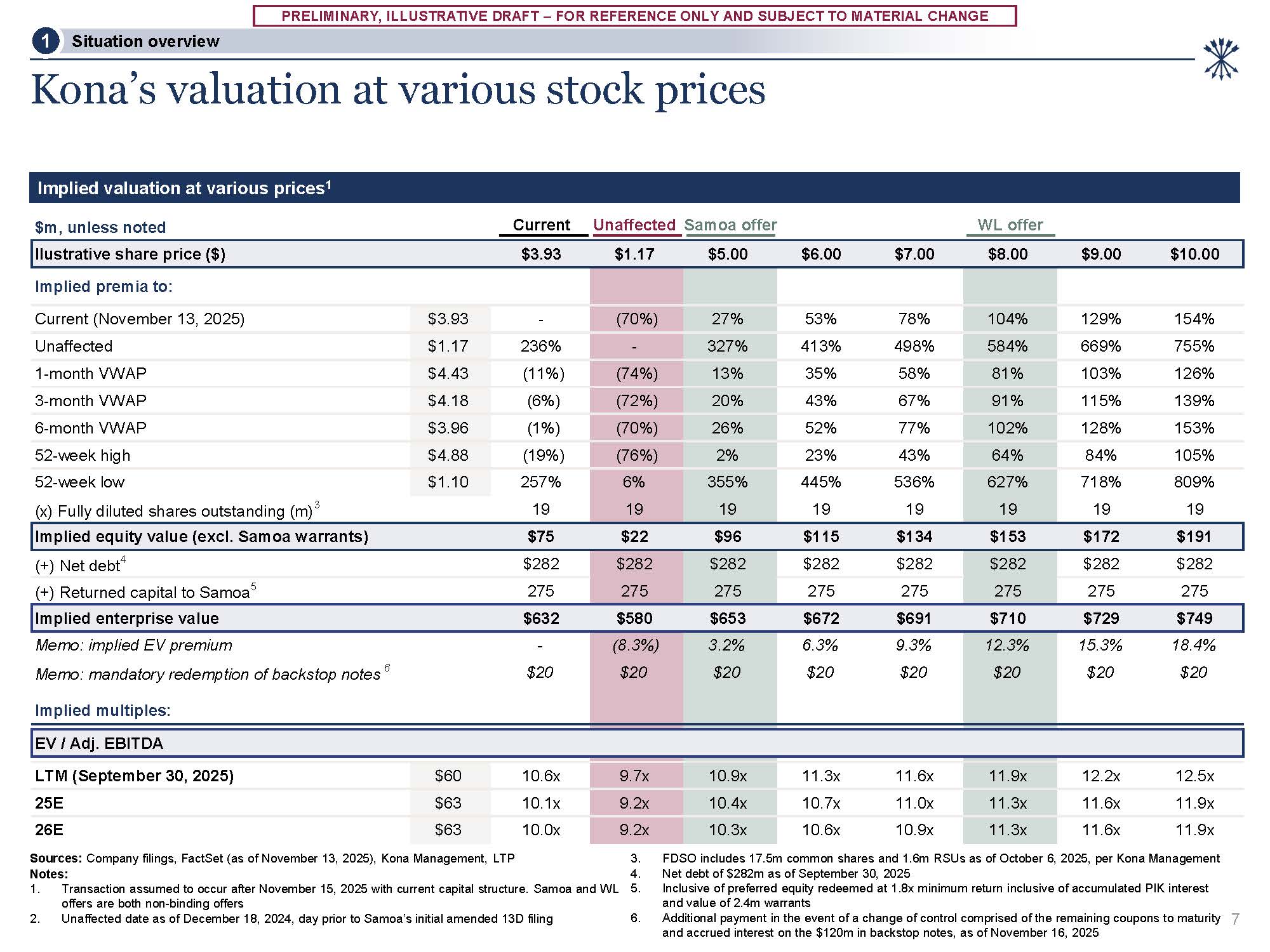 PRELIMINARY, ILLUSTRATIVE DRAFT – FOR REFERENCE ONLY AND SUBJECT TO MATERIAL CHANGE  Kona’s valuation at various stock prices  Sources: Company filings, FactSet (as of November 13, 2025), Kona Management, LTP  Notes:  Transaction assumed to occur after November 15, 2025 with current capital structure. Samoa and WL 5. offers are both non-binding offers  Unaffected date as of December 18, 2024, day prior to Samoa’s initial amended 13D filing 6.  FDSO includes 17.5m common shares and 1.6m RSUs as of October 6, 2025, per Kona Management  Net debt of $282m as of September 30, 2025  Inclusive of preferred equity redeemed at 1.8x minimum return inclusive of accumulated PIK interest and value of 2.4m warrants  Additional payment in the event of a change of control comprised of the remaining coupons to maturity 7  and accrued interest on the $120m in backstop notes, as of November 16, 2025  Implied valuation at various prices1  Situation overview  1  Ilustrative share price ($)  $3.93  $1.17  $5.00  $6.00  $7.00  $8.00  $9.00  $10.00  Implied premia to:  Current (November 13, 2025)  $3.93  -  (70%)  27%  53%  78%  104%  129%  154%  Unaffected  $1.17  236%  -  327%  413%  498%  584%  669%  755%  1-month VWAP  $4.43  (11%)  (74%)  13%  35%  58%  81%  103%  126%  3-month VWAP  $4.18  (6%)  (72%)  20%  43%  67%  91%  115%  139%  6-month VWAP  $3.96  (1%)  (70%)  26%  52%  77%  102%  128%  153%  52-week high  $4.88  (19%)  (76%)  2%  23%  43%  64%  84%  105%  52-week low  $1.10  257%  6%  355%  445%  536%  627%  718%  809%  (x) Fully diluted shares outstanding (m)3  19  19  19  19  19  19  19  19  Implied equity value (excl. Samoa warrants)  $75  $22  $96  $115  $134  $153  $172  $191  (+) Net debt4  $282  $282  $282  $282  $282  $282  $282  $282  (+) Returned capital to Samoa5  275  275  275  275  275  275  275  275  Implied enterprise value  $632  $580  $653  $672  $691  $710  $729  $749  Memo: implied EV premium  Memo: mandatory redemption of backstop notes 6  -  $20  (8.3%)  $20  3.2%  $20  6.3%  $20  9.3%  $20  12.3%  $20  15.3%  $20  18.4%  $20  Implied multiples:  EV / Adj. EBITDA  LTM (September 30, 2025)  $60  10.6x  9.7x  10.9x  11.3x  11.6x  11.9x  12.2x  12.5x  25E  $63  10.1x  9.2x  10.4x  10.7x  11.0x  11.3x  11.6x  11.9x  26E  $63  10.0x  9.2x  10.3x  10.6x  10.9x  11.3x  11.6x  11.9x  $m, unless noted   Current Unaffected Samoa offer WL offer