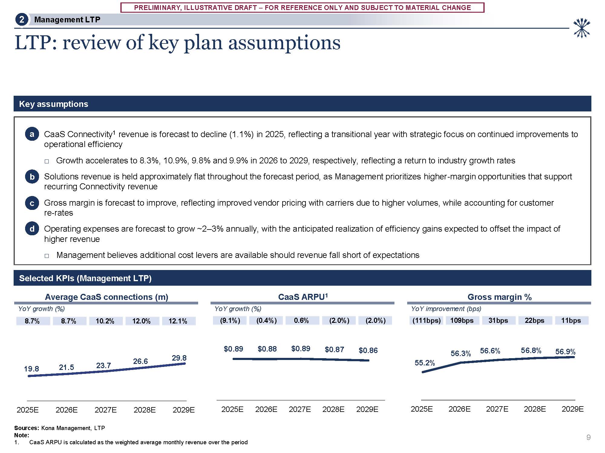 PRELIMINARY, ILLUSTRATIVE DRAFT – FOR REFERENCE ONLY AND SUBJECT TO MATERIAL CHANGE  b  LTP: review of key plan assumptions  1. CaaS ARPU is calculated as the weighted average monthly revenue over the period  2025E 2026E 2027E  Sources: Kona Management, LTP  Note:  Selected KPIs (Management LTP)  Key assumptions  a CaaS Connectivity1 revenue is forecast to decline (1.1%) in 2025, reflecting a transitional year with strategic focus on continued improvements to operational efficiency  Growth accelerates to 8.3%, 10.9%, 9.8% and 9.9% in 2026 to 2029, respectively, reflecting a return to industry growth rates  Solutions revenue is held approximately flat throughout the forecast period, as Management prioritizes higher-margin opportunities that support recurring Connectivity revenue  c Gross margin is forecast to improve, reflecting improved vendor pricing with carriers due to higher volumes, while accounting for customer re-rates  d Operating expenses are forecast to grow ~2–3% annually, with the anticipated realization of efficiency gains expected to offset the impact of higher revenue  Management believes additional cost levers are available should revenue fall short of expectations  Average CaaS connections (m) CaaS ARPU1 Gross margin %  YoY growth (%) YoY growth (%) YoY improvement (bps)  Management LTP  2  (111bps)  109bps  31bps  22bps  11bps  55.2%  56.3%  56.6%  56.8%  56.9%  2025E  2026E  2027E  2028E  2029E  (9.1%)  (0.4%)  0.6%  (2.0%)  (2.0%)  $0.89  $0.88  $0.89  $0.87  $0.86  2025E  2026E  2027E  2028E  2029E  8.7%  8.7%  10.2%  12.0%  12.1%  19.8  21.5  23.7  26.6  29.8  2028E  2029E  9