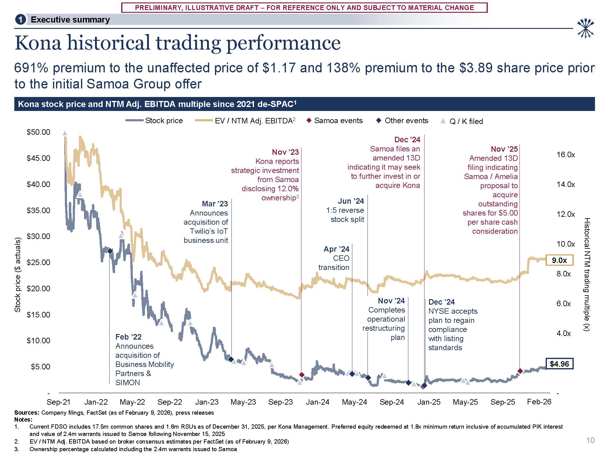 PRELIMINARY, ILLUSTRATIVE DRAFT – FOR REFERENCE ONLY AND SUBJECT TO MATERIAL CHANGE  -  2.0x  4.0x  6.0x  8.0x  10.0x  12.0x  14.0x  16.0x  -  Sep-21 Jan-22 May-22 Sep-22 Jan-23 May-23 Sep-23 Jan-24 May-24 Sep-24 Jan-25 May-25 Sep-25  $5.00  $10.00  $15.00  $20.00  $25.00  $30.00  $35.00  $40.00  $45.00  $50.00  Jan-26  1 Executive summary  Dec ’24 Samoa files an amended 13D indicating it may seek to further invest in or  acquire Kona  Mar ’23 Announces acquisition of  Twilio’s IoT  business unit  Jun ’24  1:5 reverse stock split  Nov ’24 Completes operational  restructuring  plan  Nov ’23 Kona reports strategic investment  from Samoa disclosing 12.0%  ownership3  Apr ’24  CEO  transition  Feb ’22 Announces acquisition of  Business Mobility Partners & SIMON  Kona historical trading performance  691% premium to the unaffected price of $1.17 and 138% premium to the $3.89 share price prior  to the initial Samoa Group offer  Sources: Company filings, FactSet (as of February 9, 2026), press releases  Notes:  Current FDSO includes 17.5m common shares and 1.6m RSUs as of December 31, 2025, per Kona Management. Preferred equity redeemed at 1.8x minimum return inclusive of accumulated PIK interest and value of 2.4m warrants issued to Samoa following November 15, 2025  EV / NTM Adj. EBITDA based on broker consensus estimates per FactSet (as of February 9, 2026)  Ownership percentage calculated including the 2.4m warrants issued to Samoa  Kona stock price and NTM Adj. EBITDA multiple since 2021 de-SPAC1  Stock price ($ actuals)  Historical NTM trading multiple (x)  Stock price EV / NTM Adj. EBITDA2 Samoa events Other events Q / K filed  $4.96  9.0x  Dec ’24 NYSE accepts plan to regain compliance with listing standards  Nov ’25 Amended 13D filing indicating Samoa / Amelia  proposal to  acquire outstanding shares for $5.00 per share cash consideration  10  Feb-26