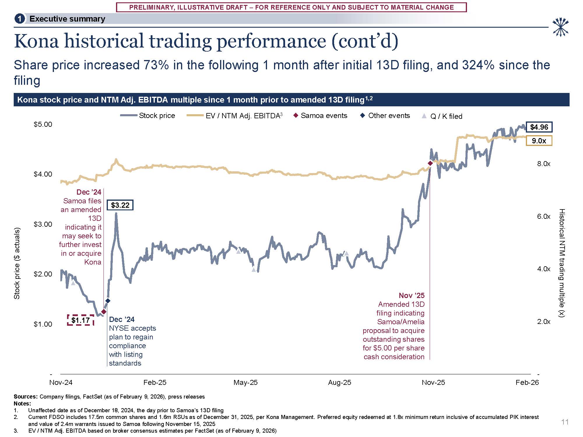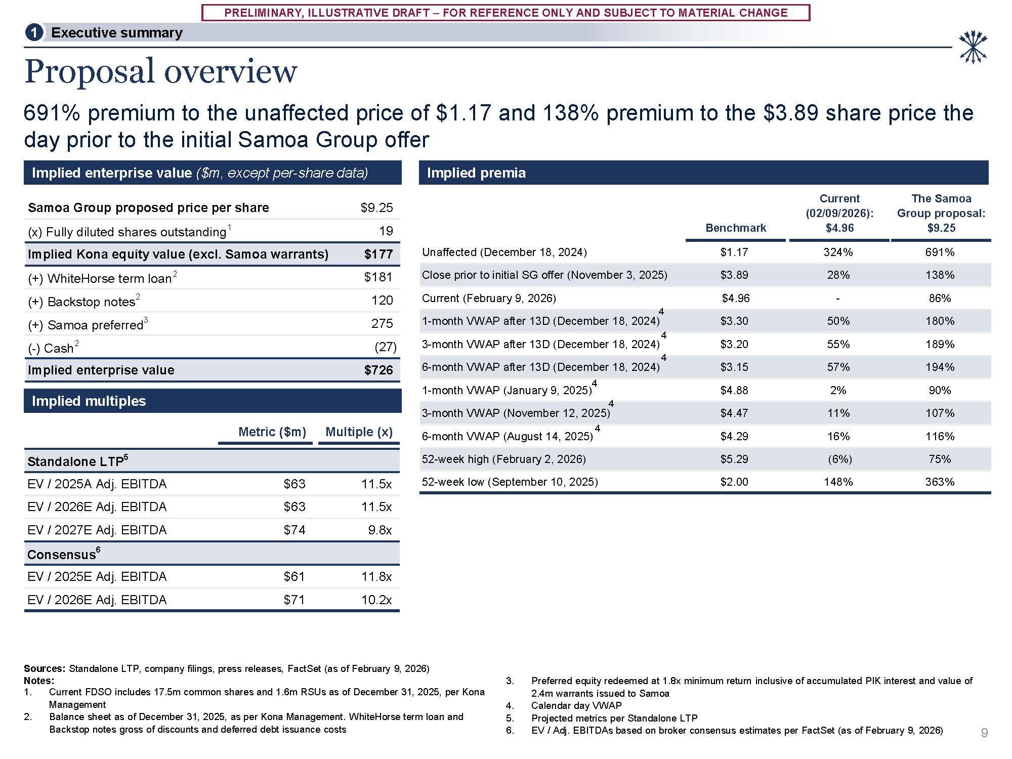 PRELIMINARY, ILLUSTRATIVE DRAFT – FOR REFERENCE ONLY AND SUBJECT TO MATERIAL CHANGE  Current The Samoa  $4.88  2%  90%  $4.47  11%  107%  1-month VWAP (January 9, 2025)4  4  3-month VWAP (November 12, 2025)  Samoa Group proposed price per share $9.25  (02/09/2026):  Group proposal:  (x) Fully diluted shares outstanding1 19  Benchmark  $4.96  $9.25  Implied Kona equity value (excl. Samoa warrants) $177  Unaffected (December 18, 2024)  $1.17  324%  691%  (+) WhiteHorse term loan2 $181  Close prior to initial SG offer (November 3, 2025)  $3.89  28%  138%  (+) Backstop notes2 120  Current (February 9, 2026)  $4.96  -  86%  (+) Samoa preferred3 275  4  1-month VWAP after 13D (December 18, 2024)  $3.30  50%  180%  (-) Cash2 (27)  4  3-month VWAP after 13D (December 18, 2024)  4  $3.20  55%  189%  Implied enterprise value  $726  6-month VWAP after 13D (December 18, 2024)  $3.15  57%  194%  Metric ($m)  Multiple (x)  4  6-month VWAP (August 14, 2025)  $4.29  16%  116%  Standalone LTP5  52-week high (February 2, 2026)  $5.29  (6%)  75%  EV / 2025A Adj. EBITDA  $63  11.5x  52-week low (September 10, 2025)  $2.00  148%  363%  EV / 2026E Adj. EBITDA  $63  11.5x  EV / 2027E Adj. EBITDA  $74  9.8x  Consensus6  EV / 2025E Adj. EBITDA  $61  11.8x  EV / 2026E Adj. EBITDA  $71  10.2x  Sources: Standalone LTP, company filings, press releases, FactSet (as of February 9, 2026)  Notes:  Current FDSO includes 17.5m common shares and 1.6m RSUs as of December 31, 2025, per Kona Management  Balance sheet as of December 31, 2025, as per Kona Management. WhiteHorse term loan and Backstop notes gross of discounts and deferred debt issuance costs  3. Preferred equity redeemed at 1.8x minimum return inclusive of accumulated PIK interest and value of  2.4m warrants issued to Samoa  Calendar day VWAP  Projected metrics per Standalone LTP  EV / Adj. EBITDAs based on broker consensus estimates per FactSet (as of February 9, 2026)  Implied enterprise value ($m, except per-share data)  Implied premia  9  1 Executive summary  Proposal overview  691% premium to the unaffected price of $1.17 and 138% premium to the $3.89 share price the  day prior to the initial Samoa Group offer  Implied multiples
