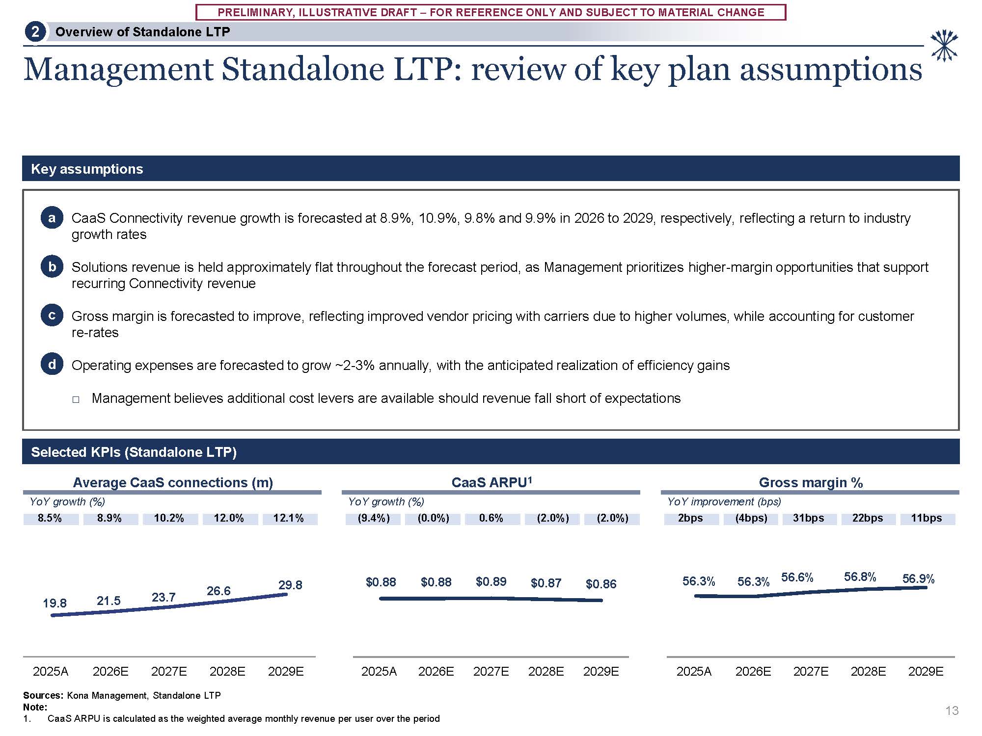 PRELIMINARY, ILLUSTRATIVE DRAFT – FOR REFERENCE ONLY AND SUBJECT TO MATERIAL CHANGE  8.5%  8.9%  10.2%  12.0%  12.1%  19.8  21.5  23.7  26.6  29.8  2025A 2026E 2027E 2028E  Sources: Kona Management, Standalone LTP  Note:  2029E  2bps  (4bps)  31bps  22bps  11bps  56.3%  56.3% 56.6%  56.8%  56.9%  2025A  2026E  2027E  2028E  2029E  (9.4%)  (0.0%)  0.6%  (2.0%)  (2.0%)  $0.88  $0.88  $0.89  $0.87  $0.86  2025A  2026E  2027E  2028E  2029E  Management Standalone LTP: review of key plan assumptions  1. CaaS ARPU is calculated as the weighted average monthly revenue per user over the period  Selected KPIs (Standalone LTP)  Key assumptions  a CaaS Connectivity revenue growth is forecasted at 8.9%, 10.9%, 9.8% and 9.9% in 2026 to 2029, respectively, reflecting a return to industry growth rates  b Solutions revenue is held approximately flat throughout the forecast period, as Management prioritizes higher-margin opportunities that support recurring Connectivity revenue  c Gross margin is forecasted to improve, reflecting improved vendor pricing with carriers due to higher volumes, while accounting for customer re-rates  d Operating expenses are forecasted to grow ~2-3% annually, with the anticipated realization of efficiency gains  Management believes additional cost levers are available should revenue fall short of expectations  Average CaaS connections (m) CaaS ARPU1 Gross margin %  YoY growth (%) YoY growth (%) YoY improvement (bps)  Overview of Standalone LTP  2  13
