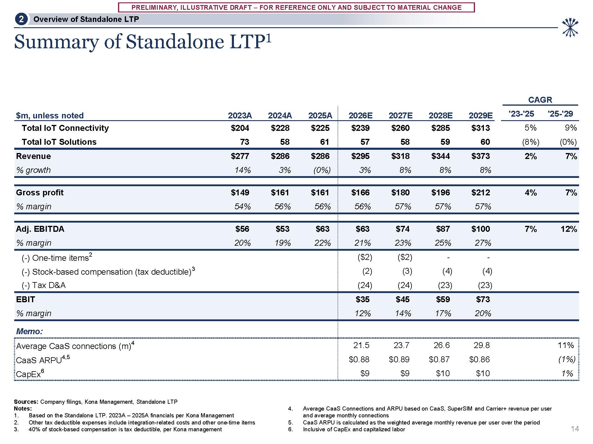 PRELIMINARY, ILLUSTRATIVE DRAFT – FOR REFERENCE ONLY AND SUBJECT TO MATERIAL CHANGE  Summary of Standalone LTP1  Sources: Company filings, Kona Management, Standalone LTP  Notes:  Based on the Standalone LTP. 2023A – 2025A financials per Kona Management  Other tax deductible expenses include integration-related costs and other one-time items  40% of stock-based compensation is tax deductible, per Kona management  Average CaaS Connections and ARPU based on CaaS, SuperSIM and Carrier+ revenue per user  and average monthly connections  CaaS ARPU is calculated as the weighted average monthly revenue per user over the period  Inclusive of CapEx and capitalized labor  14  Overview of Standalone LTP  2   CAGR   $m, unless noted 2023A 2024A 2025A  2026E 2027E 2028E 2029E  '23-'25 '25-'29  Total IoT Connectivity $204 $228 $225  Total IoT Solutions 73 58 61  $239 $260 $285 $313  57 58 59 60  5% 9%  (8%) (0%)  Revenue $277 $286 $286  % growth 14% 3% (0%)  $295 $318 $344 $373 2% 7%  3% 8% 8% 8%  Gross profit $149 $161 $161  % margin 54% 56% 56%  $166 $180 $196 $212 4% 7%  56% 57% 57% 57%  Adj. EBITDA $56 $53 $63  % margin 20% 19% 22%  $63 $74 $87 $100 7% 12%  21% 23% 25% 27%  (-) One-time items2  (-) Stock-based compensation (tax deductible)3 (-) Tax D&A  ($2) ($2) - -  (2) (3) (4) (4)  (24) (24) (23) (23)  EBIT  % margin  $35 $45 $59 $73  12% 14% 17% 20%  Memo:  Average CaaS connections (m)4  CaaS ARPU4,5  CapEx6  21.5 23.7 26.6 29.8 11%  $0.88 $0.89 $0.87 $0.86 (1%)  $9 $9 $10 $10 1%