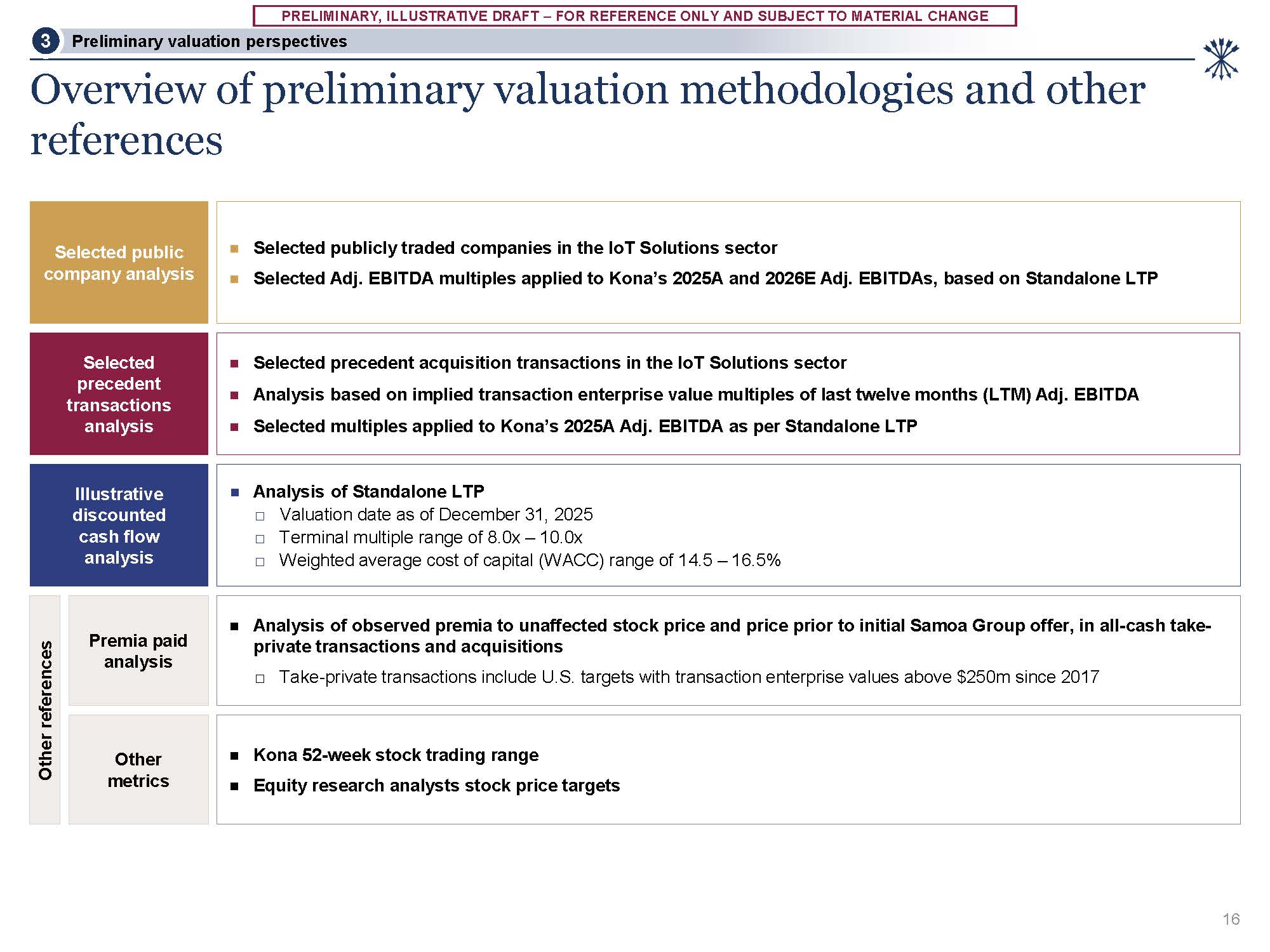 PRELIMINARY, ILLUSTRATIVE DRAFT – FOR REFERENCE ONLY AND SUBJECT TO MATERIAL CHANGE  Overview of preliminary valuation methodologies and other references  Selected public company analysis  Selected publicly traded companies in the IoT Solutions sector  Selected Adj. EBITDA multiples applied to Kona’s 2025A and 2026E Adj. EBITDAs, based on Standalone LTP  Selected precedent acquisition transactions in the IoT Solutions sector  Analysis based on implied transaction enterprise value multiples of last twelve months (LTM) Adj. EBITDA  Selected multiples applied to Kona’s 2025A Adj. EBITDA as per Standalone LTP  Selected precedent transactions analysis  Analysis of Standalone LTP  Valuation date as of December 31, 2025  Terminal multiple range of 8.0x – 10.0x  Weighted average cost of capital (WACC) range of 14.5 – 16.5%  Illustrative discounted cash flow analysis  Other references  Premia paid  analysis  Analysis of observed premia to unaffected stock price and price prior to initial Samoa Group offer, in all-cash take- private transactions and acquisitions  □ Take-private transactions include U.S. targets with transaction enterprise values above $250m since 2017  Other metrics  Kona 52-week stock trading range  Equity research analysts stock price targets  16  Preliminary valuation perspectives  3