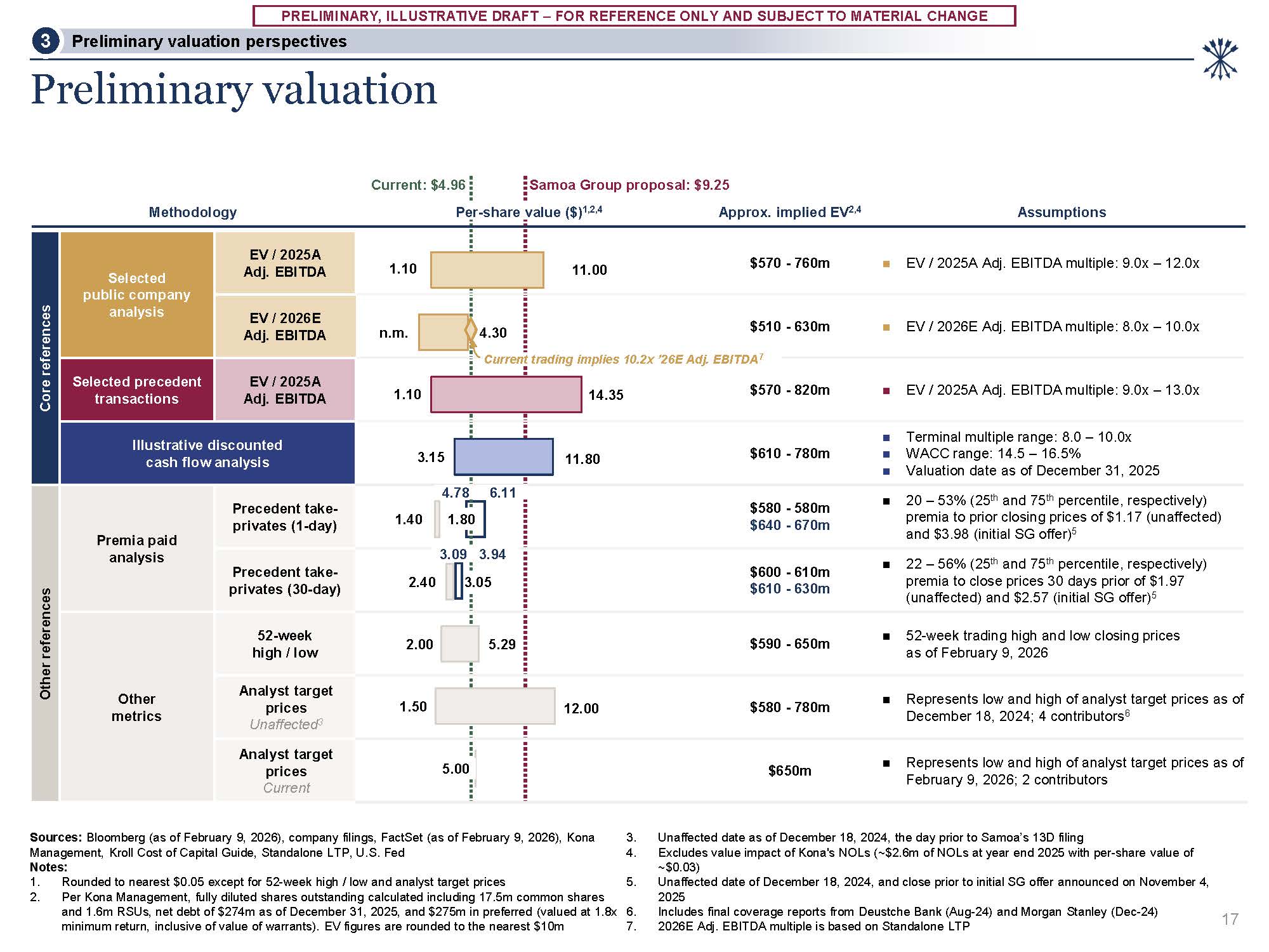 PRELIMINARY, ILLUSTRATIVE DRAFT – FOR REFERENCE ONLY AND SUBJECT TO MATERIAL CHANGE  Methodology  Current: $4.96 Samoa Group proposal: $9.25  Per-share value ($)1,2,4 Approx. implied EV2,4  Assumptions  Core references  Selected public company  analysis  EV / 2025A Adj. EBITDA  $570 - 760m  EV / 2025A Adj. EBITDA multiple: 9.0x – 12.0x  EV / 2026E Adj. EBITDA  $510 - 630m  EV / 2026E Adj. EBITDA multiple: 8.0x – 10.0x  Selected precedent transactions  EV / 2025A Adj. EBITDA  $570 - 820m  EV / 2025A Adj. EBITDA multiple: 9.0x – 13.0x  Illustrative discounted cash flow analysis  $610 - 780m  Terminal multiple range: 8.0 – 10.0x  WACC range: 14.5 – 16.5%  Valuation date as of December 31, 2025  Other references  Premia paid analysis  Precedent take-  privates (1-day)  $580 - 580m  $640 - 670m  20 – 53% (25th and 75th percentile, respectively) premia to prior closing prices of $1.17 (unaffected) and $3.98 (initial SG offer)5  Precedent take-privates (30-day)  $600 - 610m  $610 - 630m  22 – 56% (25th and 75th percentile, respectively) premia to close prices 30 days prior of $1.97 (unaffected) and $2.57 (initial SG offer)5  Other metrics  52-week high / low  $590 - 650m  52-week trading high and low closing prices as of February 9, 2026  Analyst target prices Unaffected3  $580 - 780m  Represents low and high of analyst target prices as of December 18, 2024; 4 contributors6  Analyst target prices Current  $650m  Represents low and high of analyst target prices as of February 9, 2026; 2 contributors  1.10  n.m.  1.10  3.15  2.00  1.50  5.00  11.00  4.30  14.35  11.80  1.40 1.80  2.40 3.05  5.29  12.00  Preliminary valuation  Preliminary valuation perspectives  3  Sources: Bloomberg (as of February 9, 2026), company filings, FactSet (as of February 9, 2026), Kona Management, Kroll Cost of Capital Guide, Standalone LTP, U.S. Fed  Notes:  Rounded to nearest $0.05 except for 52-week high / low and analyst target prices 5.  Per Kona Management, fully diluted shares outstanding calculated including 17.5m common shares  and 1.6m RSUs, net debt of $274m as of December 31, 2025, and $275m in preferred (valued at 1.8x 6. minimum return, inclusive of value of warrants). EV figures are rounded to the nearest $10m 7.  Unaffected date as of December 18, 2024, the day prior to Samoa’s 13D filing  Excludes value impact of Kona's NOLs (~$2.6m of NOLs at year end 2025 with per-share value of  ~$0.03)  Unaffected date of December 18, 2024, and close prior to initial SG offer announced on November 4,  2025  Includes final coverage reports from Deustche Bank (Aug-24) and Morgan Stanley (Dec-24) 2026E Adj. EBITDA multiple is based on Standalone LTP  17  4.78 6.11  3.09 3.94  Current trading implies 10.2x ’26E Adj. EBITDA7