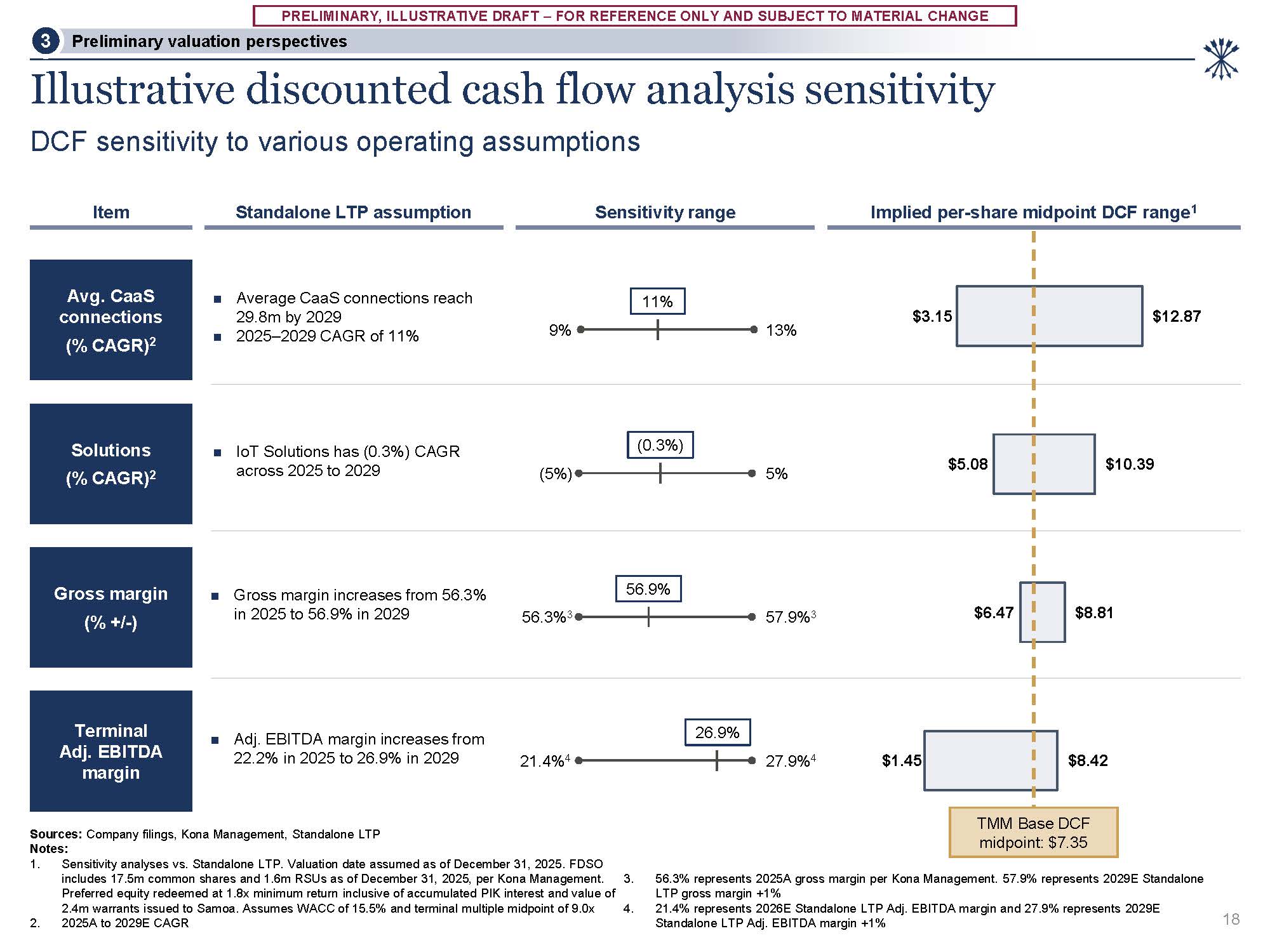 PRELIMINARY, ILLUSTRATIVE DRAFT – FOR REFERENCE ONLY AND SUBJECT TO MATERIAL CHANGE  Illustrative discounted cash flow analysis sensitivity  DCF sensitivity to various operating assumptions  Implied per-share midpoint DCF range1  Standalone LTP assumption  Item  Sources: Company filings, Kona Management, Standalone LTP  Notes:  1. Sensitivity analyses vs. Standalone LTP. Valuation date assumed as of December 31, 2025. FDSO includes 17.5m common shares and 1.6m RSUs as of December 31, 2025, per Kona Management. Preferred equity redeemed at 1.8x minimum return inclusive of accumulated PIK interest and value of  2.4m warrants issued to Samoa. Assumes WACC of 15.5% and terminal multiple midpoint of 9.0x  2. 2025A to 2029E CAGR  56.3% represents 2025A gross margin per Kona Management. 57.9% represents 2029E Standalone LTP gross margin +1%  21.4% represents 2026E Standalone LTP Adj. EBITDA margin and 27.9% represents 2029E Standalone LTP Adj. EBITDA margin +1%  Sensitivity range  Avg. CaaS connections  (% CAGR)2  Average CaaS connections reach  29.8m by 2029  2025–2029 CAGR of 11%  9%  13%  11%  Solutions (% CAGR)2  IoT Solutions has (0.3%) CAGR across 2025 to 2029  (5%)  5%  (0.3%)  Gross margin (% +/-)  Gross margin increases from 56.3% in 2025 to 56.9% in 2029  56.3%3  57.9%3  56.9%  Adj. EBITDA margin increases from 22.2% in 2025 to 26.9% in 2029  Terminal Adj. EBITDA  margin  21.4%4  27.9%4  26.9%  18  Preliminary valuation perspectives  3  $3.15  $5.08  $6.47  $1.45  $12.87  $10.39  $8.81  $8.42  TMM Base DCF midpoint: $7.35