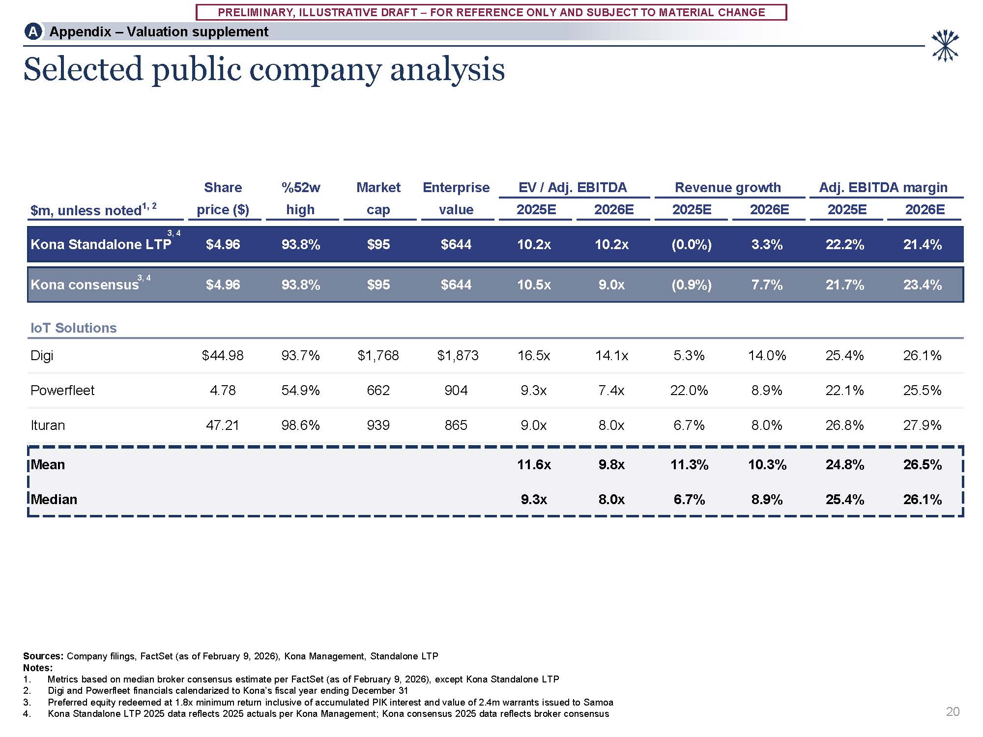 PRELIMINARY, ILLUSTRATIVE DRAFT – FOR REFERENCE ONLY AND SUBJECT TO MATERIAL CHANGE  3, 4  Kona Standalone LTP  $4.96  93.8%  $95  $644  10.2x  10.2x  (0.0%)  3.3%  22.2%  21.4%  3, 4  Kona consensus  $4.96  93.8%  $95  $644  10.5x  9.0x  (0.9%)  7.7%  21.7%  23.4%  IoT Solutions  Digi  $44.98  93.7%  $1,768  $1,873  16.5x  14.1x  5.3%  14.0%  25.4%  26.1%  Powerfleet  4.78  54.9%  662  904  9.3x  7.4x  22.0%  8.9%  22.1%  25.5%  Ituran  47.21  98.6%  939  865  9.0x  8.0x  6.7%  8.0%  26.8%  27.9%  Mean  11.6x  9.8x  11.3%  10.3%  24.8%  26.5%  Median  9.3x  8.0x  6.7%  8.9%  25.4%  26.1%  Share  %52w  Market  Enterprise  EV / Adj. EBITDA  Revenue growth  Adj. EBITDA margin  $m, unless noted1, 2  price ($)  high  cap  value  2025E 2026E  2025E 2026E  2025E 2026E  Selected public company analysis  Sources: Company filings, FactSet (as of February 9, 2026), Kona Management, Standalone LTP  Notes:  Metrics based on median broker consensus estimate per FactSet (as of February 9, 2026), except Kona Standalone LTP  Digi and Powerfleet financials calendarized to Kona’s fiscal year ending December 31  Preferred equity redeemed at 1.8x minimum return inclusive of accumulated PIK interest and value of 2.4m warrants issued to Samoa  Kona Standalone LTP 2025 data reflects 2025 actuals per Kona Management; Kona consensus 2025 data reflects broker consensus  20  A Appendix – Valuation supplement