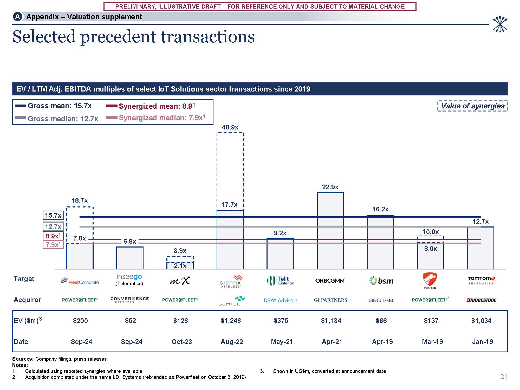 PRELIMINARY, ILLUSTRATIVE DRAFT – FOR REFERENCE ONLY AND SUBJECT TO MATERIAL CHANGE  A Appendix – Valuation supplement  Target  Acquiror  EV ($m)3  $200  $52  $126  $1,246  $375  $1,134  $86  $137  $1,034  Date  Sep-24  Sep-24  Oct-23  Aug-22  May-21  Apr-21  Apr-19  Mar-19  Jan-19  7.8x  2.1x  17.7x  8.0x  18.7x  6.8x  3.9x  40.9x  9.2x  22.9x  16.2x  10.0x  12.7x  Selected precedent transactions  Sources: Company filings, press releases  Notes:  Calculated using reported synergies where available  Acquisition completed under the name I.D. Systems (rebranded as Powerfleet on October 3, 2019)  3. Shown in US$m, converted at announcement date  EV / LTM Adj. EBITDA multiples of select IoT Solutions sector transactions since 2019  (Telematics)  2  Value of synergies  15.7x  12.7x  8.9x1  7.9x1  Gross mean: 15.7x Gross median: 12.7x  Synergized mean: 8.91 Synergized median: 7.9x1  21