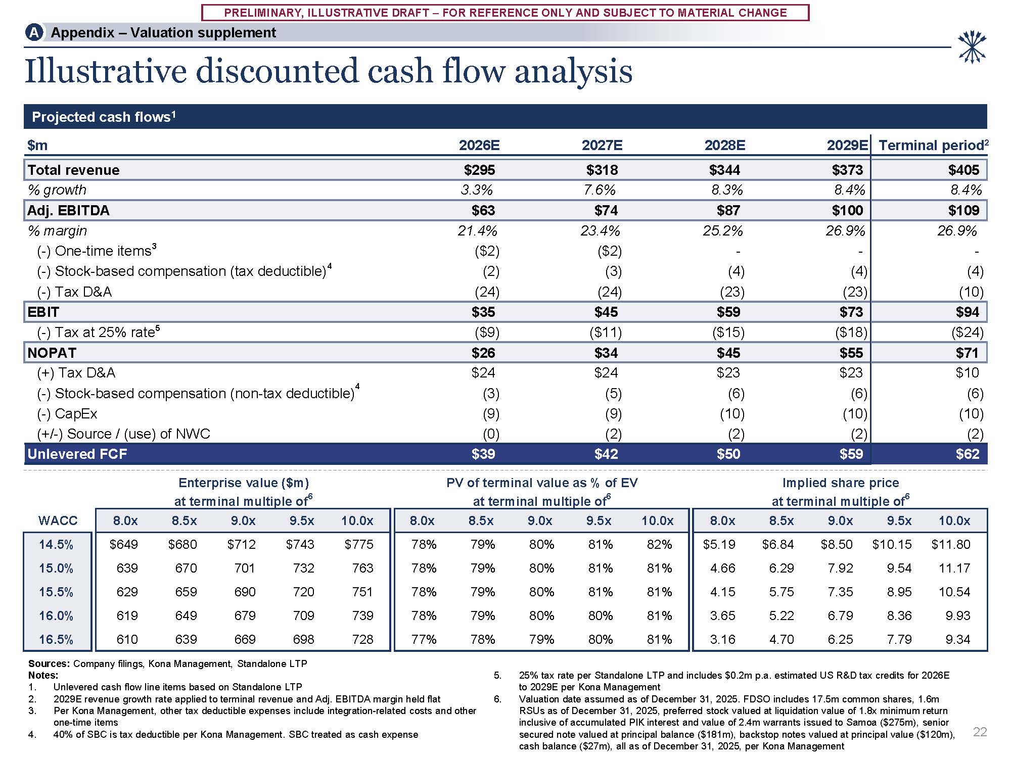 PRELIMINARY, ILLUSTRATIVE DRAFT – FOR REFERENCE ONLY AND SUBJECT TO MATERIAL CHANGE  A Appendix – Valuation supplement  Illustrative discounted cash flow analysis  Projected cash flows1  $m  2026E  2027E  2028E  2029E  Terminal period2  Total revenue  $295  $318  $344  $373  $405  % growth  3.3%  7.6%  8.3%  8.4%  8.4%  Adj. EBITDA  $63  $74  $87  $100  $109  % margin  21.4%  23.4%  25.2%  26.9%  26.9%  (-) One-time items3  ($2)  ($2)  -  -  -  (-) Stock-based compensation (tax deductible)4  (2)  (3)  (4)  (4)  (4)  (-) Tax D&A  (24)  (24)  (23)  (23)  (10)  EBIT  $35  $45  $59  $73  $94  (-) Tax at 25% rate5  ($9)  ($11)  ($15)  ($18)  ($24)  NOPAT  $26  $34  $45  $55  $71  (+) Tax D&A  $24  $24  $23  $23  $10  (-) Stock-based compensation (non-tax deductible)4  (3)  (5)  (6)  (6)  (6)  (-) CapEx  (9)  (9)  (10)  (10)  (10)  (+/-) Source / (use) of NWC  (0)  (2)  (2)  (2)  (2)  Unlevered FCF  $39  $42  $50  $59  $62  Sources: Company filings, Kona Management, Standalone LTP  Notes:  Unlevered cash flow line items based on Standalone LTP  2029E revenue growth rate applied to terminal revenue and Adj. EBITDA margin held flat  Per Kona Management, other tax deductible expenses include integration-related costs and other one-time items  40% of SBC is tax deductible per Kona Management. SBC treated as cash expense  25% tax rate per Standalone LTP and includes $0.2m p.a. estimated US R&D tax credits for 2026E to 2029E per Kona Management  Valuation date assumed as of December 31, 2025. FDSO includes 17.5m common shares, 1.6m RSUs as of December 31, 2025, preferred stock valued at liquidation value of 1.8x minimum return inclusive of accumulated PIK interest and value of 2.4m warrants issued to Samoa ($275m), senior secured note valued at principal balance ($181m), backstop notes valued at principal value ($120m), cash balance ($27m), all as of December 31, 2025, per Kona Management  Enterprise value ($m)  PV of terminal value as % of EV  Implied share price  at terminal multiple of6  at terminal multiple of6  at terminal multiple of6  22  WACC  8.0x  8.5x  9.0x  9.5x  10.0x  8.0x  8.5x  9.0x  9.5x  10.0x  8.0x  8.5x  9.0x  9.5x  10.0x  14.5%  $649  $680  $712  $743  $775  78%  79%  80%  81%  82%  $5.19  $6.84  $8.50  $10.15  $11.80  15.0%  639  670  701  732  763  78%  79%  80%  81%  81%  4.66  6.29  7.92  9.54  11.17  15.5%  629  659  690  720  751  78%  79%  80%  81%  81%  4.15  5.75  7.35  8.95  10.54  16.0%  619  649  679  709  739  78%  79%  80%  80%  81%  3.65  5.22  6.79  8.36  9.93  16.5%  610  639  669  698  728  77%  78%  79%  80%  81%  3.16  4.70  6.25  7.79  9.34