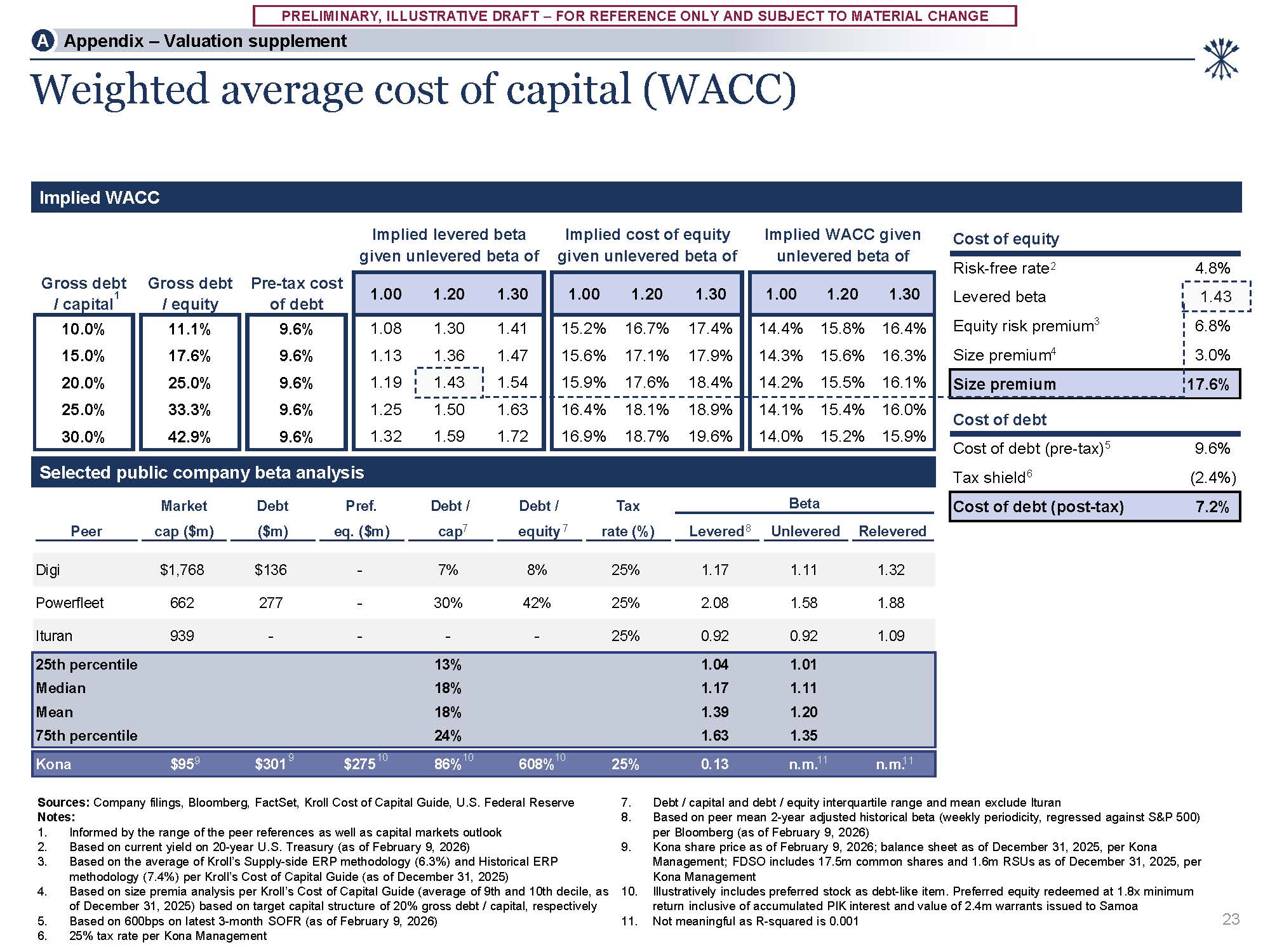PRELIMINARY, ILLUSTRATIVE DRAFT – FOR REFERENCE ONLY AND SUBJECT TO MATERIAL CHANGE  Risk-free rate2  4.8%  Levered beta  1.43  Equity risk premium3  6.8%  Size premium4  3.0%  Size premium  17.6%  Cost of debt  Cost of debt (pre-tax)5  9.6%  Tax shield6  (2.4%)  Cost of equity  Ituran  939  -  -  -  -  25%  0.92  0.92  1.09  25th percentile  13%  1.04  1.01  Median  18%  1.17  1.11  Mean  18%  1.39  1.20  75th percentile  24%  1.63  1.35  Kona  $959  $301 9  $27510  86%10  608%10  25%  0.13  n.m.11  n.m.11  23  Weighted average cost of capital (WACC)  Sources: Company filings, Bloomberg, FactSet, Kroll Cost of Capital Guide, U.S. Federal Reserve  Notes:  Informed by the range of the peer references as well as capital markets outlook  Based on current yield on 20-year U.S. Treasury (as of February 9, 2026)  Based on the average of Kroll’s Supply-side ERP methodology (6.3%) and Historical ERP  methodology (7.4%) per Kroll’s Cost of Capital Guide (as of December 31, 2025)  Based on size premia analysis per Kroll’s Cost of Capital Guide (average of 9th and 10th decile, as  of December 31, 2025) based on target capital structure of 20% gross debt / capital, respectively  Based on 600bps on latest 3-month SOFR (as of February 9, 2026)  25% tax rate per Kona Management  Debt / capital and debt / equity interquartile range and mean exclude Ituran  Based on peer mean 2-year adjusted historical beta (weekly periodicity, regressed against S&P 500) per Bloomberg (as of February 9, 2026)  Kona share price as of February 9, 2026; balance sheet as of December 31, 2025, per Kona Management; FDSO includes 17.5m common shares and 1.6m RSUs as of December 31, 2025, per Kona Management   Illustratively includes preferred stock as debt-like item. Preferred equity redeemed at 1.8x minimum return inclusive of accumulated PIK interest and value of 2.4m warrants issued to Samoa  Not meaningful as R-squared is 0.001  Implied WACC  Selected public company beta analysis  Gross debt  / capital1  Gross debt  / equity  Pre-tax cost  of debt  1.00  1.20  1.30  1.00  1.20  1.30  1.00  1.20  1.30  10.0%  11.1%  9.6%  1.08  1.30  1.41  15.2%  16.7%  17.4%  14.4%  15.8%  16.4%  15.0%  17.6%  9.6%  1.13  1.36  1.47  15.6%  17.1%  17.9%  14.3%  15.6%  16.3%  20.0%  25.0%  9.6%  1.19  1.43  1.54  15.9%  17.6%  18.4%  14.2%  15.5%  16.1%  25.0%  33.3%  9.6%  1.25  1.50  1.63  16.4%  18.1%  18.9%  14.1%  15.4%  16.0%  30.0%  42.9%  9.6%  1.32  1.59  1.72  16.9%  18.7%  19.6%  14.0%  15.2%  15.9%  Market  Debt  Pref.  Debt /  Debt /  Tax   Beta   Cost of debt (post-tax) 7.2%  Peer cap ($m)  ($m)  eq. ($m)  cap7  equity 7  rate (%)  Levered8 Unlevered Relevered  Digi $1,768  $136  -  7%  8%  25%  1.17 1.11 1.32  Powerfleet 662  277  -  30%  42%  25%  2.08 1.58 1.88  A Appendix – Valuation supplement  Implied levered beta given unlevered beta of  Implied cost of equity given unlevered beta of  Implied WACC given unlevered beta of
