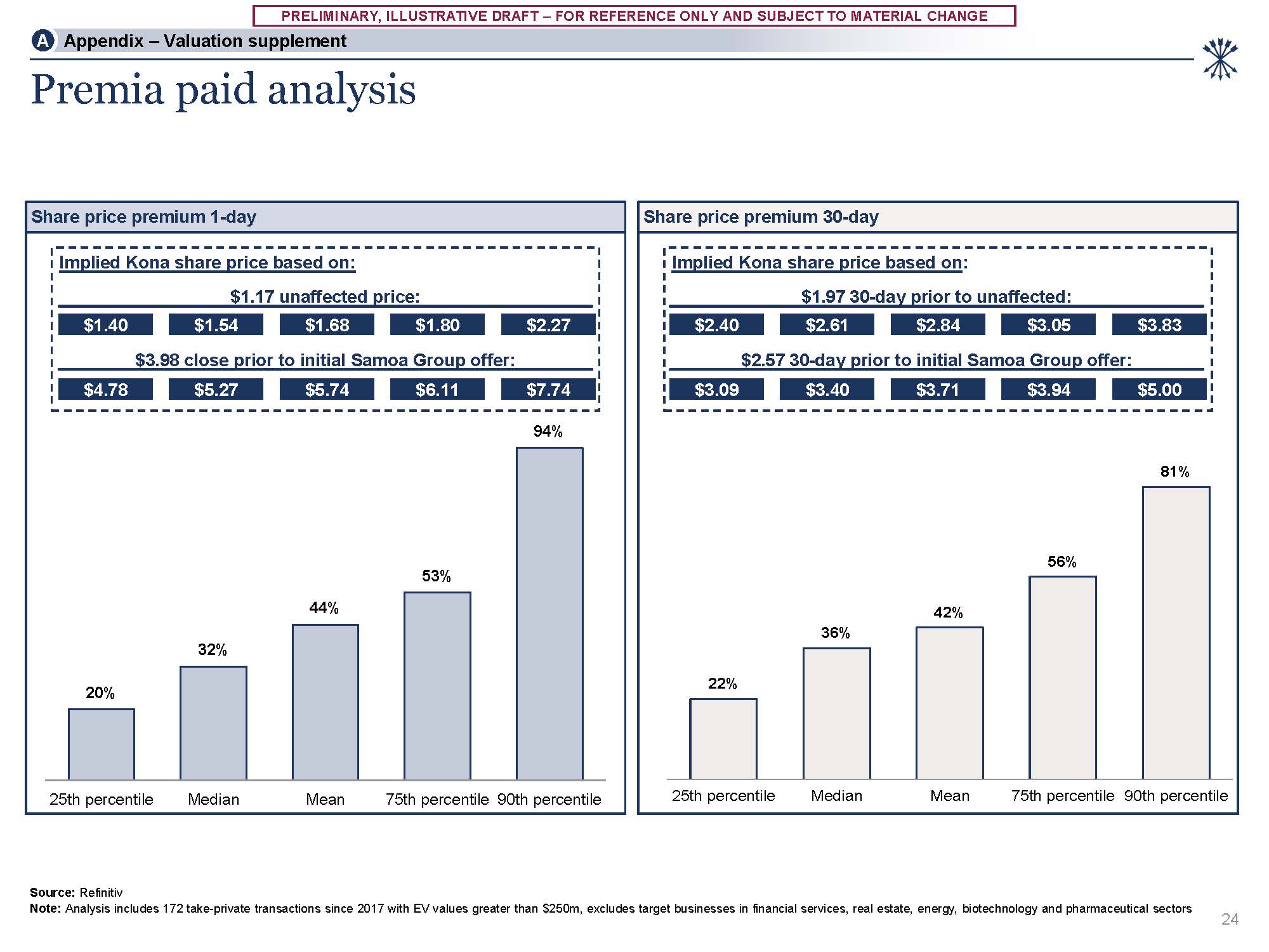 PRELIMINARY, ILLUSTRATIVE DRAFT – FOR REFERENCE ONLY AND SUBJECT TO MATERIAL CHANGE  20%  32%  44%  53%  94%  25th percentile  Median  Mean  75th percentile 90th percentile  22%  36%  42%  56%  81%  25th percentile  Median  Mean  75th percentile 90th percentile  Premia paid analysis  Share price premium 30-day  Source: Refinitiv  Note: Analysis includes 172 take-private transactions since 2017 with EV values greater than $250m, excludes target businesses in financial services, real estate, energy, biotechnology and pharmaceutical sectors  24  A Appendix – Valuation supplement  $2.84  $2.61  $3.05  $3.71  $3.40  $3.94  Implied Kona share price based on:   $1.97 30-day prior to unaffected:   $2.40 $3.83   $2.57 30-day prior to initial Samoa Group offer:   $3.09 $5.00  $1.40  $1.68  $1.54  $1.80  $2.27  $4.78  $5.74  $5.27  $6.11  $7.74  Implied Kona share price based on:   $1.17 unaffected price:    $3.98 close prior to initial Samoa Group offer:   Share price premium 1-day