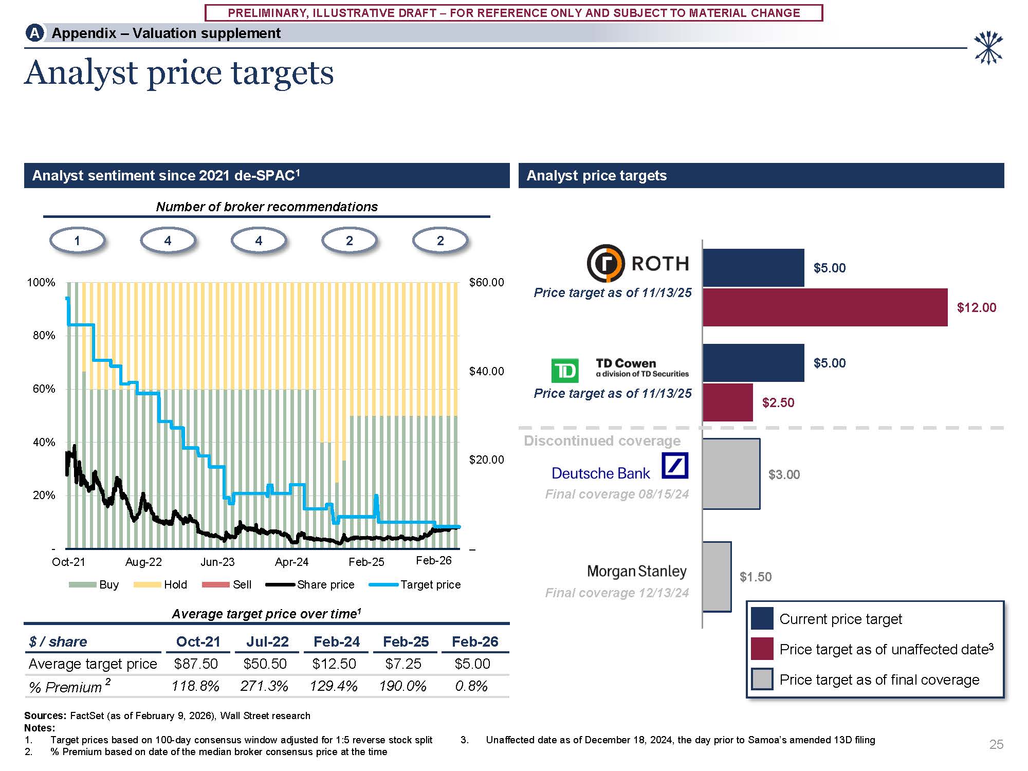 PRELIMINARY, ILLUSTRATIVE DRAFT – FOR REFERENCE ONLY AND SUBJECT TO MATERIAL CHANGE  –  $20.00  $40.00  $60.00  -  20%  40%  60%  80%  100%  Oct-21  Aug-22  Dec-25  Buy  Hold  Jun-23 Apr-24 Feb-25  Sell Share price  Target price  $5.00  $5.00  $12.00  $2.50  $3.00  $1.50  Discontinued coverage  Analyst price targets  Analyst sentiment since 2021 de-SPAC1  Analyst price targets  1  2  Number of broker recommendations  4 4 2  $ / share  Oct-21  Jul-22  Feb-24  Feb-25  Feb-26  Average target price  $87.50  $50.50  $12.50  $7.25  $5.00  % Premium 2  118.8%  271.3%  129.4%  190.0%  0.8%  Average target price over time1  Sources: FactSet (as of February 9, 2026), Wall Street research  Notes:  Target prices based on 100-day consensus window adjusted for 1:5 reverse stock split  % Premium based on date of the median broker consensus price at the time  3. Unaffected date as of December 18, 2024, the day prior to Samoa’s amended 13D filing  Price target as of 11/13/25  Price target as of 11/13/25  Final coverage 12/13/24  Final coverage 08/15/24  Current price target  Price target as of unaffected date3 Price target as of final coverage  25  A Appendix – Valuation supplement  Feb-26