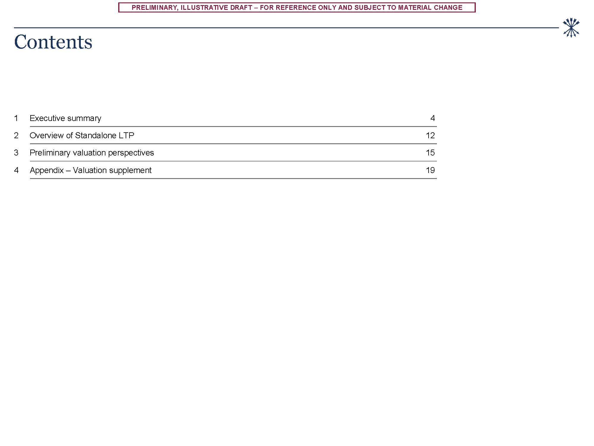 PRELIMINARY, ILLUSTRATIVE DRAFT – FOR REFERENCE ONLY AND SUBJECT TO MATERIAL CHANGE  Contents  Executive summary  Overview of Standalone LTP  Preliminary valuation perspectives  Appendix – Valuation supplement  4  12  15  19