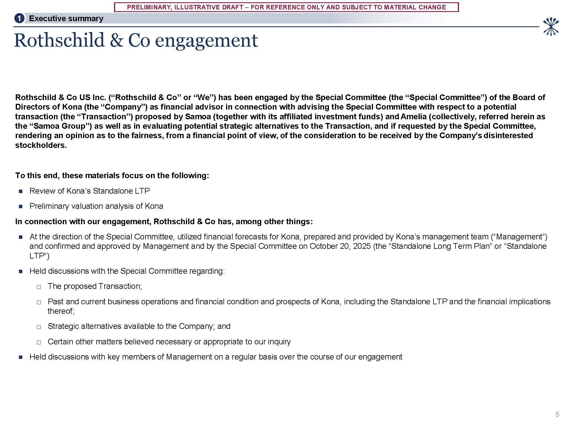 PRELIMINARY, ILLUSTRATIVE DRAFT – FOR REFERENCE ONLY AND SUBJECT TO MATERIAL CHANGE  Rothschild & Co engagement  5  Rothschild & Co US Inc. (“Rothschild & Co” or “We”) has been engaged by the Special Committee (the “Special Committee”) of the Board of Directors of Kona (the “Company”) as financial advisor in connection with advising the Special Committee with respect to a potential  transaction (the “Transaction”) proposed by Samoa (together with its affiliated investment funds) and Amelia (collectively, referred herein as the “Samoa Group”) as well as in evaluating potential strategic alternatives to the Transaction, and if requested by the Special Committee, rendering an opinion as to the fairness, from a financial point of view, of the consideration to be received by the Company’s disinterested stockholders.  To this end, these materials focus on the following:  Review of Kona’s Standalone LTP  Preliminary valuation analysis of Kona  In connection with our engagement, Rothschild & Co has, among other things:  At the direction of the Special Committee, utilized financial forecasts for Kona, prepared and provided by Kona’s management team (“Management”) and confirmed and approved by Management and by the Special Committee on October 20, 2025 (the “Standalone Long Term Plan” or “Standalone LTP”)  Held discussions with the Special Committee regarding:  The proposed Transaction;  Past and current business operations and financial condition and prospects of Kona, including the Standalone LTP and the financial implications  thereof;  Strategic alternatives available to the Company; and  Certain other matters believed necessary or appropriate to our inquiry  Held discussions with key members of Management on a regular basis over the course of our engagement  1.1SITEUxAeTcIOuNtiOvVeEsRuVmIEmWary
