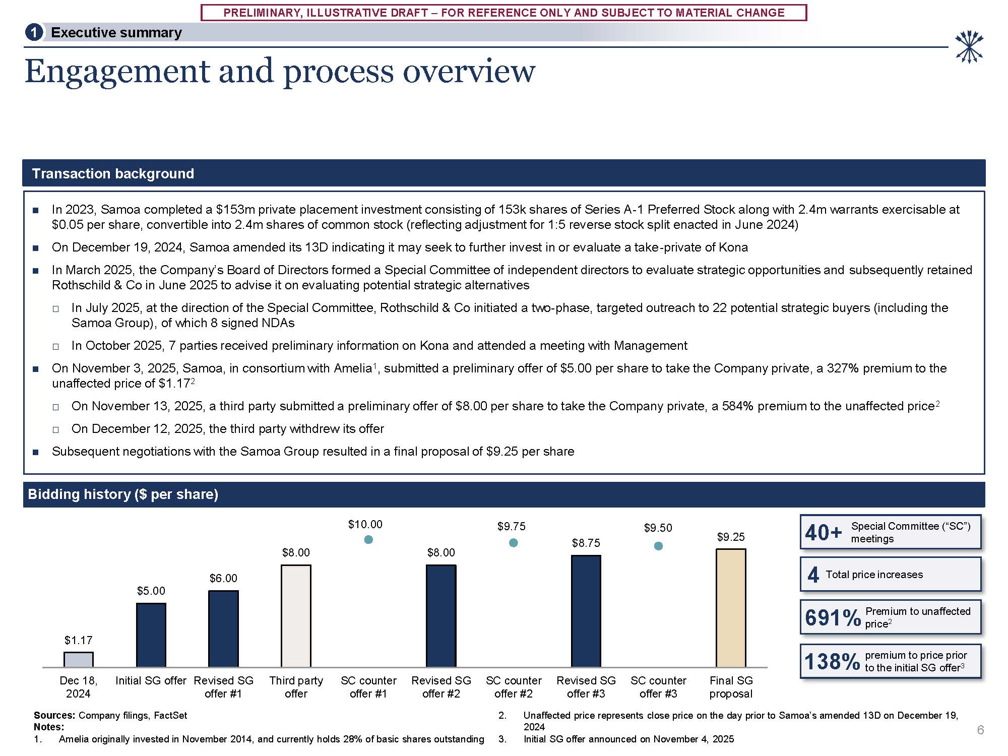 PRELIMINARY, ILLUSTRATIVE DRAFT – FOR REFERENCE ONLY AND SUBJECT TO MATERIAL CHANGE  In 2023, Samoa completed a $153m private placement investment consisting of 153k shares of Series A-1 Preferred Stock along with 2.4m warrants exercisable at  $0.05 per share, convertible into 2.4m shares of common stock (reflecting adjustment for 1:5 reverse stock split enacted in June 2024)  On December 19, 2024, Samoa amended its 13D indicating it may seek to further invest in or evaluate a take-private of Kona  In March 2025, the Company’s Board of Directors formed a Special Committee of independent directors to evaluate strategic opportunities and subsequently retained Rothschild & Co in June 2025 to advise it on evaluating potential strategic alternatives  In July 2025, at the direction of the Special Committee, Rothschild & Co initiated a two-phase, targeted outreach to 22 potential strategic buyers (including the Samoa Group), of which 8 signed NDAs  In October 2025, 7 parties received preliminary information on Kona and attended a meeting with Management  On November 3, 2025, Samoa, in consortium with Amelia1, submitted a preliminary offer of $5.00 per share to take the Company private, a 327% premium to the unaffected price of $1.172  On November 13, 2025, a third party submitted a preliminary offer of $8.00 per share to take the Company private, a 584% premium to the unaffected price2  On December 12, 2025, the third party withdrew its offer  Subsequent negotiations with the Samoa Group resulted in a final proposal of $9.25 per share  Engagement and process overview  Transaction background  Sources: Company filings, FactSet 2.  Notes:  1. Amelia originally invested in November 2014, and currently holds 28% of basic shares outstanding 3.  Unaffected price represents close price on the day prior to Samoa’s amended 13D on December 19,  2024  Initial SG offer announced on November 4, 2025  6  Special Committee (“SC”)  meetings  40+  Bidding history ($ per share)  4 Total price increases  Premium to unaffected price2  691%  1.1SITEUxAeTcIOuNtiOvVeEsRuVmIEmWary  $1.17  $5.00  $6.00  $8.00  $8.00  $8.75  $9.25  $10.00  $9.75  $9.50  Dec 18,  2024  Initial SG offer Revised SG Third party  offer #1 offer  SC counter  offer #1  Revised SG SC counter Revised SG  offer #2 offer #2 offer #3  SC counter  offer #3  Final SG  proposal  premium to price prior to the initial SG offer3  138%