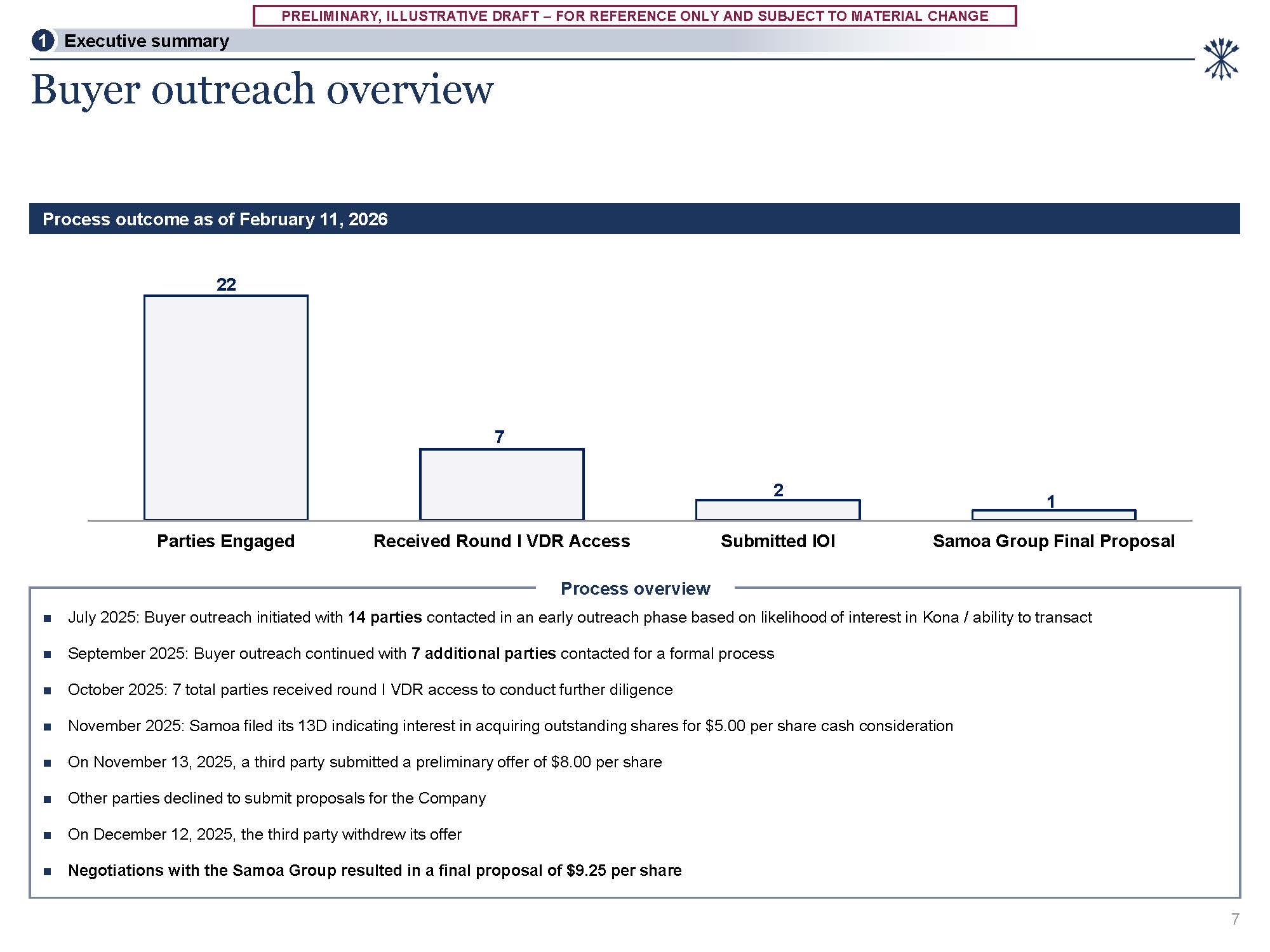 PRELIMINARY, ILLUSTRATIVE DRAFT – FOR REFERENCE ONLY AND SUBJECT TO MATERIAL CHANGE  22  7  2  1  Parties Engaged  Received Round I VDR Access  Submitted IOI  Samoa Group Final Proposal  1.1SITEUxAeTcIOuNtiOvVeEsRuVmIEmWary  Buyer outreach overview  7  Process overview  July 2025: Buyer outreach initiated with 14 parties contacted in an early outreach phase based on likelihood of interest in Kona / ability to transact  September 2025: Buyer outreach continued with 7 additional parties contacted for a formal process  October 2025: 7 total parties received round I VDR access to conduct further diligence  November 2025: Samoa filed its 13D indicating interest in acquiring outstanding shares for $5.00 per share cash consideration  On November 13, 2025, a third party submitted a preliminary offer of $8.00 per share  Other parties declined to submit proposals for the Company  On December 12, 2025, the third party withdrew its offer  Negotiations with the Samoa Group resulted in a final proposal of $9.25 per share  Process outcome as of February 11, 2026