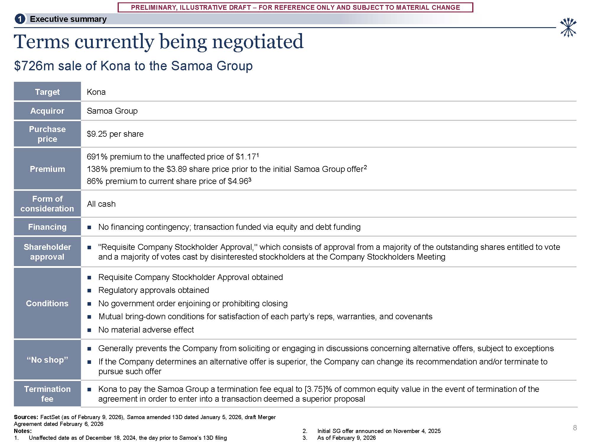 PRELIMINARY, ILLUSTRATIVE DRAFT – FOR REFERENCE ONLY AND SUBJECT TO MATERIAL CHANGE  Terms currently being negotiated  $726m sale of Kona to the Samoa Group  8  Sources: FactSet (as of February 9, 2026), Samoa amended 13D dated January 5, 2026, draft Merger Agreement dated February 6, 2026  Notes:  1. Unaffected date as of December 18, 2024, the day prior to Samoa’s 13D filing  Initial SG offer announced on November 4, 2025  As of February 9, 2026  1 Executive summary  Target  Kona  Acquiror  Samoa Group  Purchase price  $9.25 per share  Premium  691% premium to the unaffected price of $1.171  138% premium to the $3.89 share price prior to the initial Samoa Group offer2 86% premium to current share price of $4.963  Form of  consideration  All cash  Financing  No financing contingency; transaction funded via equity and debt funding  Shareholder approval  "Requisite Company Stockholder Approval," which consists of approval from a majority of the outstanding shares entitled to vote and a majority of votes cast by disinterested stockholders at the Company Stockholders Meeting  Conditions  Requisite Company Stockholder Approval obtained  Regulatory approvals obtained  No government order enjoining or prohibiting closing  Mutual bring-down conditions for satisfaction of each party’s reps, warranties, and covenants  No material adverse effect  “No shop”  Generally prevents the Company from soliciting or engaging in discussions concerning alternative offers, subject to exceptions  If the Company determines an alternative offer is superior, the Company can change its recommendation and/or terminate to  pursue such offer  Termination fee  Kona to pay the Samoa Group a termination fee equal to [3.75]% of common equity value in the event of termination of the agreement in order to enter into a transaction deemed a superior proposal