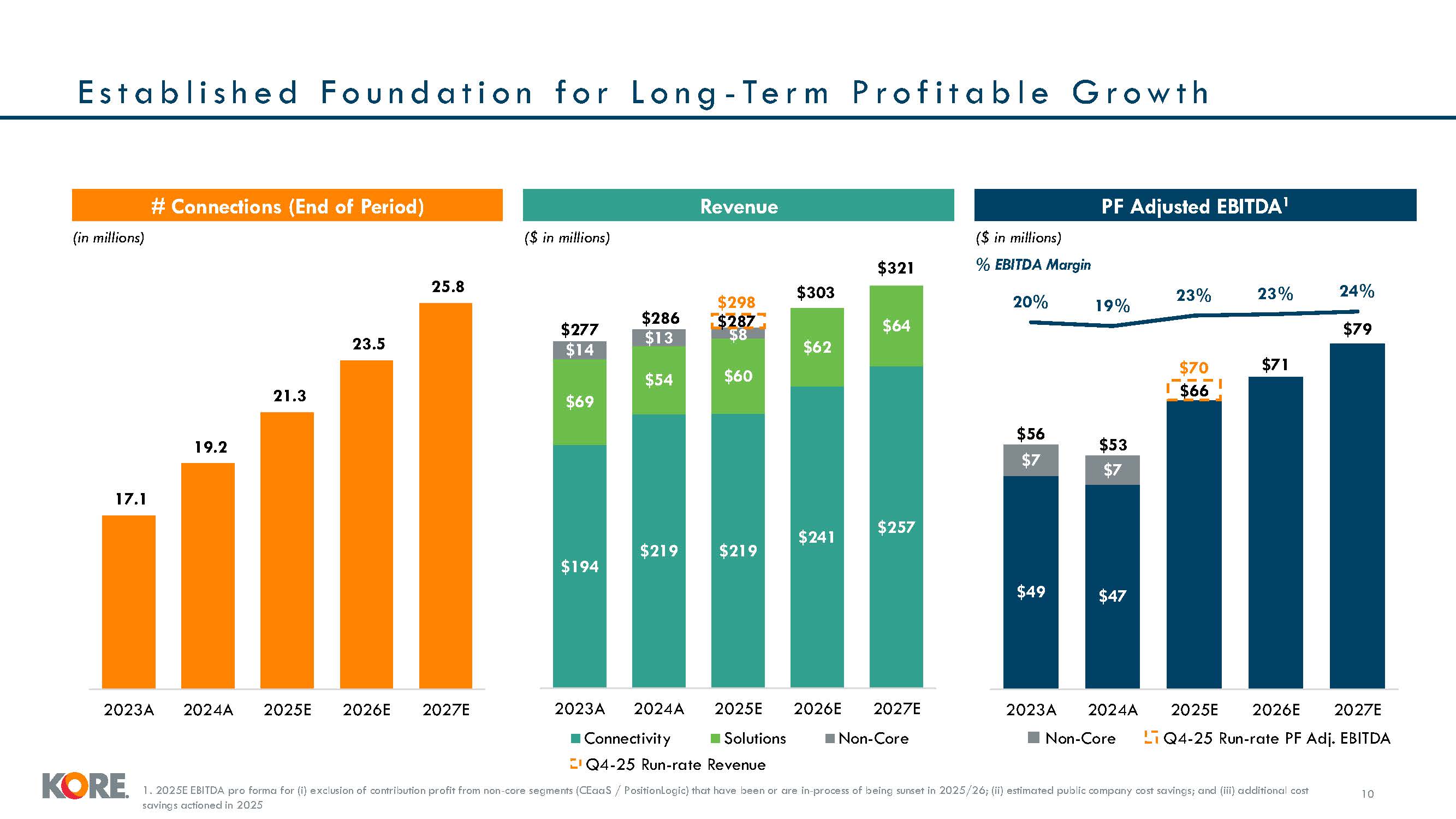$49  $47  $7  $7  20%  19%  $194  $219  $219  $241  $257  $69  $54  $60  $62  $64  $14  $13  $8  $277  $286  $287  $303  $321  2023A 2024A 2025E 2026E 2027E 2023A  2024A  Connectivity  23%  23%  24%  $79  $70  $71  $66  E s t a b l i s h e d F o u n d a t i o n f o r L o n g - Te r m P r o f i t a b l e G r o w t h  10  Revenue  PF Adjusted EBITDA1  # Connections (End of Period)  (in millions)  ($ in millions)  ($ in millions)  % EBITDA Margin  17.1  19.2  21.3  23.5  25.8  $298  $53  $56  2025E 2026E 2027E 2023A 2024A 2025E 2026E 2027E  Solutions Non-Core Non-Core Q4-25 Run-rate PF Adj. EBITDA  Q4-25 Run-rate Revenue  1. 2025E EBITDA pro forma for (i) exclusion of contribution profit from non-core segments (CEaaS / PositionLogic) that have been or are in-process of being sunset in 2025/26; (ii) estimated public company cost savings; and (iii) additional cost savings actioned in 2025