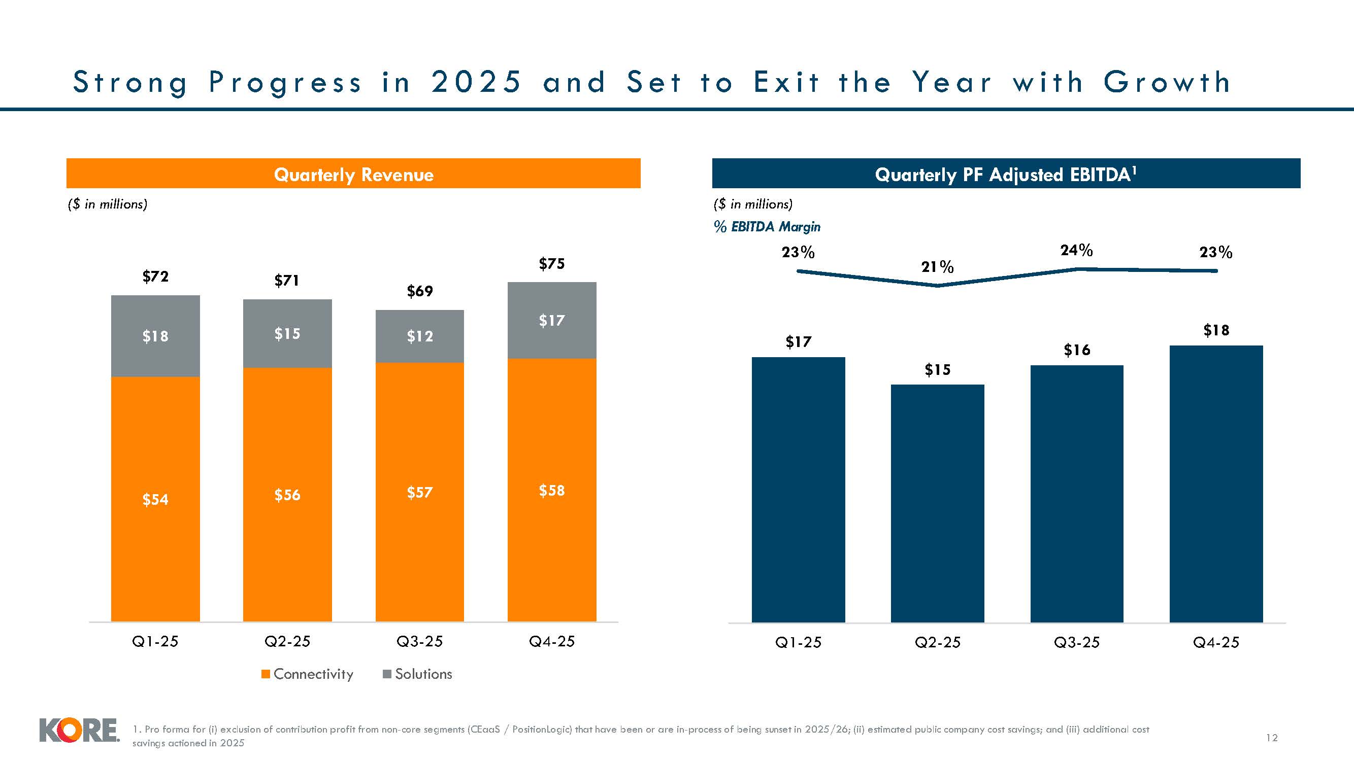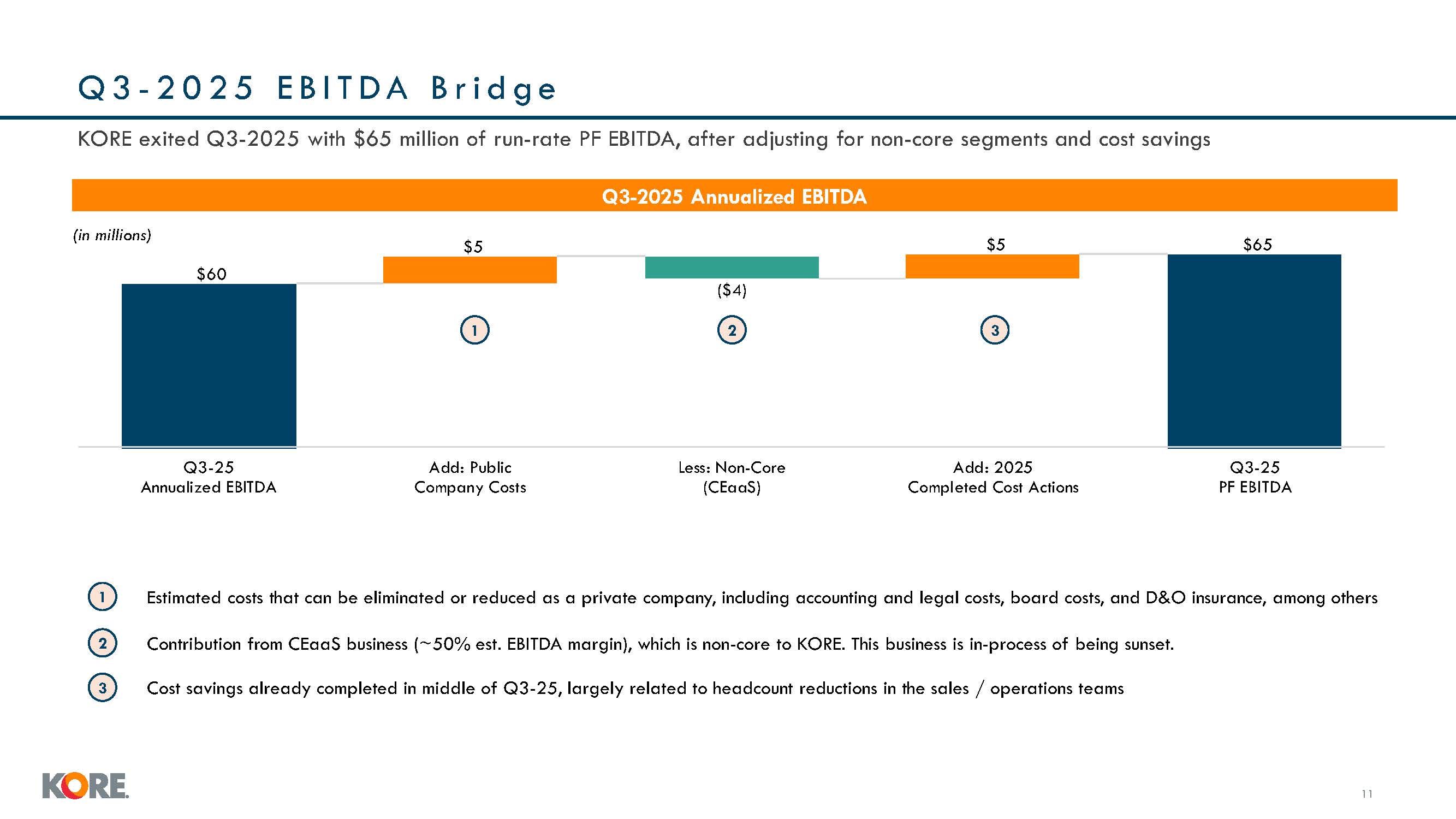 Q3-2025 Annualized EBITDA  Q3 - 2 0 2 5 E B I T D A B r i d g e  11  (in millions)  1  Estimated costs that can be eliminated or reduced as a private company, including accounting and legal costs, board costs, and D&O insurance, among others  1  2  3  2  3  Contribution from CEaaS business (~50% est. EBITDA margin), which is non-core to KORE. This business is in-process of being sunset.  KORE exited Q3-2025 with $65 million of run-rate PF EBITDA, after adjusting for non-core segments and cost savings  Cost savings already completed in middle of Q3-25, largely related to headcount reductions in the sales / operations teams     ( )      0      3 2   Annuali ed E ITDA  Add Public Company Costs  Less on Core (CEaaS)  Add 202   Completed Cost Actions   3 2 P E ITDA